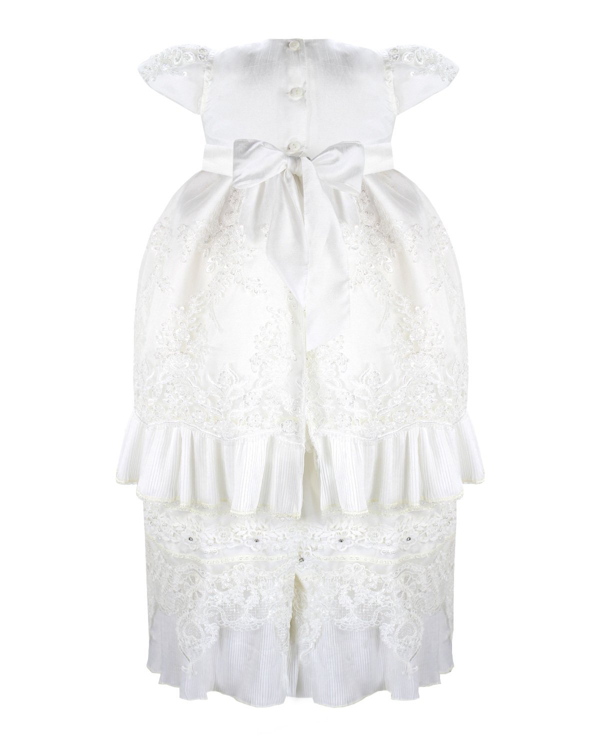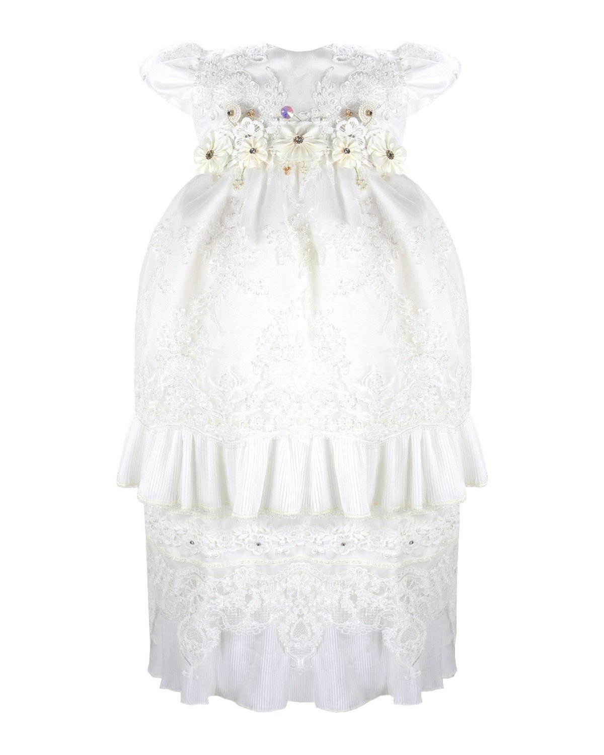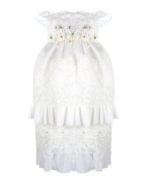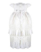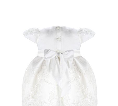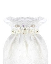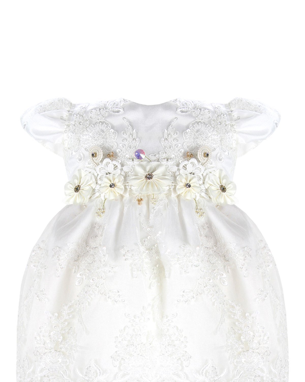 "The Venecia Girl's Gown by Maylin is an elegant and charming choice for any special occasion. Crafted from soft shantung, this gown features a beautifully adorned blouse with embroidery, short puffed sleeves for a sweet touch, and a stunning cluster of 3D flowers adorned with rhinestones and pearls. The skirt boasts light embroideries and an elegant ruffle at the end of each skirt. Complete with an adjustable bow at the back, this gown ensures a perfect fit and stunning style."