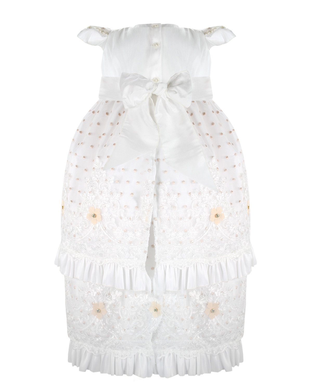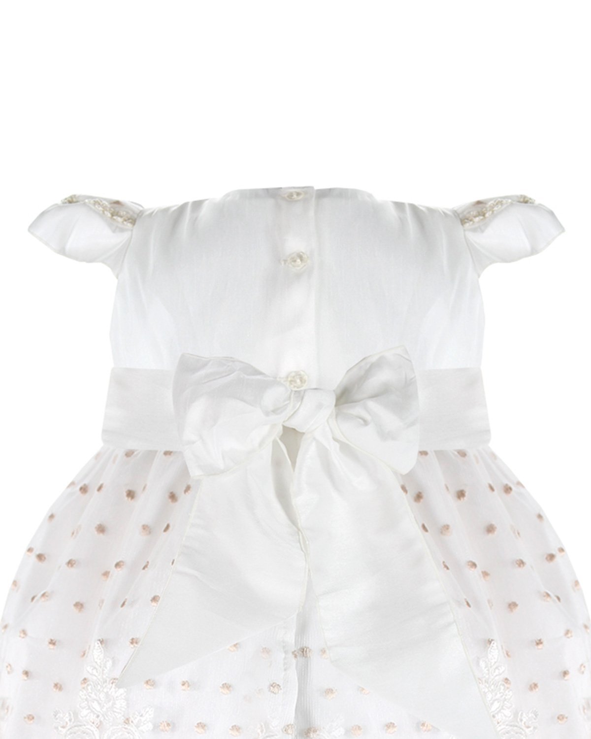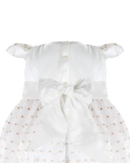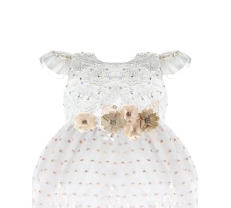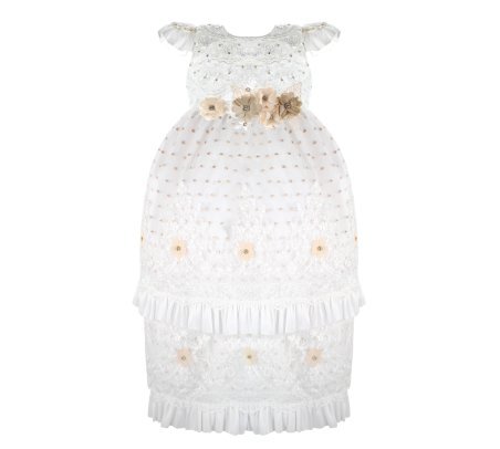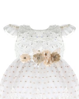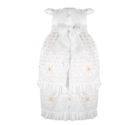 The Yessenia Model Girl's Christening Gown by Maylin combines the delicacy of shantung with the beauty of floral embroidery and dazzling 3D details. Perfect for special occasions, this ensemble offers elegance and charming style for the little ones.