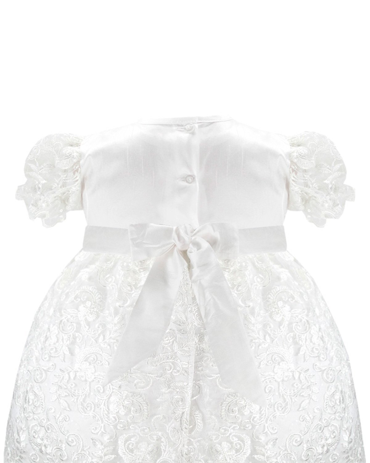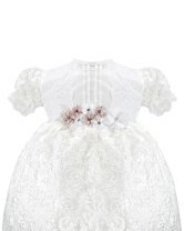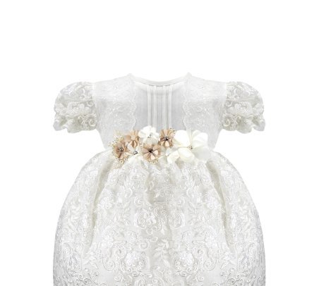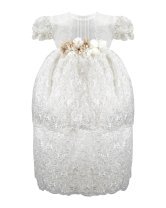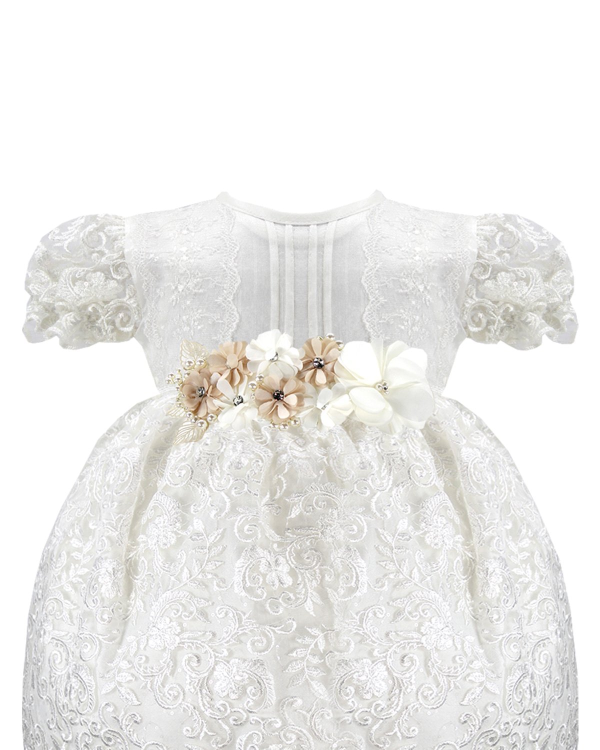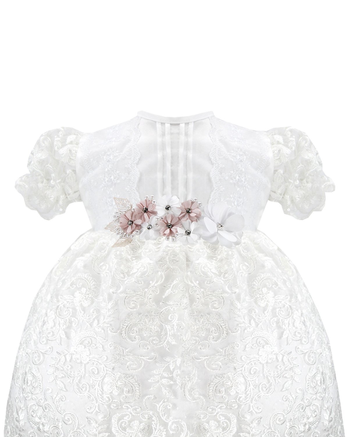 Girl's Christening Gown Model Mar, made from shantung with embroidery on the skirt and blouse, lace on the hems of the sleeves and skirt, blouse with embroidery and a center hem, and a sash with 3D flowers, rhinestones, and pearls at the waist.