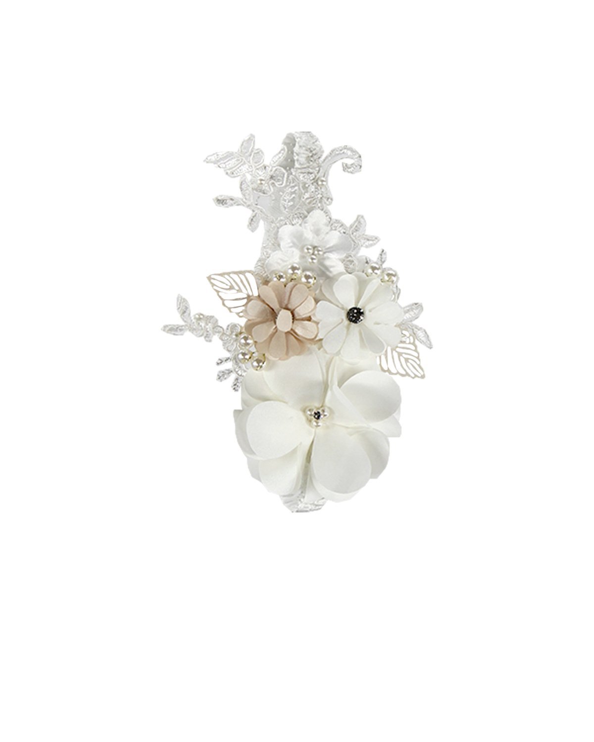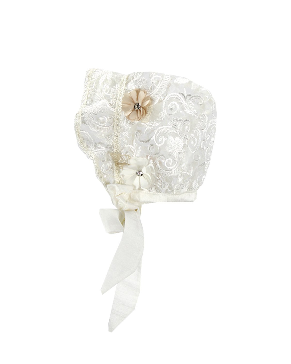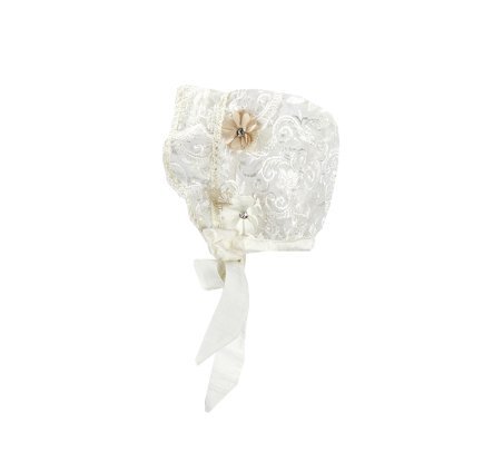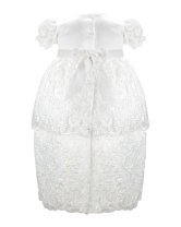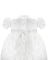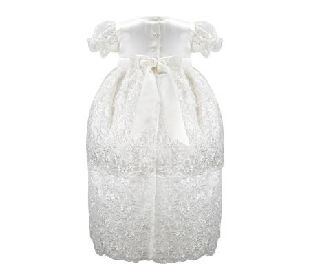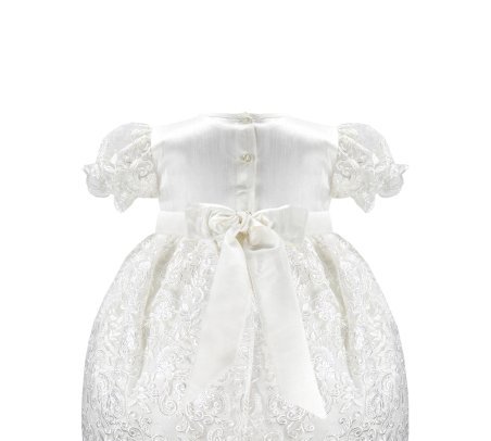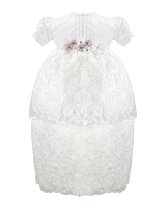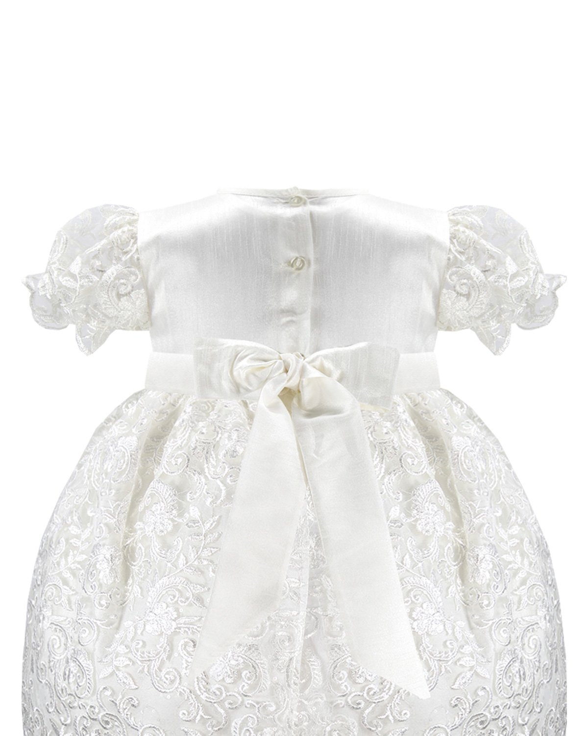 Girl's Christening Gown Model Mar, made from shantung with embroidery on the skirt and blouse, lace on the hems of the sleeves and skirt, blouse with embroidery and a center hem, and a sash with 3D flowers, rhinestones, and pearls at the waist.