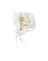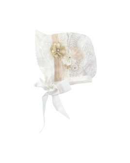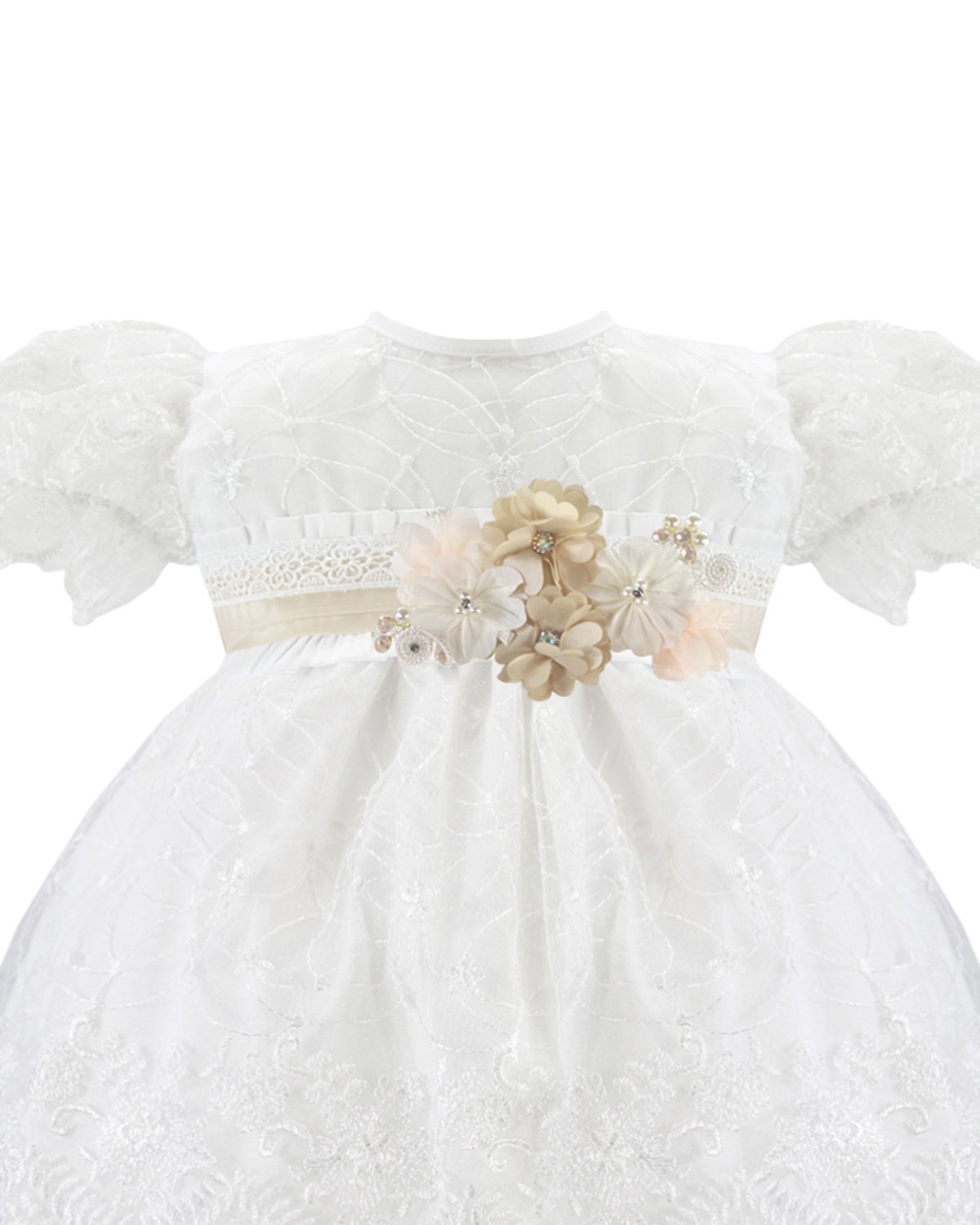 The Abryl Style Baptism Gown is made from shantung with delicate embroidery and a beautiful decoration of 3D flowers, beads, and pearls at the front waist. Perfect for baptisms and first communions.