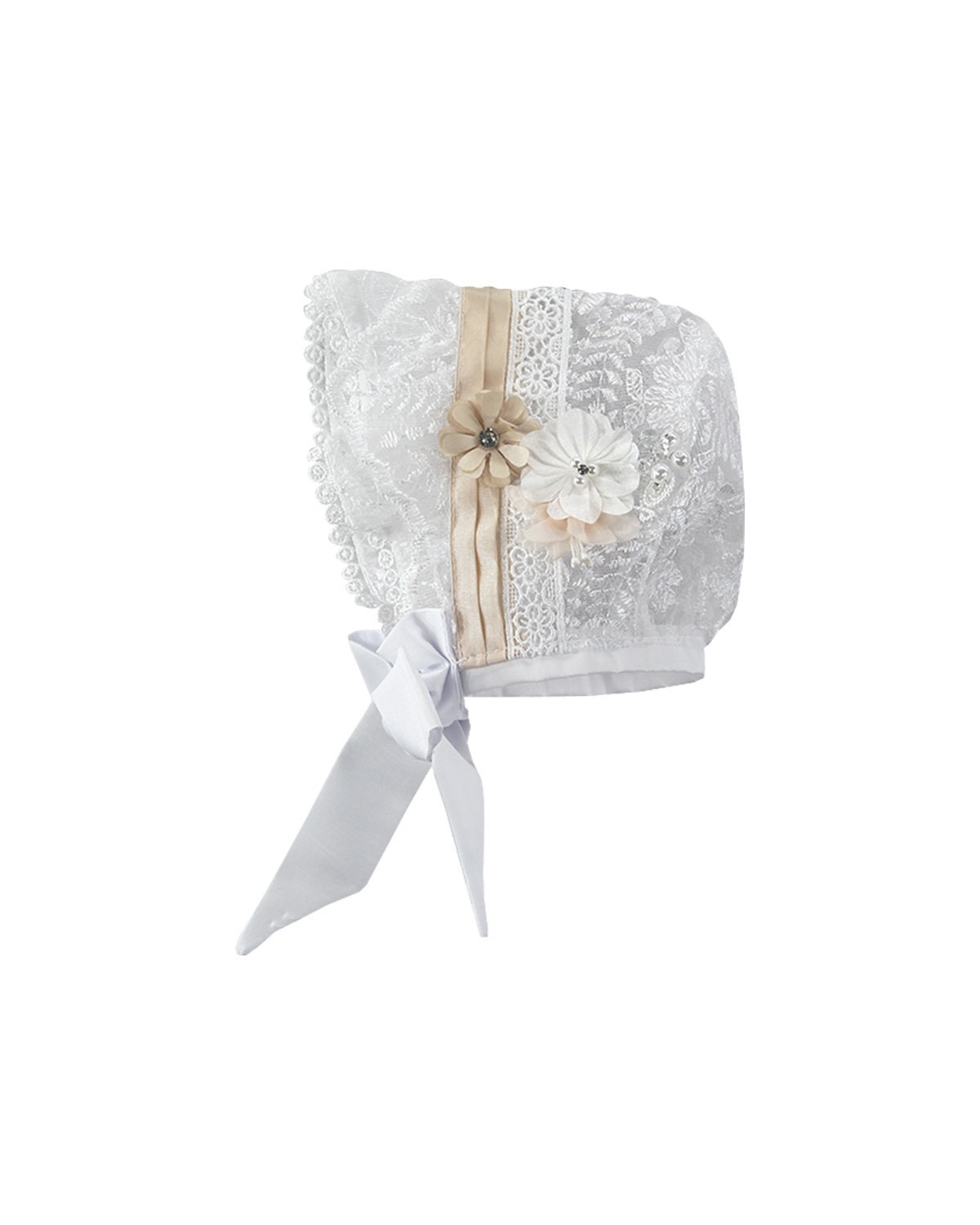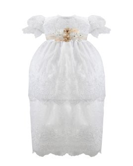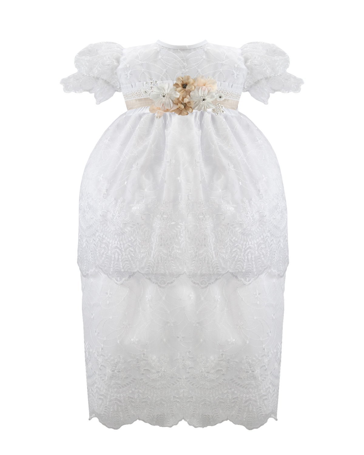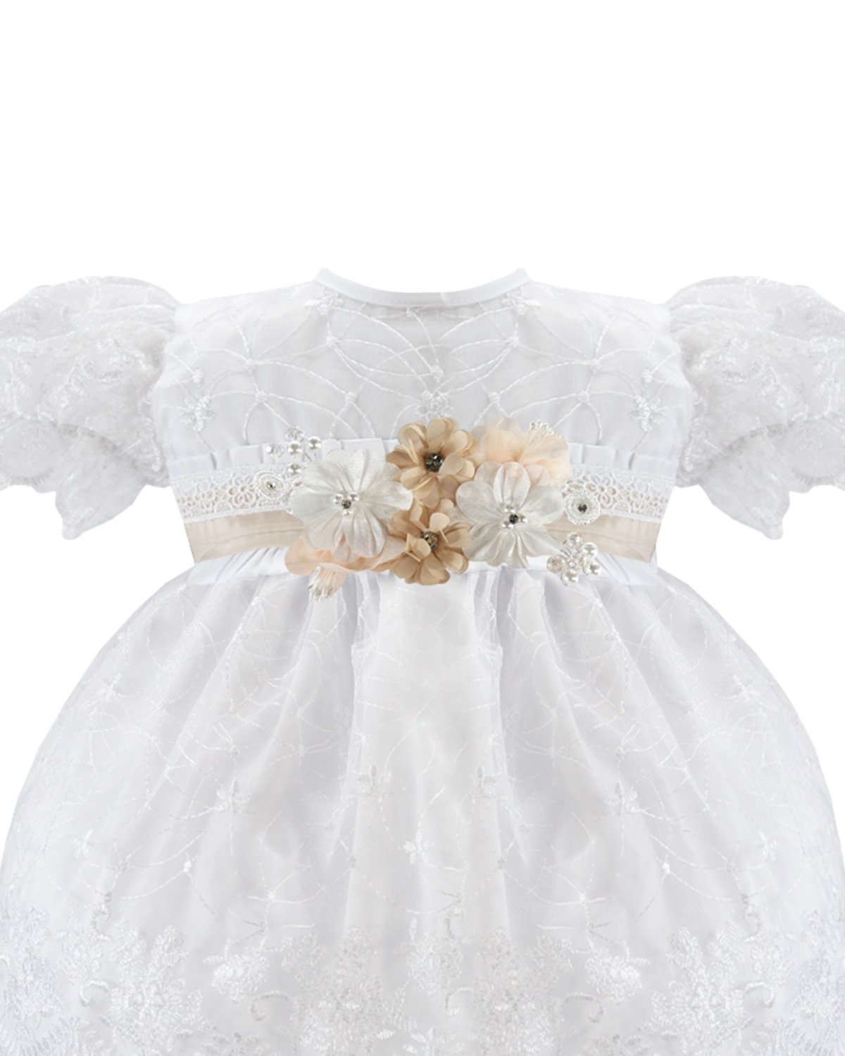 The Abryl Style Baptism Gown is made from shantung with delicate embroidery and a beautiful decoration of 3D flowers, beads, and pearls at the front waist. Perfect for baptisms and first communions.
