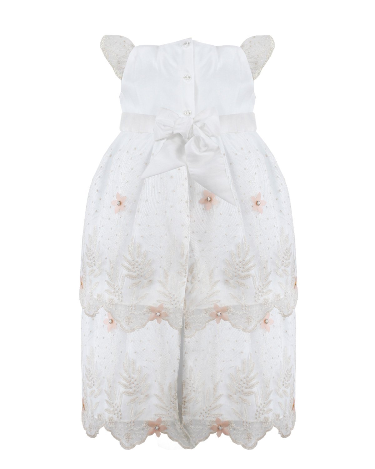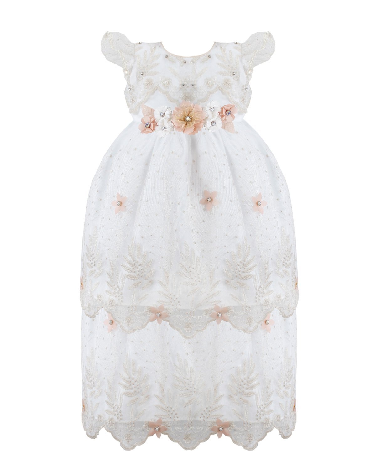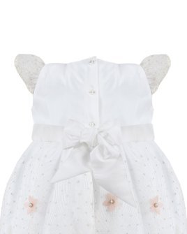Alaia Baptism Gown made of shantung with an embroidered tulle cape decorated with 3D flowers. Short-sleeve blouse with lace ruffles, front embroidery, and 3D floral decoration with crystals and pearls.