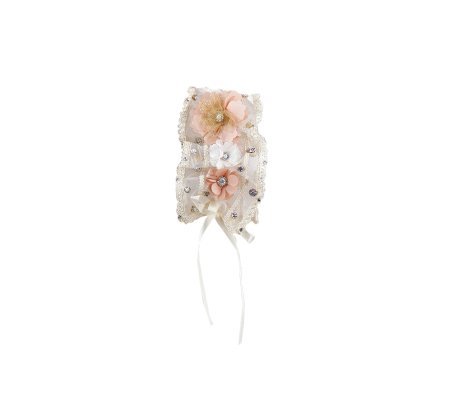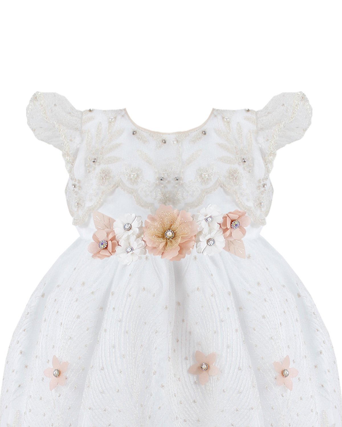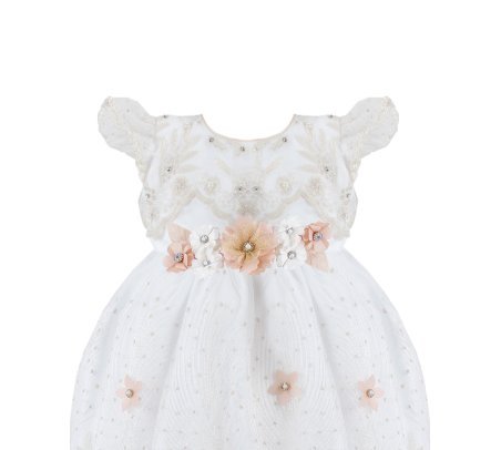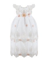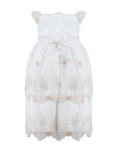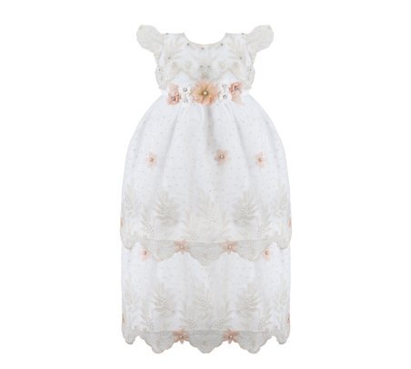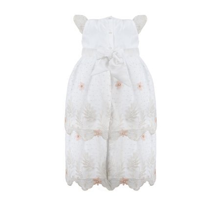 The Alaia Baptism Gown is made from high-quality shantung, featuring an embroidered tulle cape that adds a delicate and elegant touch. The cape is adorned with beautiful 3D flowers, enhancing its beauty. The short-sleeve blouse has lace ruffles on the edges, front embroidery, and an additional decoration of 3D flowers with crystals and pearls, creating a unique and sophisticated piece for the baptism.