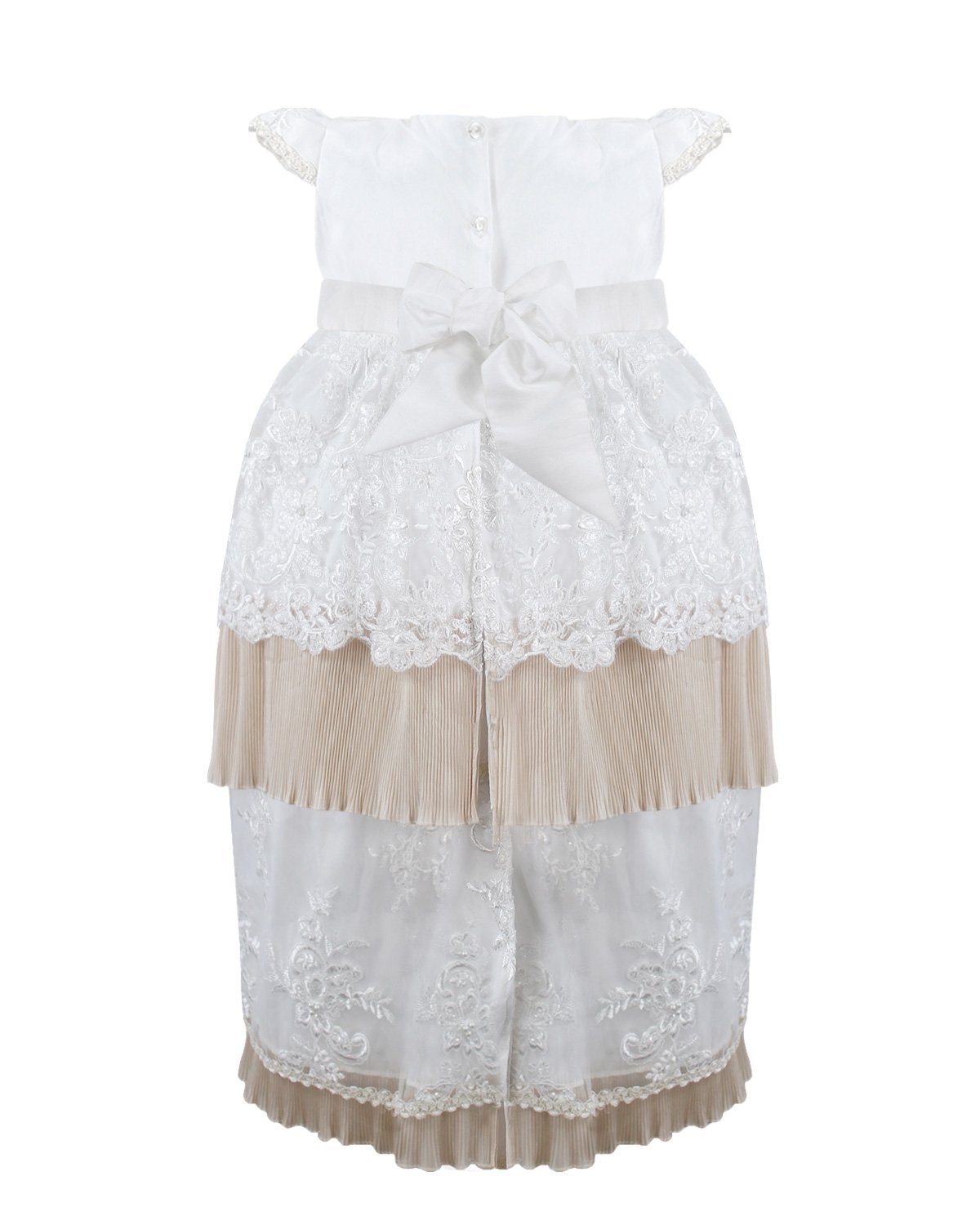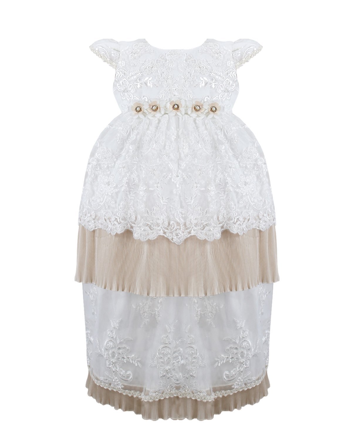 Baptism gown in shantung with embroidered tulle, ruffled hem, embroidered bodice, and 3D flower embellishment with rhinestones and pearls. Odeth model.