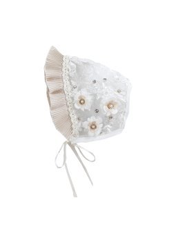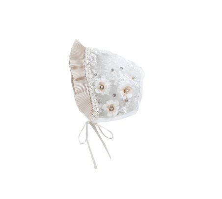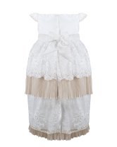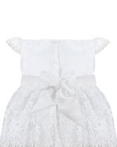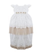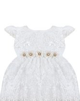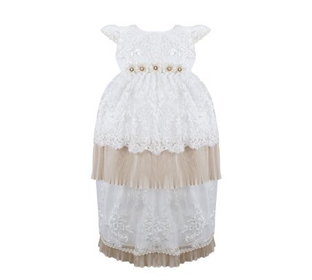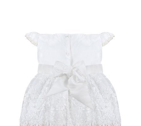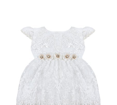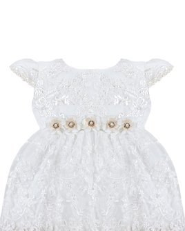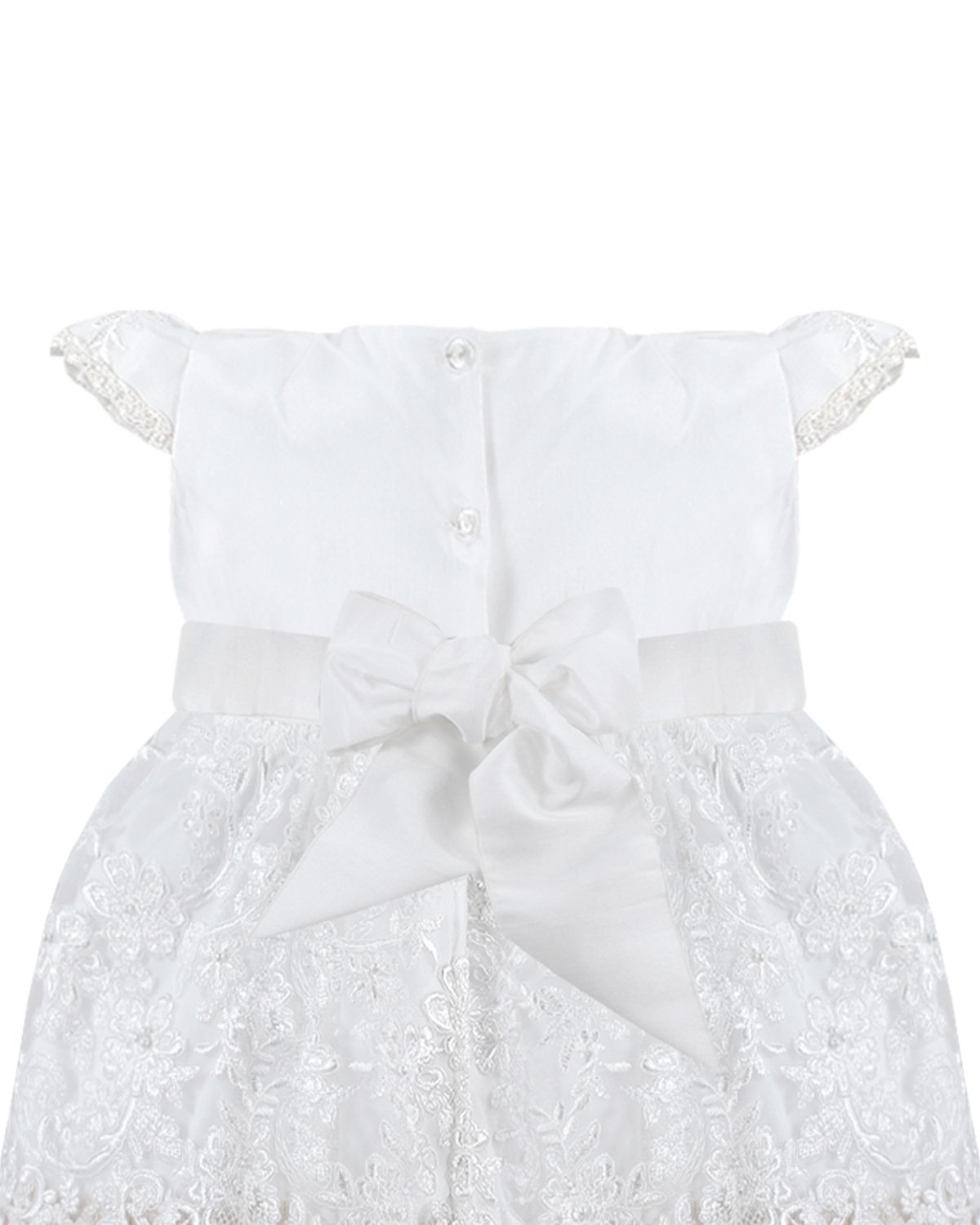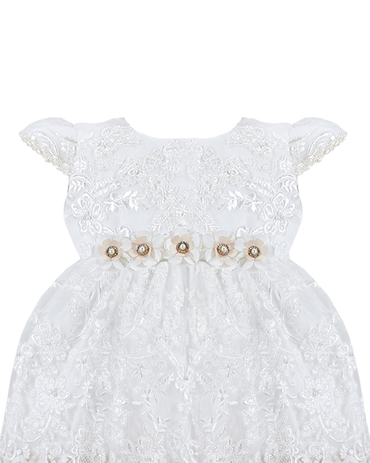 The Odeth Baptism Gown is made from luxurious shantung and overlaid with delicate embroidered tulle for an ethereal touch. The skirt is finished with ruffles that add graceful movement. The short-sleeved bodice features fine embroidery and a central decoration of 3D flowers with rhinestones and pearls—an elegant and sweet design.