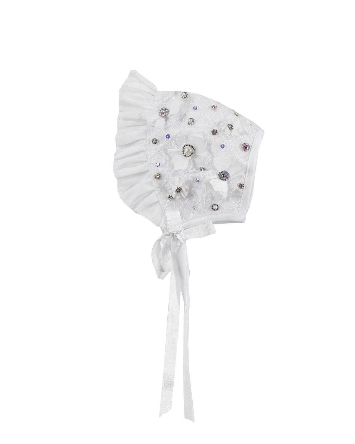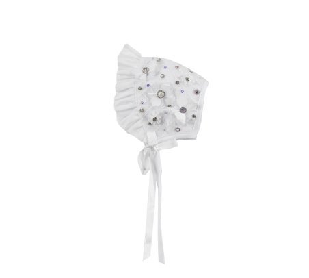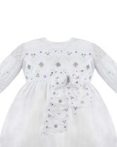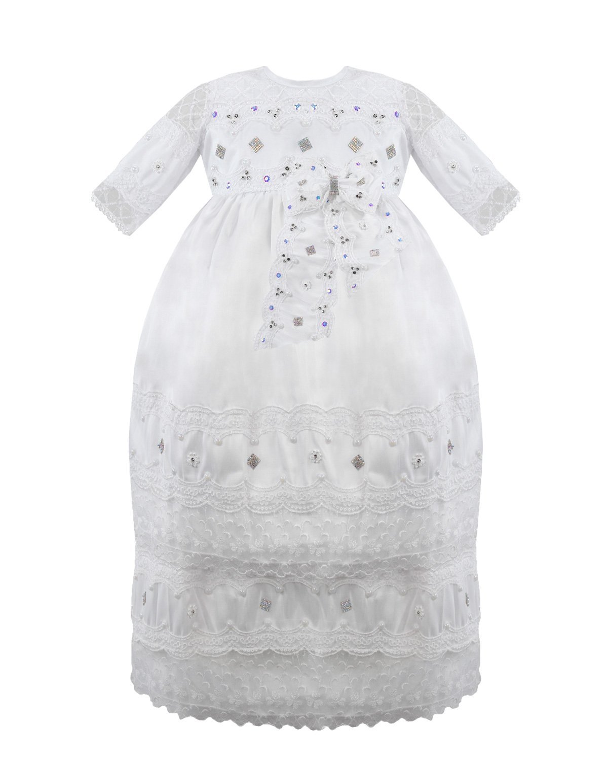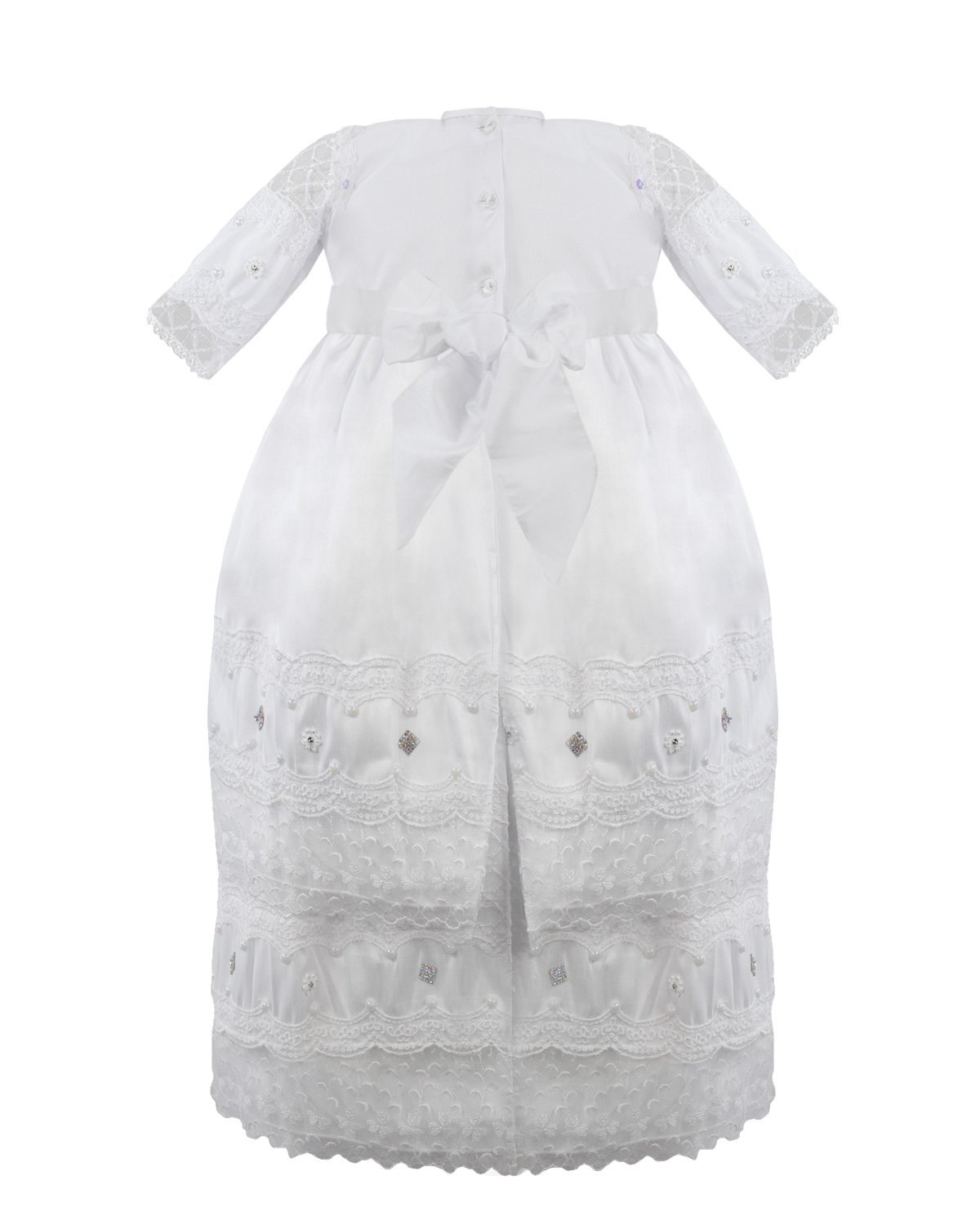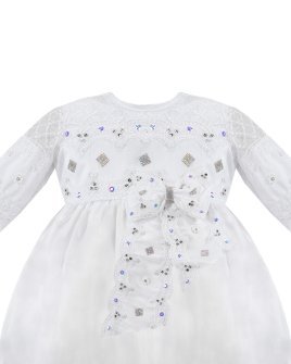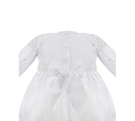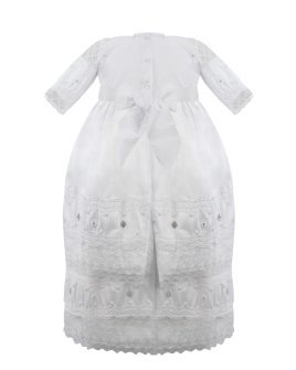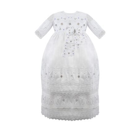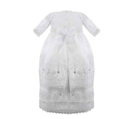 Baptism gown in embroidered shantung with rhinestones, pearls, and a decorative bow. Anette model.