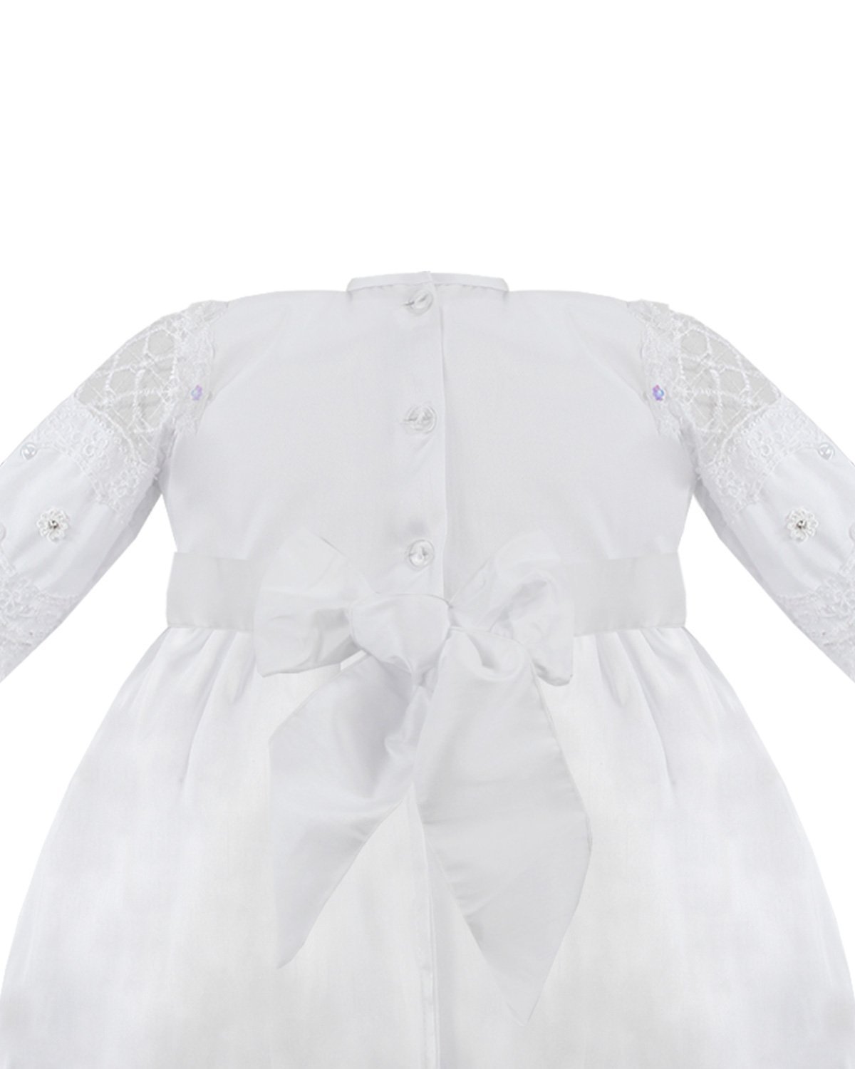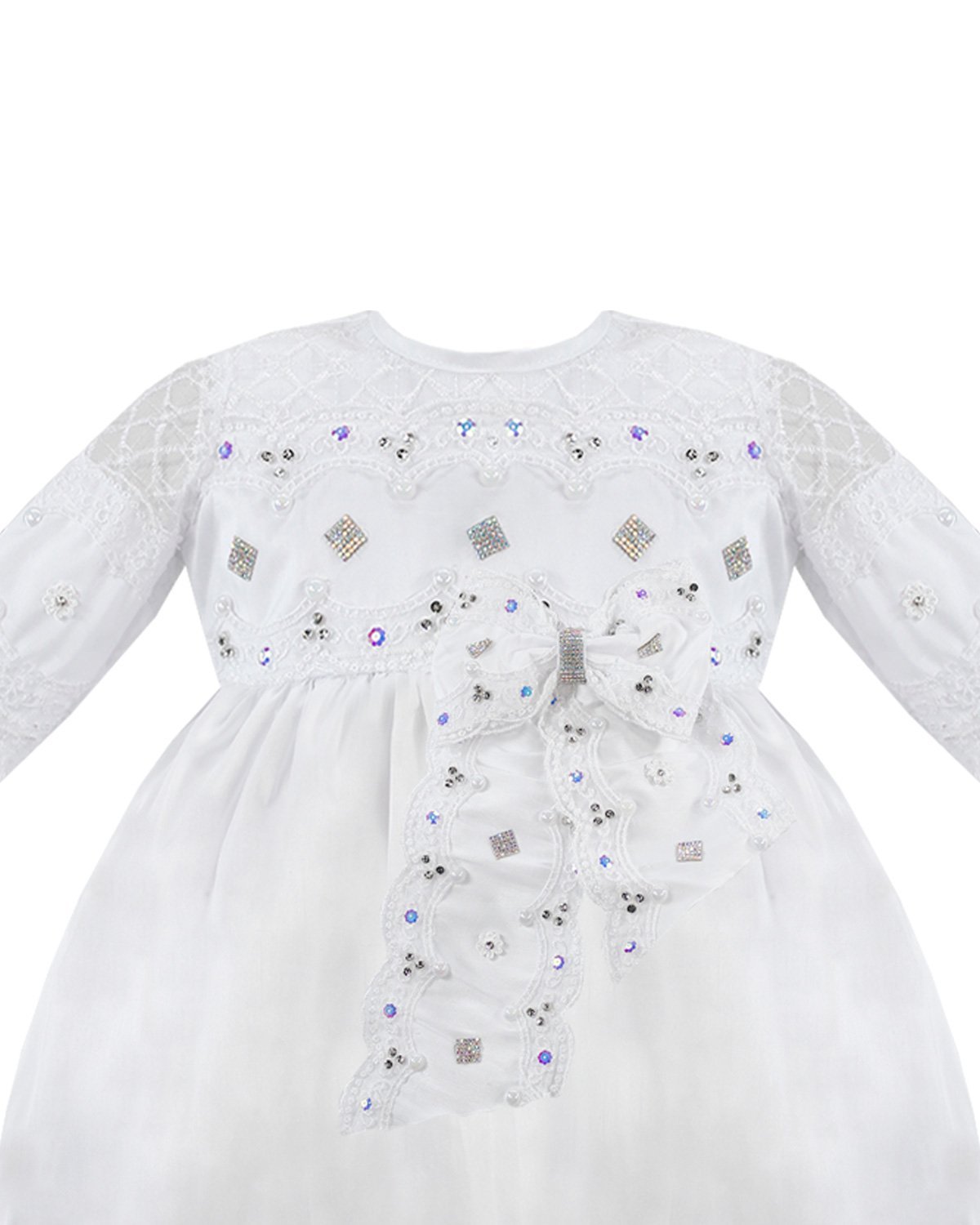 The Anette Baptism Gown is crafted from luxurious shantung, featuring detailed embroidery on both the skirt and bodice. It is beautifully embellished with rhinestones and pearls. The long-sleeved bodice adds a formal touch, and a charming front bow adorned with embroidery, pearls, and rhinestones completes the elegant look. Perfect for a timeless and special baptism.