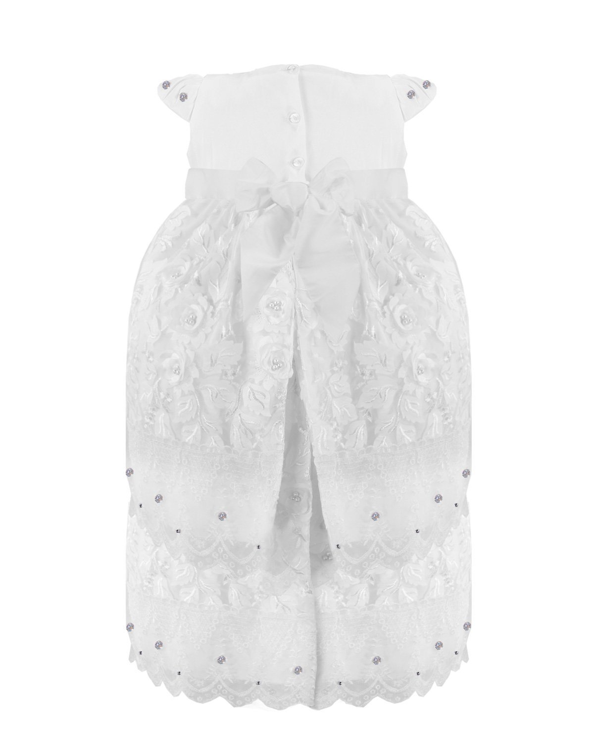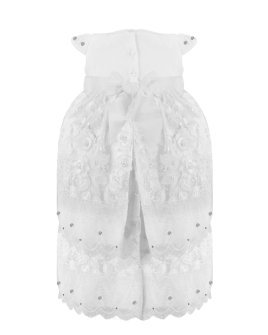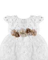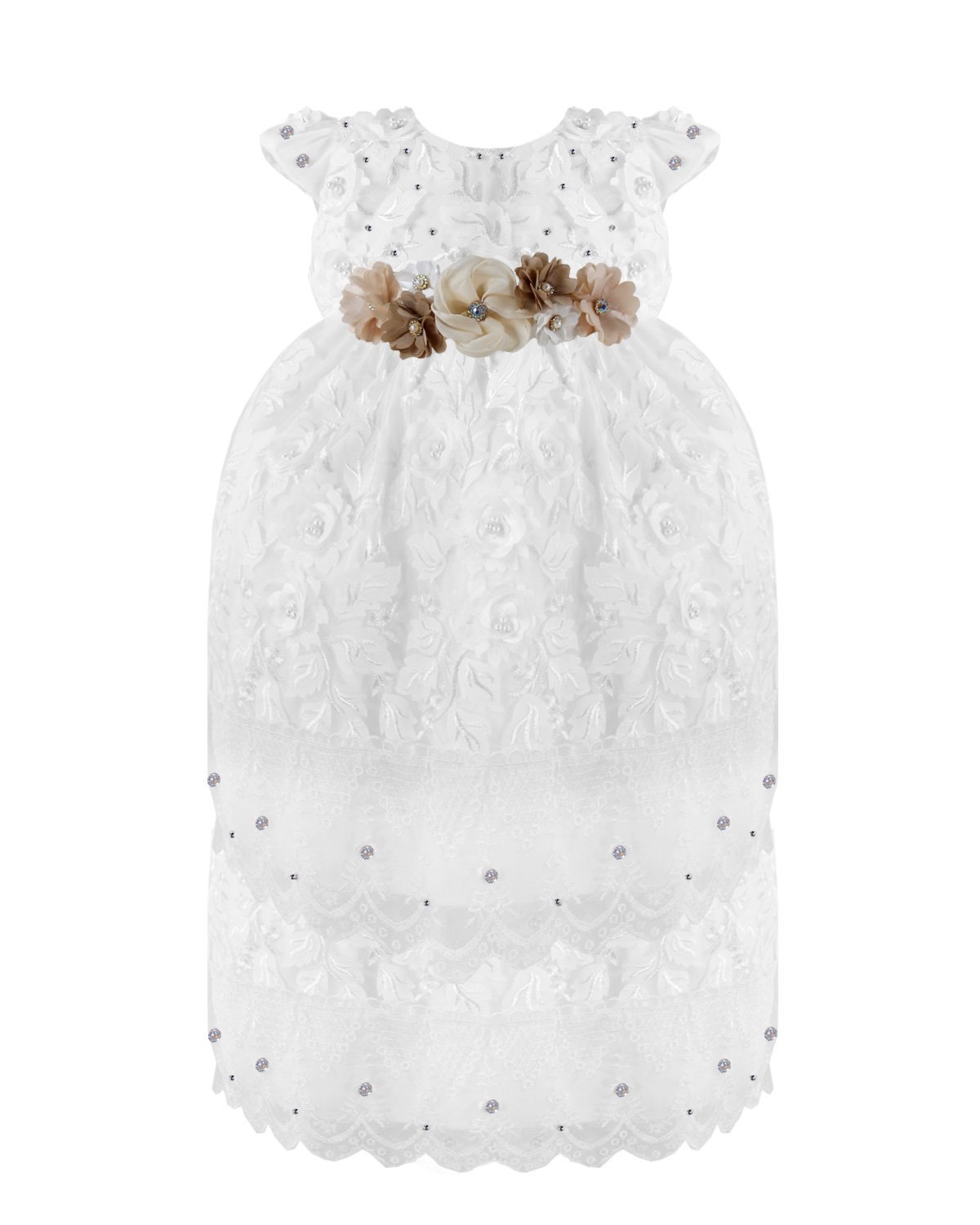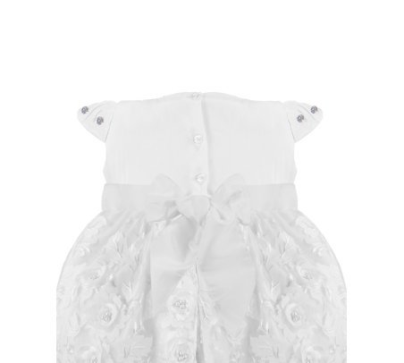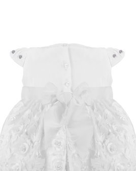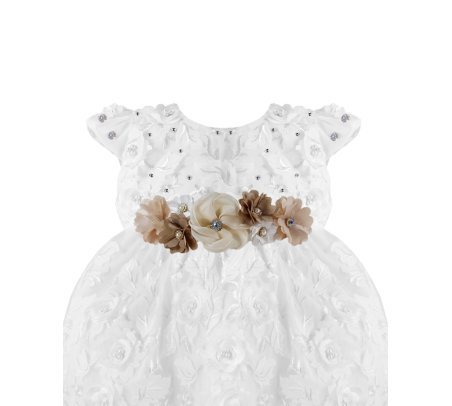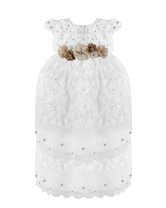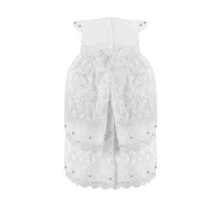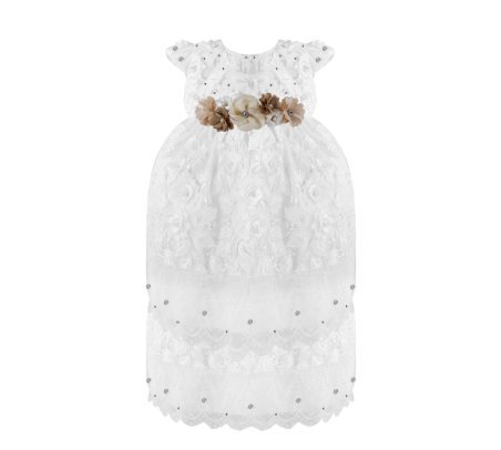 Baptism gown for girls with embossed flowers, pearls, rhinestones, and lace. Lola model.