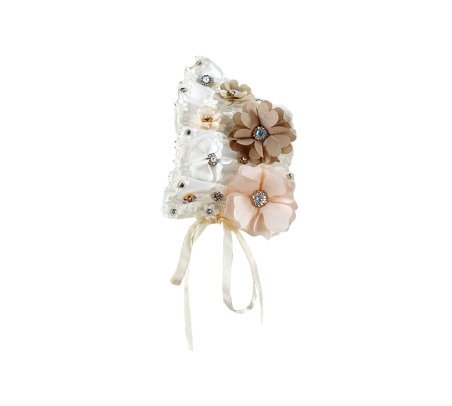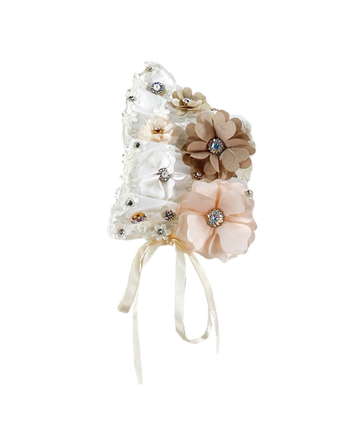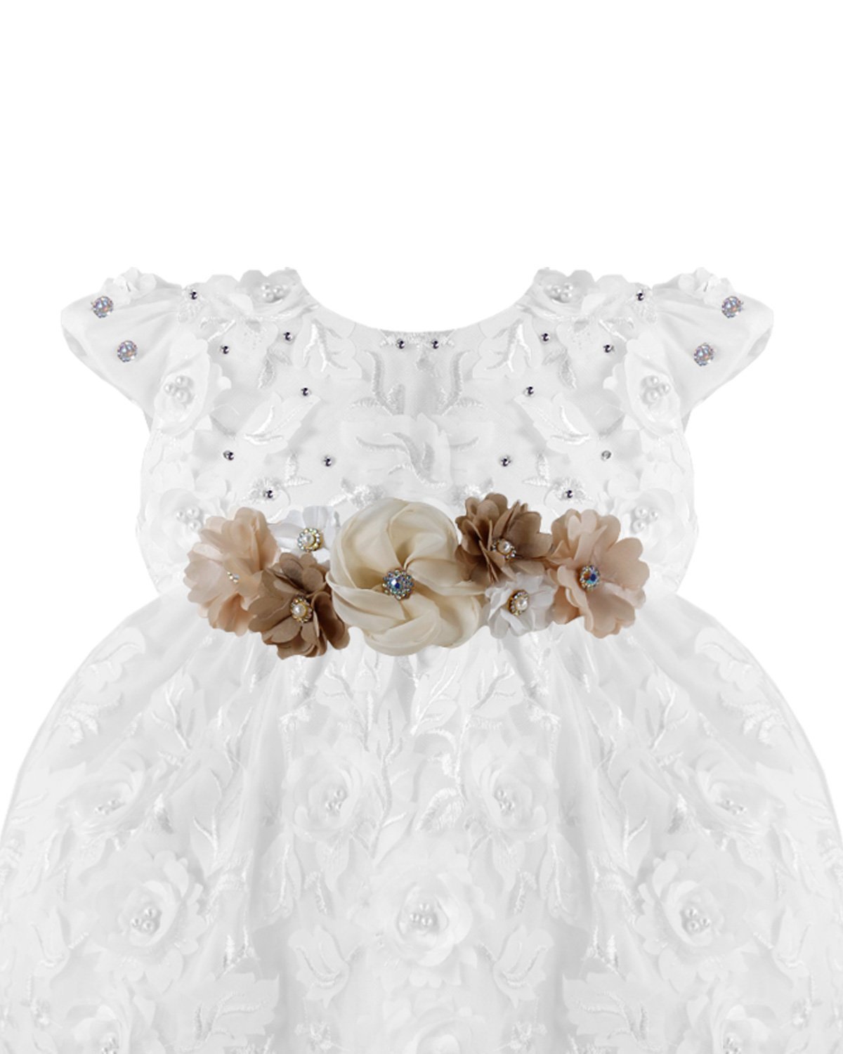 The Lola Baptism Gown features embossed floral fabric adorned with pearls and subtle rhinestones for an elegant sparkle. It includes delicate cap sleeves and a classic skirt decorated with lace and sparkling accents. A neutral-toned floral embellishment at the waist adds a warm and refined touch.
