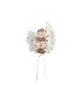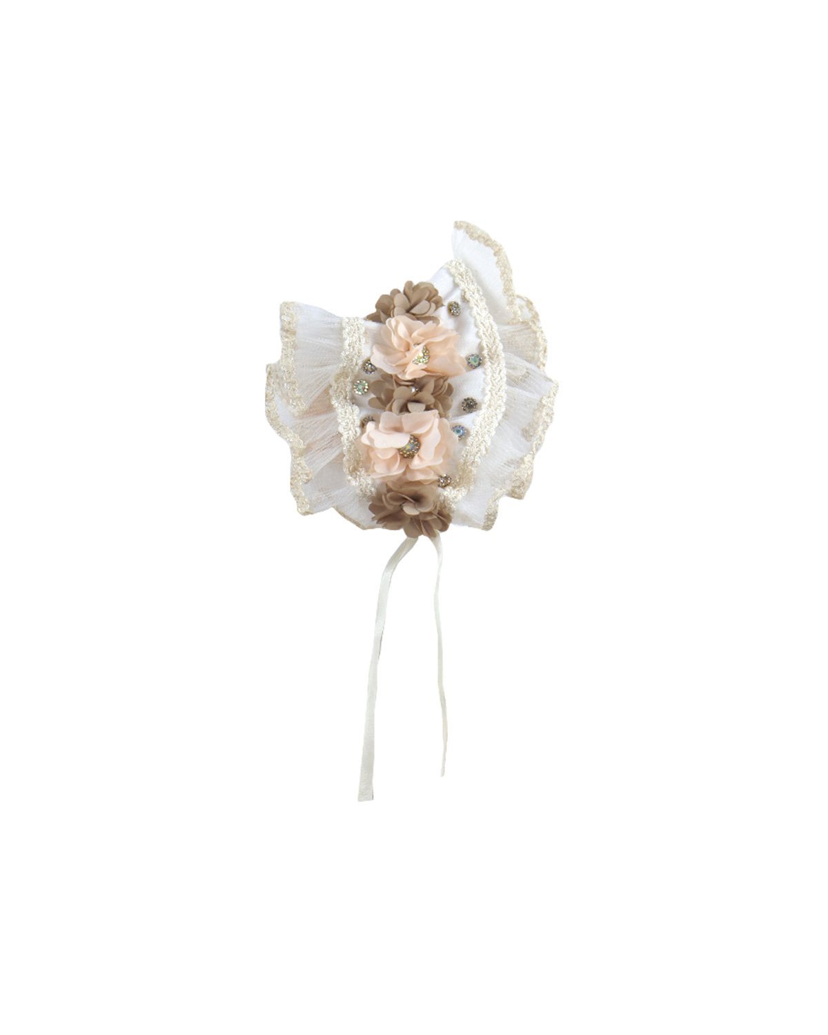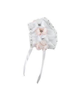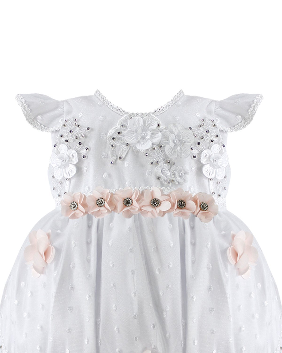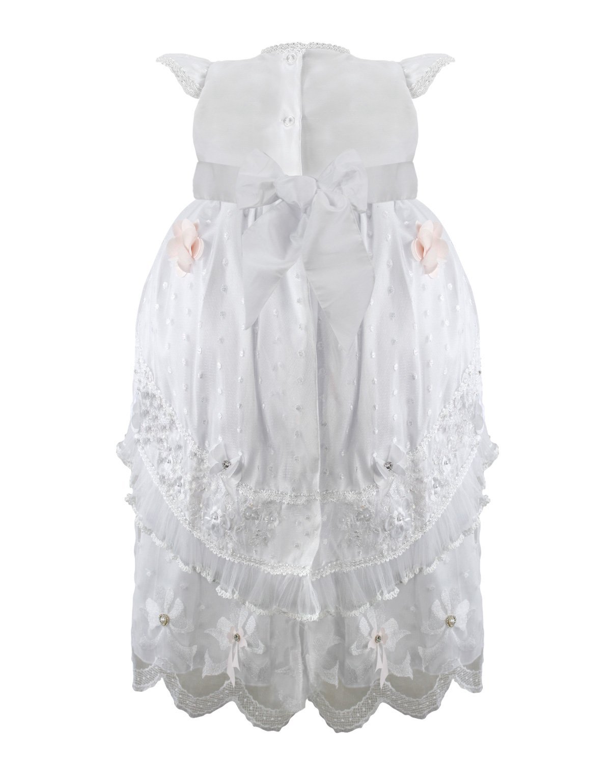 Regina Baptism Gown made of shantung with embroidered tulle, skirt and blouse decorated with crystals, pearls, and embroidery. Includes lace sleeves and matching lace headband with 3D flowers.