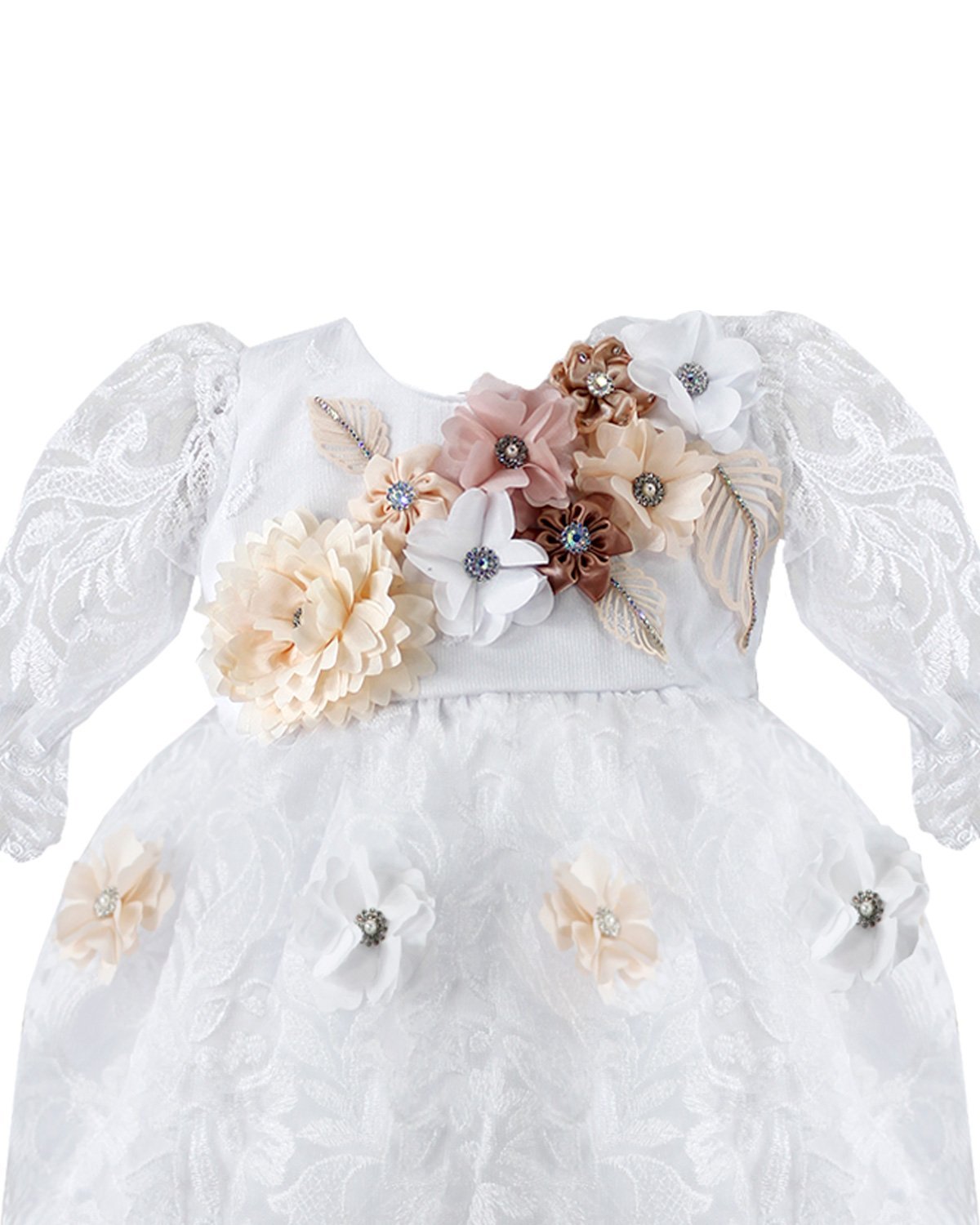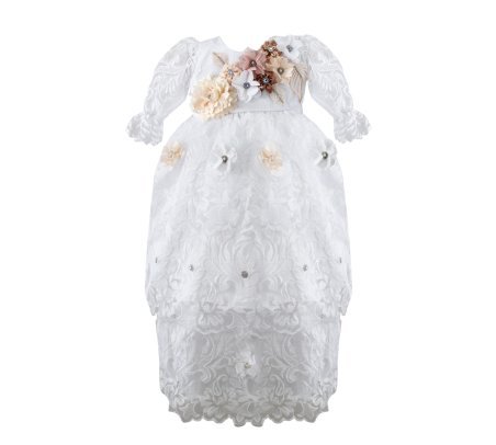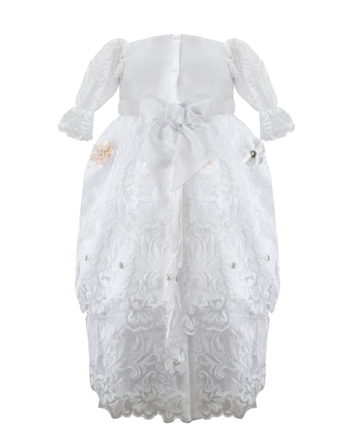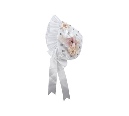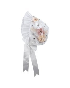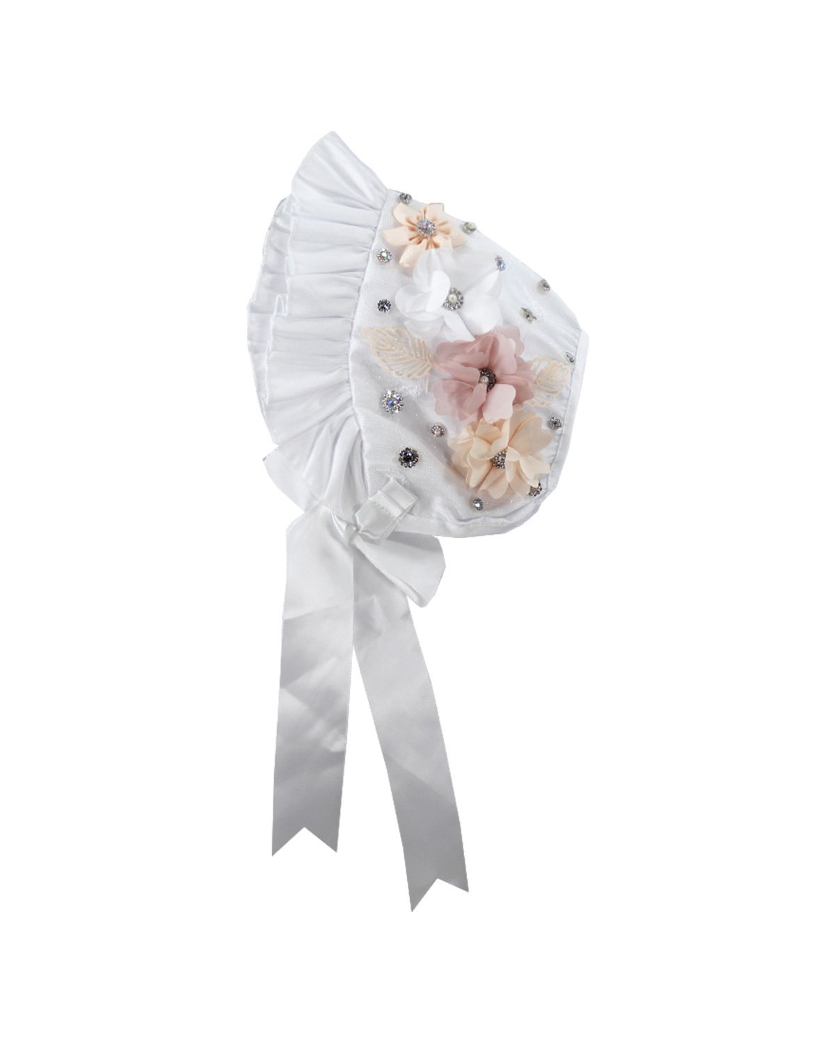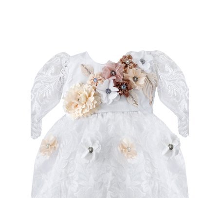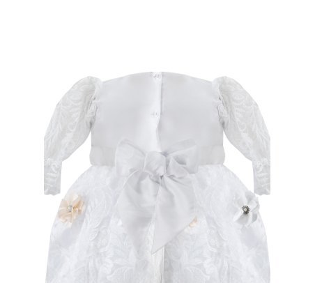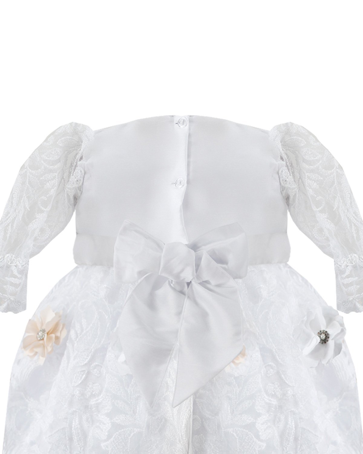 Dulce Baptism Gown made of shantung and embroidered tulle, with skirt and blouse decorated with embroidery, crystals, and pearls. Includes long sleeves with trims, a 3D floral detail on the blouse, and a lace bonnet with 3D flowers.