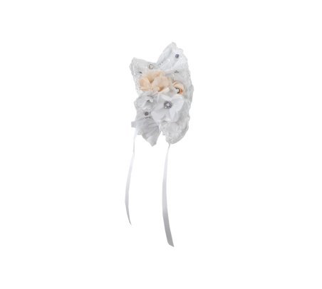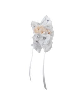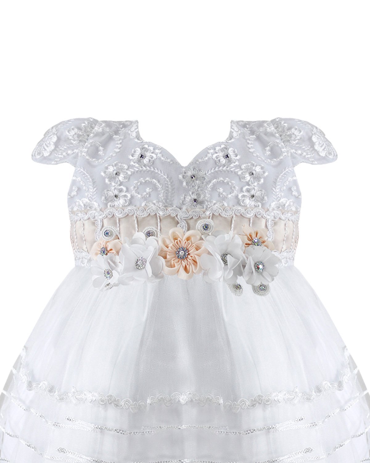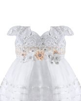 Yoselin Baptism Gown made of shantung with embroidered tulle and trims on the skirt. Blouse with embroidery and 3D floral sash with crystals, short sleeves, and matching headband.