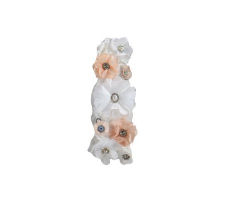 Baptism Gown Model 107, made of shantung with embroidered tulle and trims on the skirt. Includes embroidered blouse, 3D floral sash with crystals, medium-length embroidered sleeves, and matching headband.