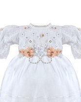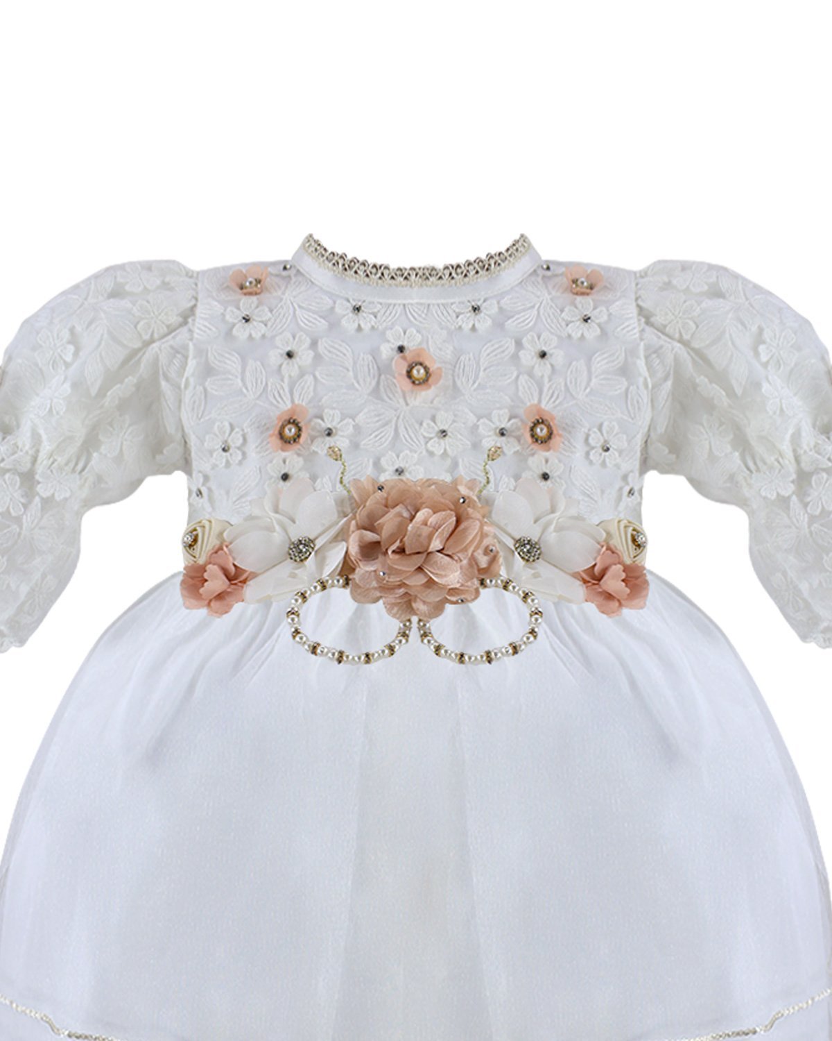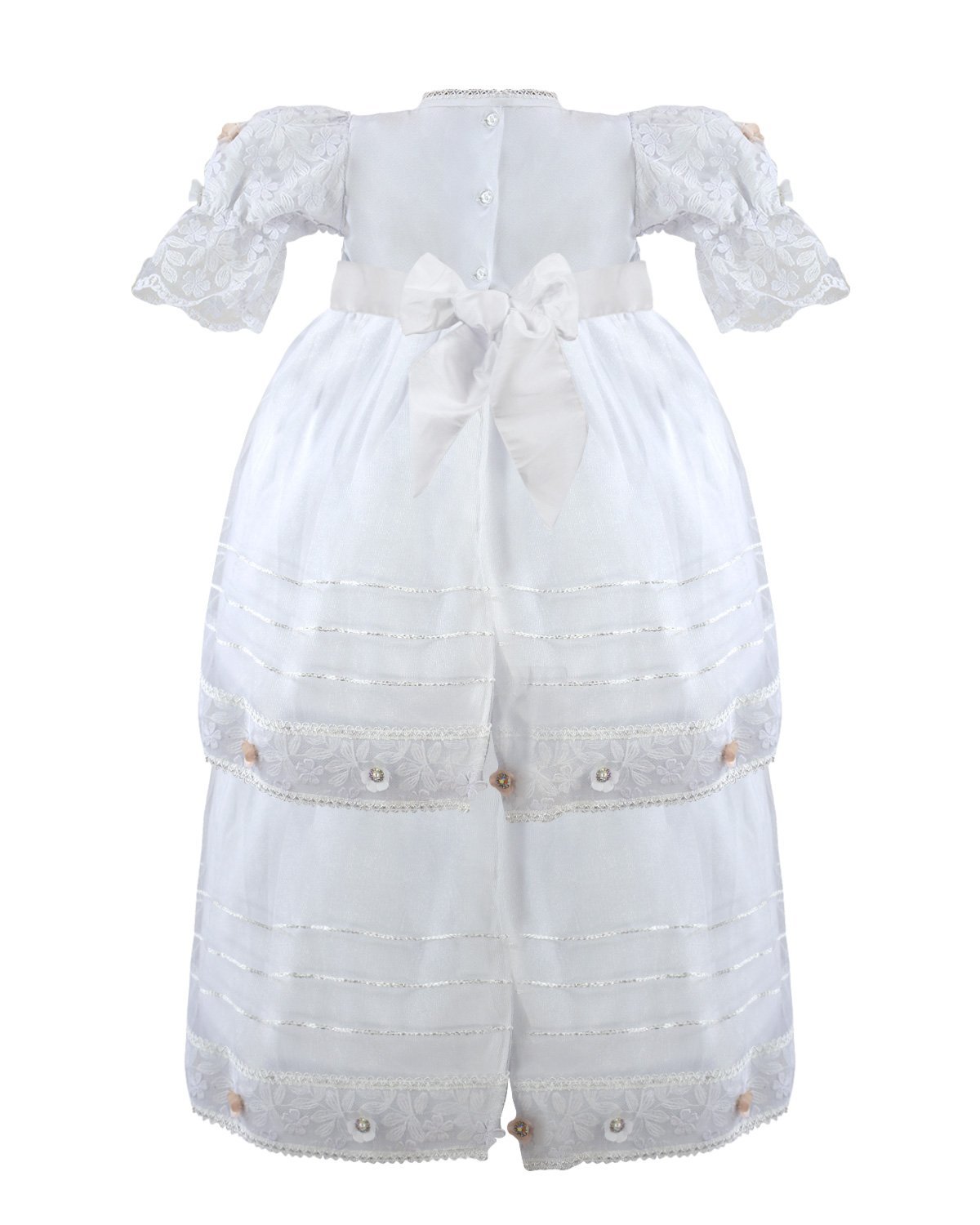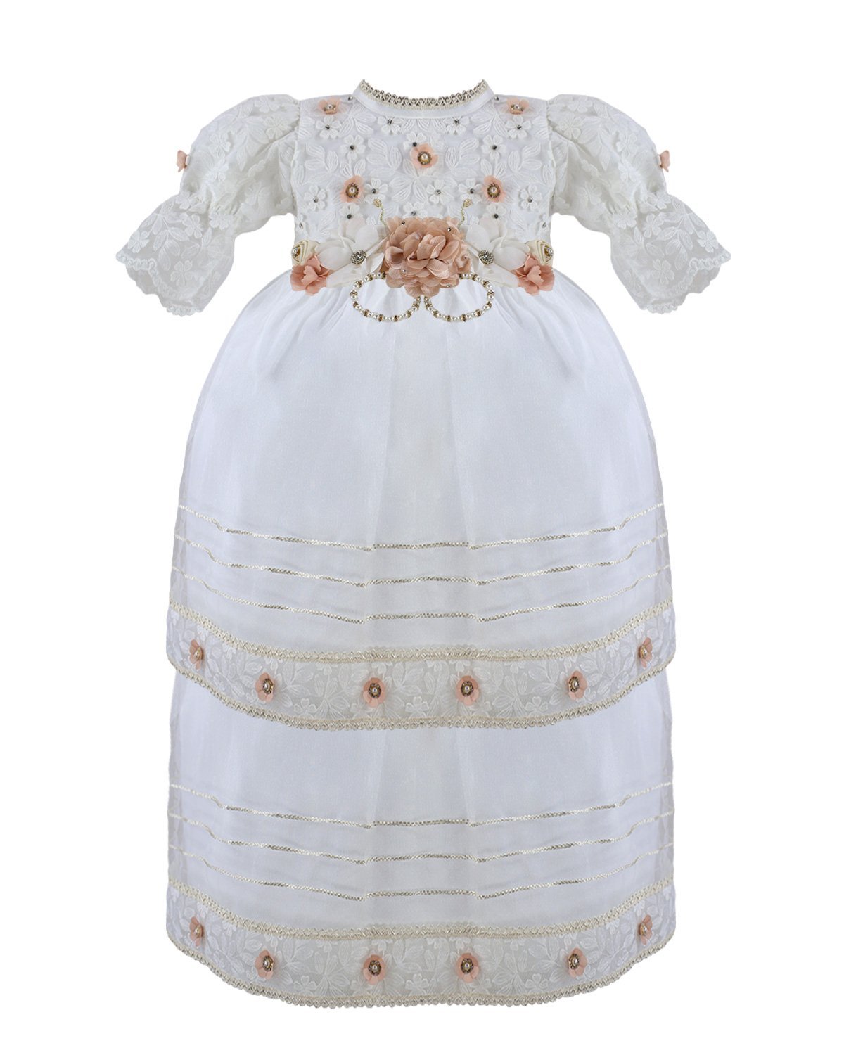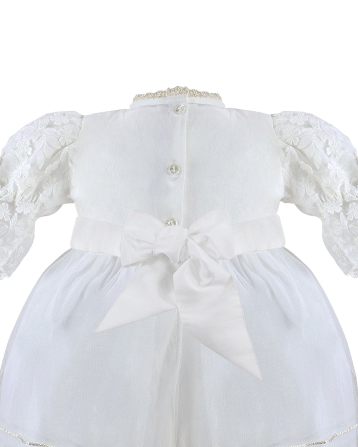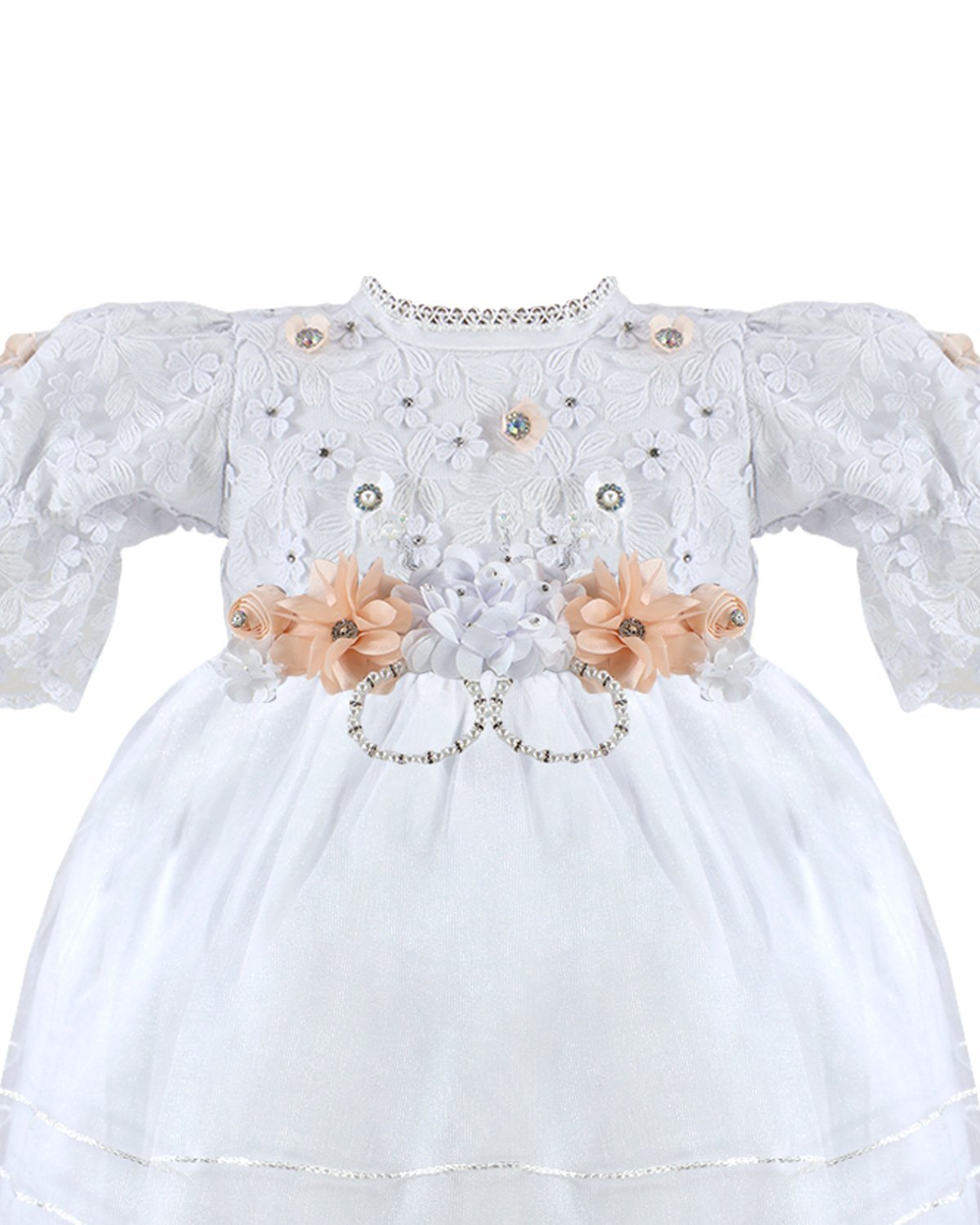 Baptism Gown Model 110 in shantung with embroidered tulle, skirt trims, and 3D flowers with crystals. Embroidered blouse, 3D floral sash, long embroidered sleeves, and matching headband.