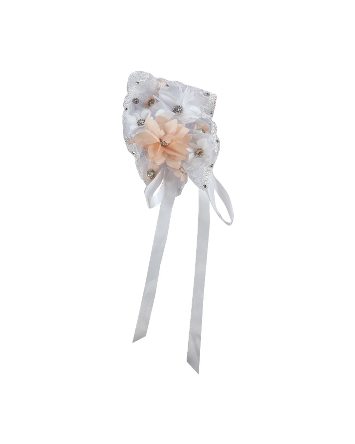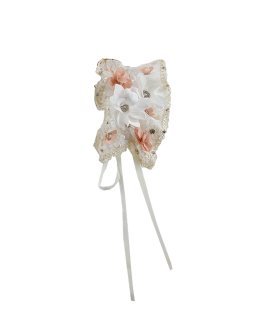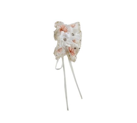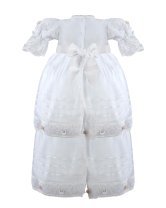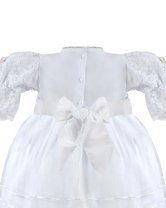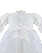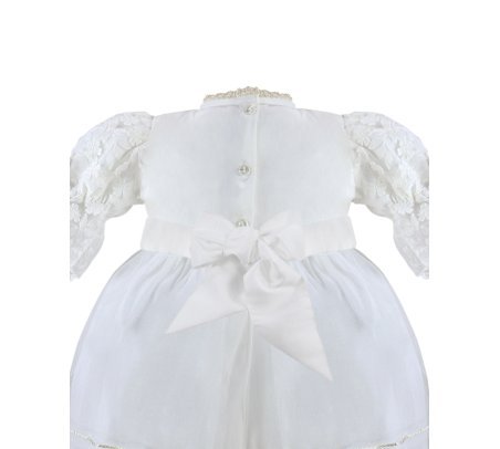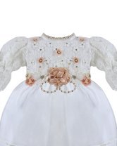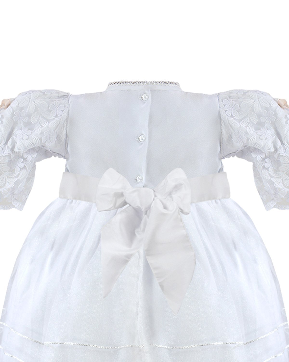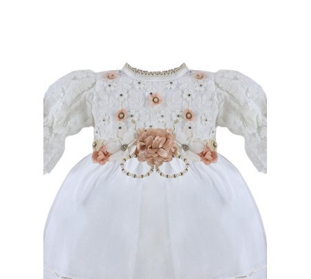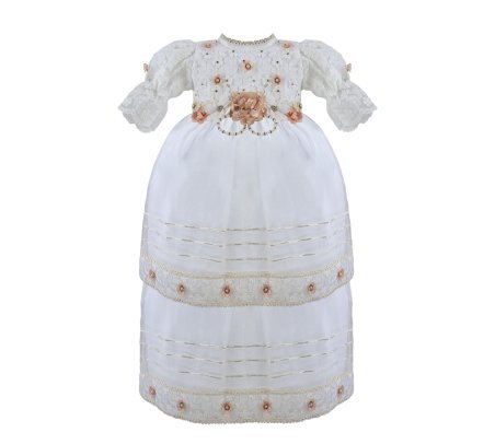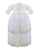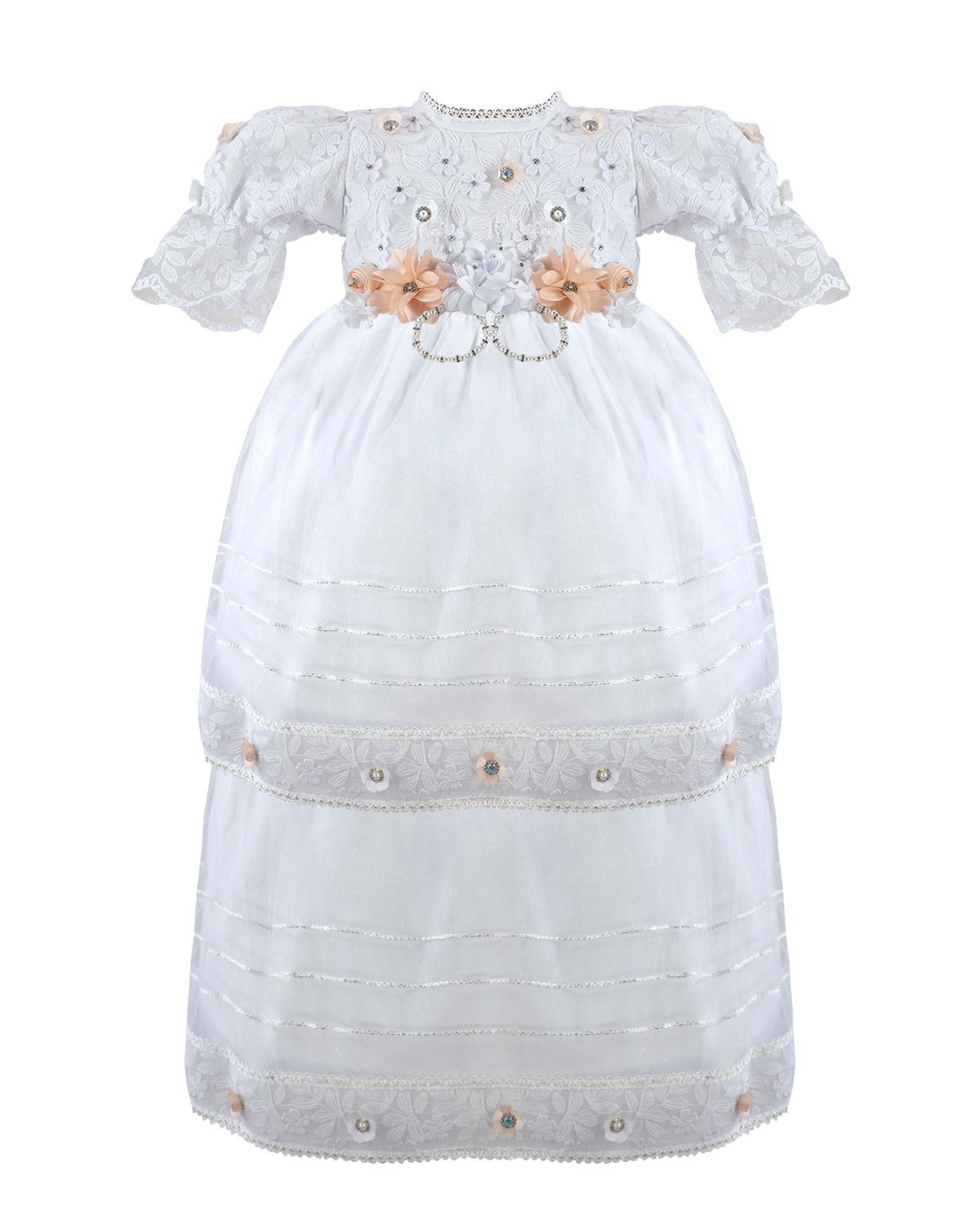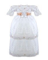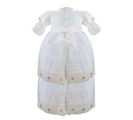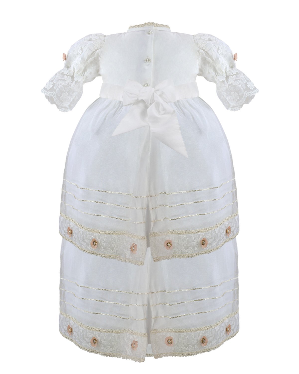 Baptism Gown Model 110 in shantung with embroidered tulle, skirt trims, and 3D flowers with crystals. Embroidered blouse, 3D floral sash, long embroidered sleeves, and matching headband.