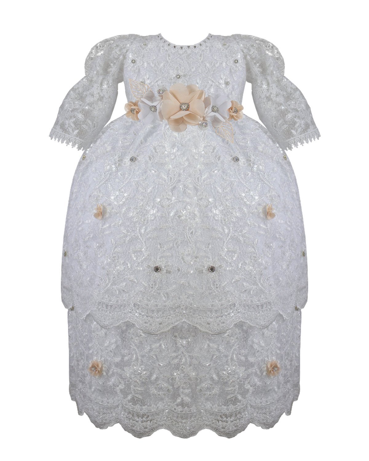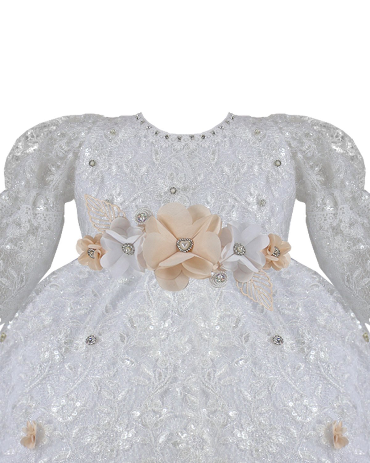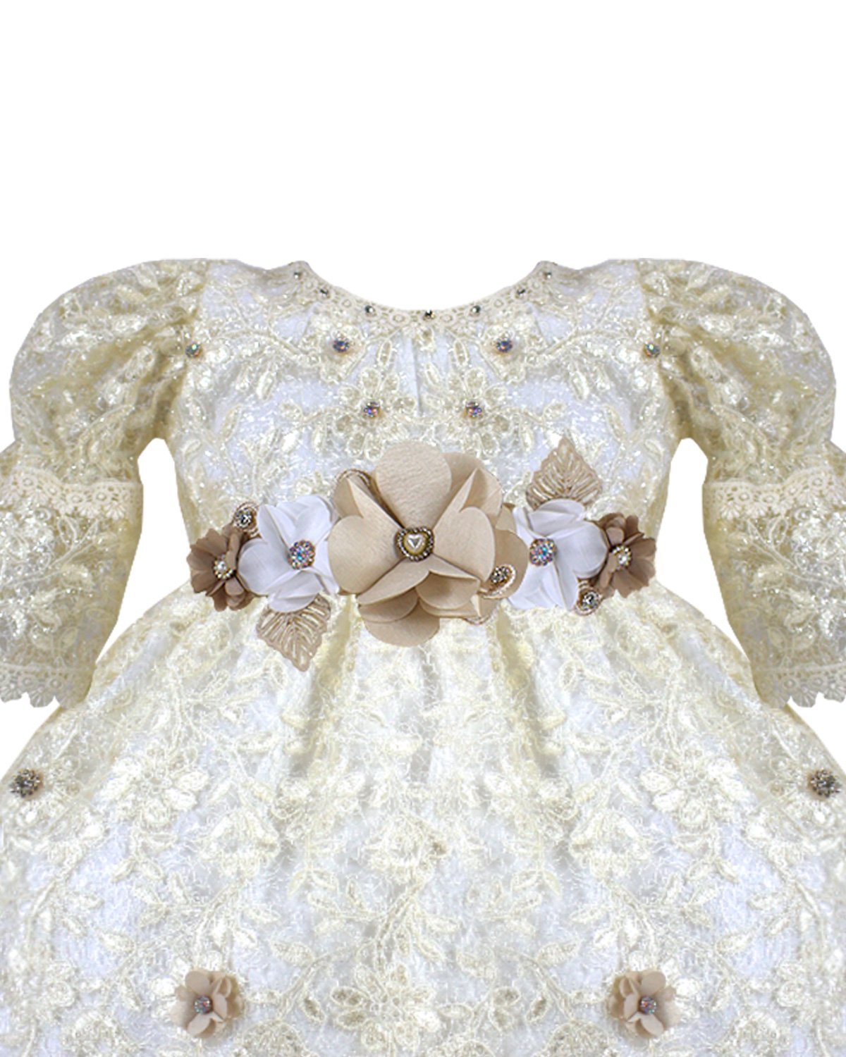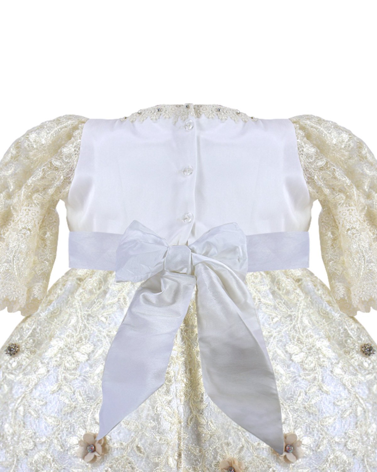 Baptism Gown Model 116 in shantung with embroidered tulle, skirt trims, 3D flowers with pearls, 3D floral sash with crystals, long puffed embroidered sleeves, and matching headband.