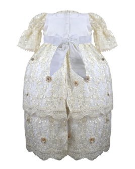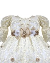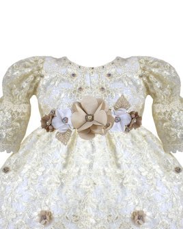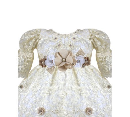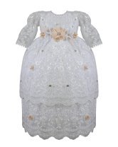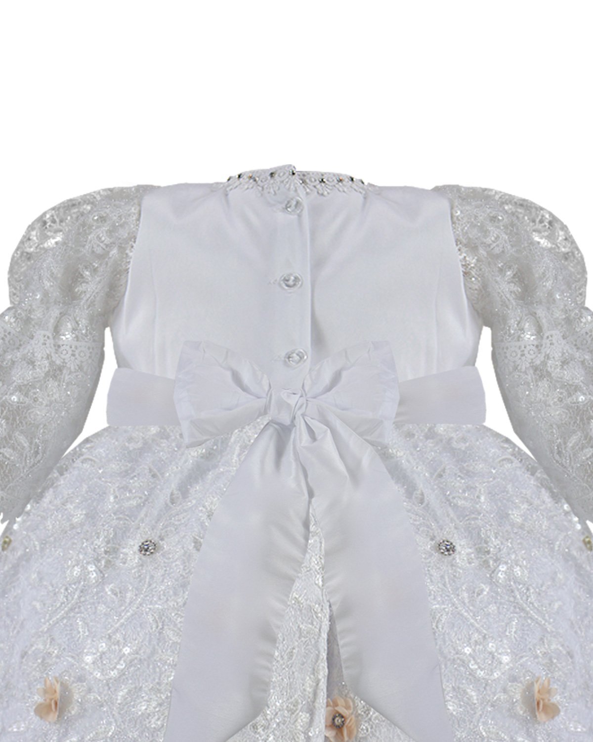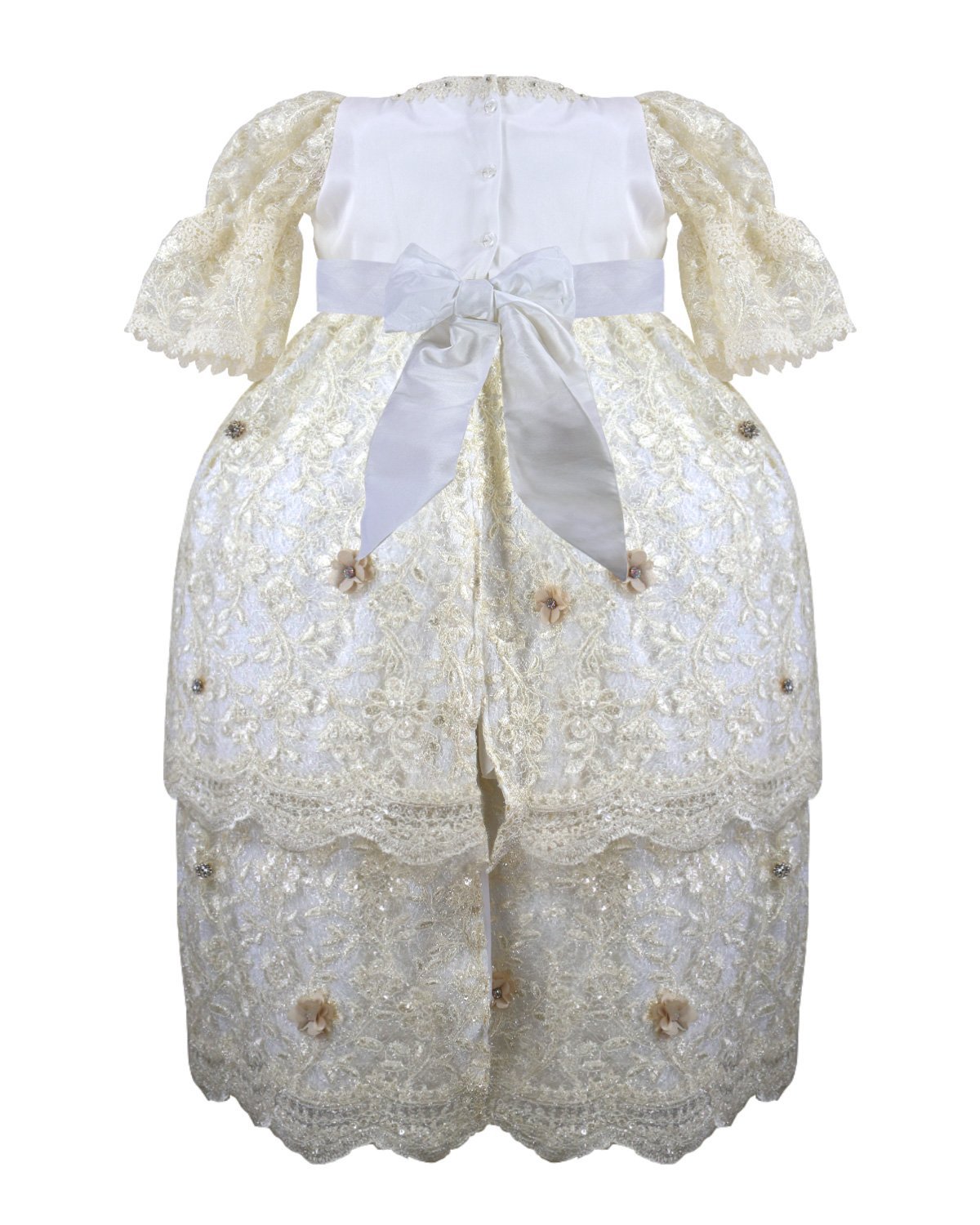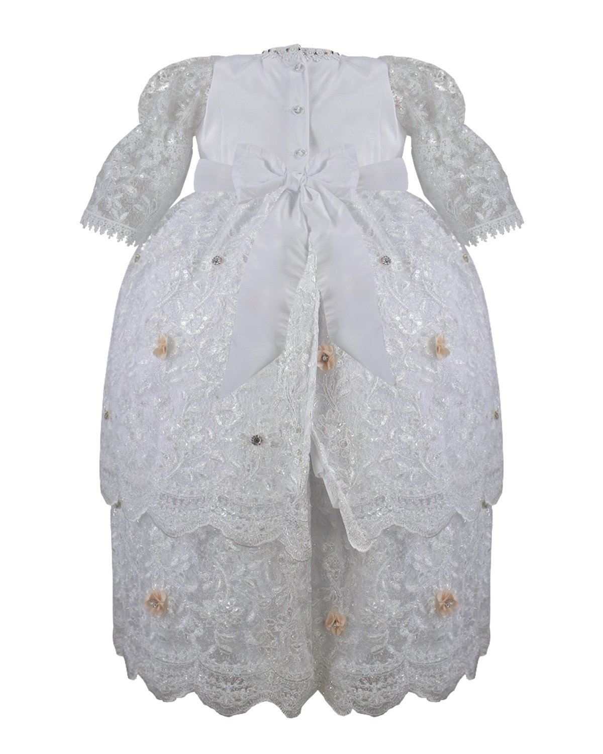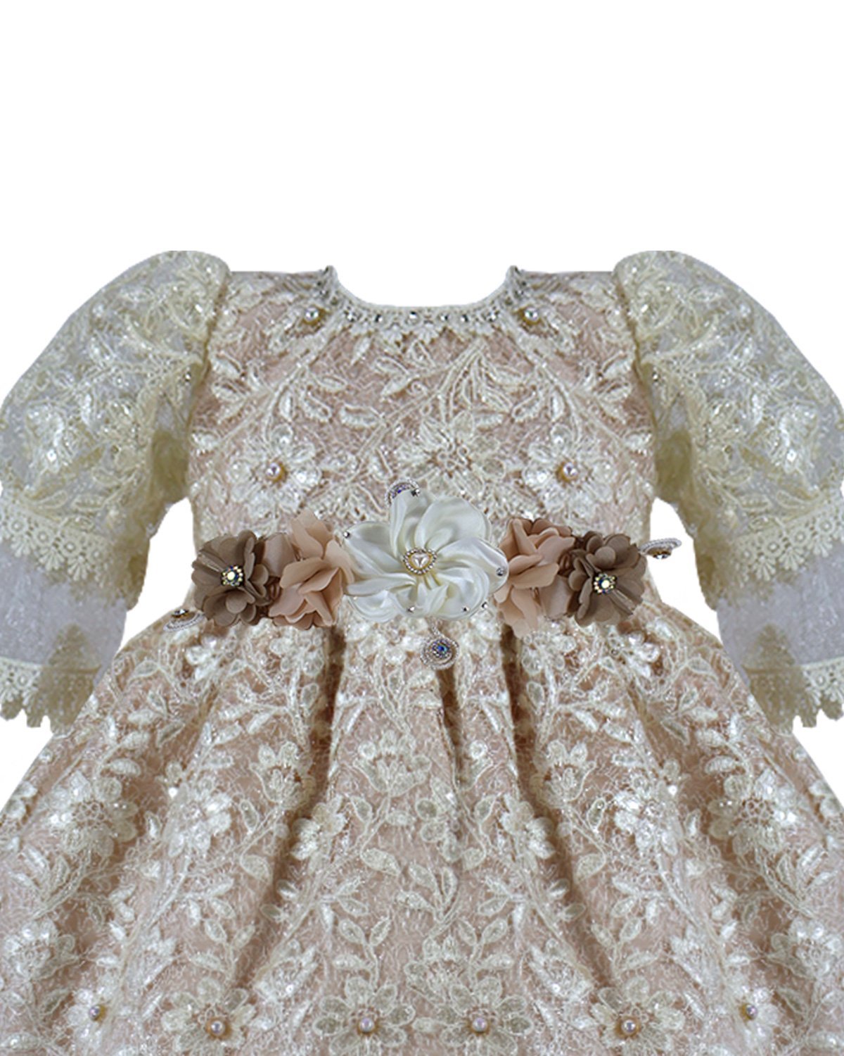 Baptism Gown Model 116 in shantung with embroidered tulle, skirt trims, 3D flowers with pearls, 3D floral sash with crystals, long puffed embroidered sleeves, and matching headband.