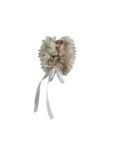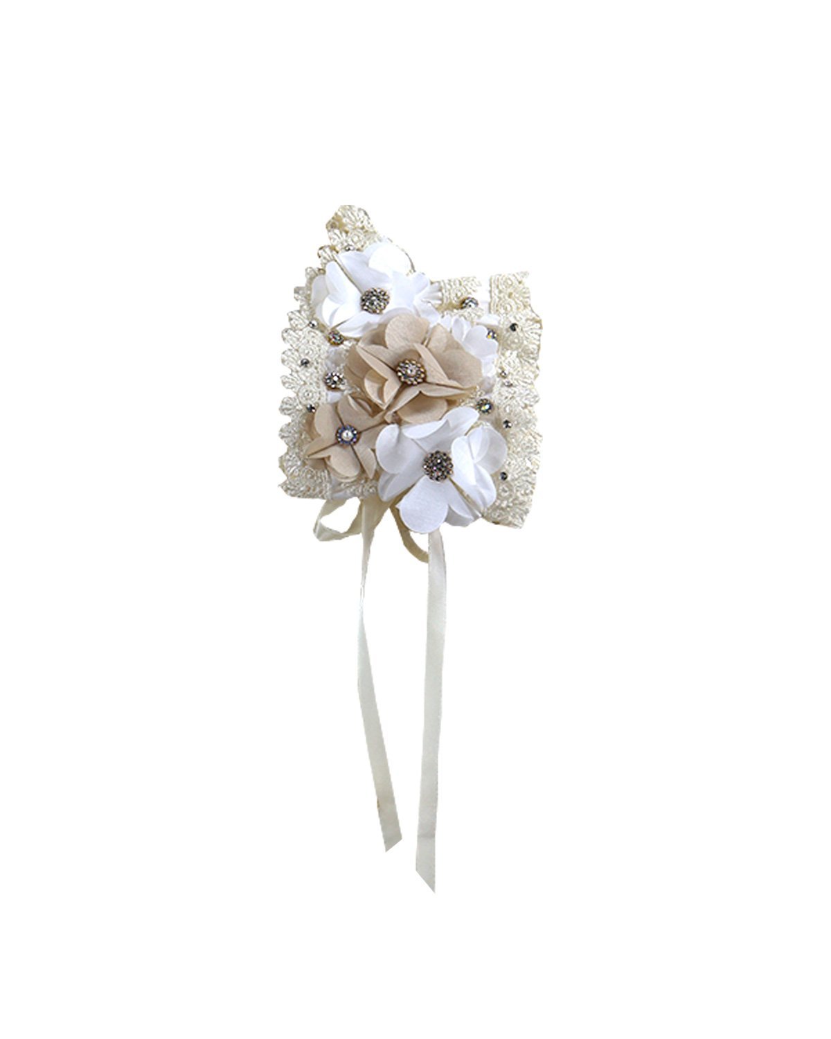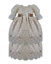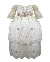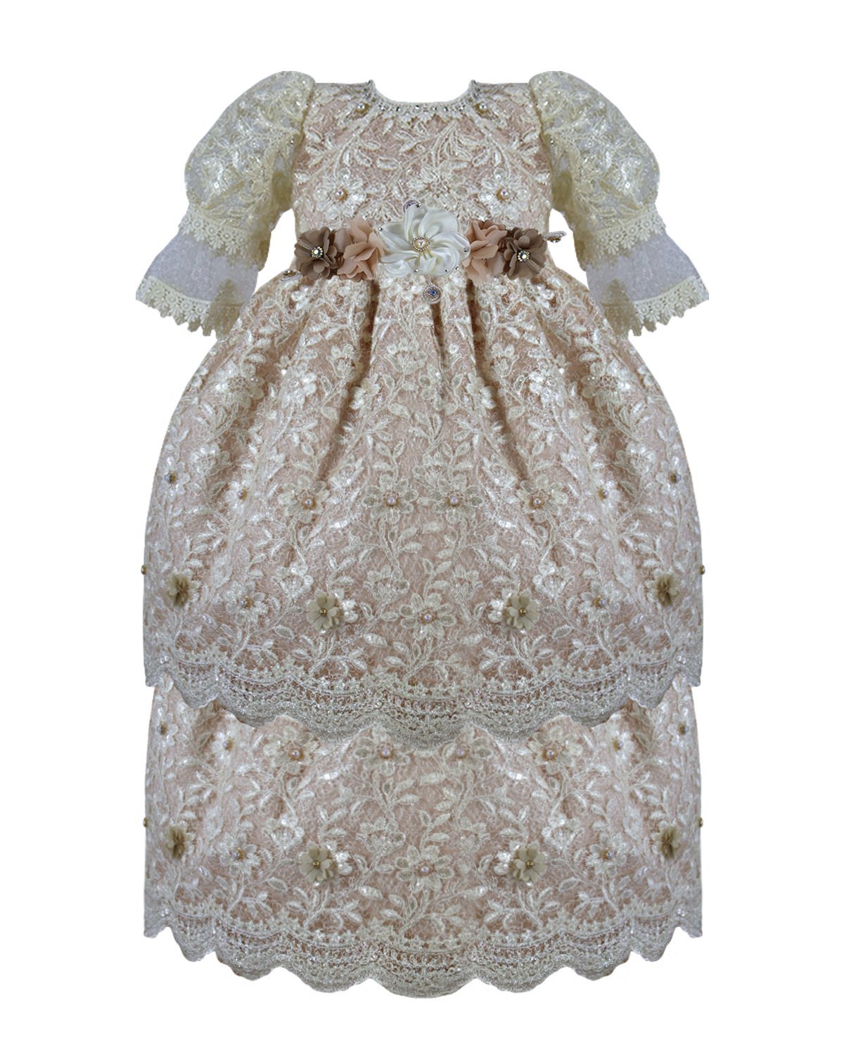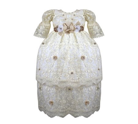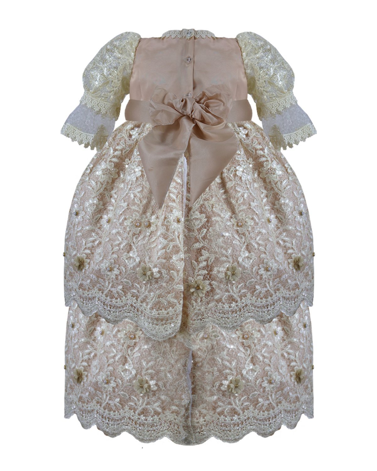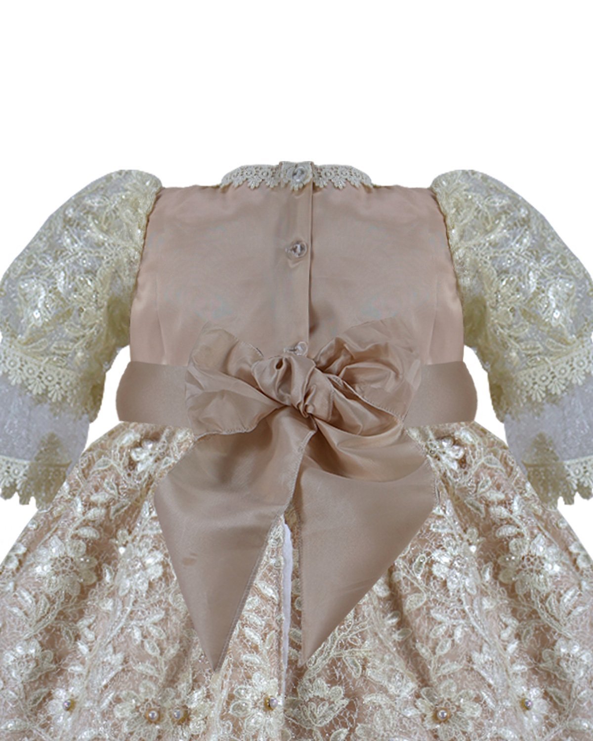 Baptism Gown Model 116 in shantung with embroidered tulle, skirt trims, 3D flowers with pearls, 3D floral sash with crystals, long puffed embroidered sleeves, and matching headband.