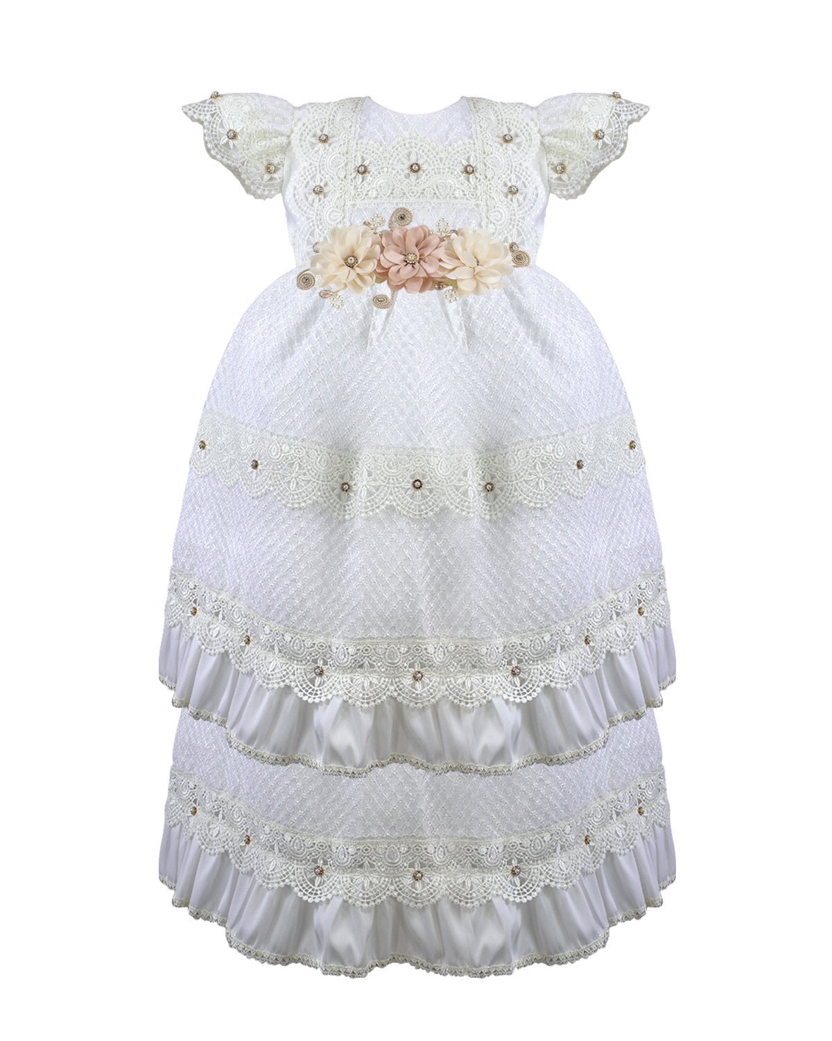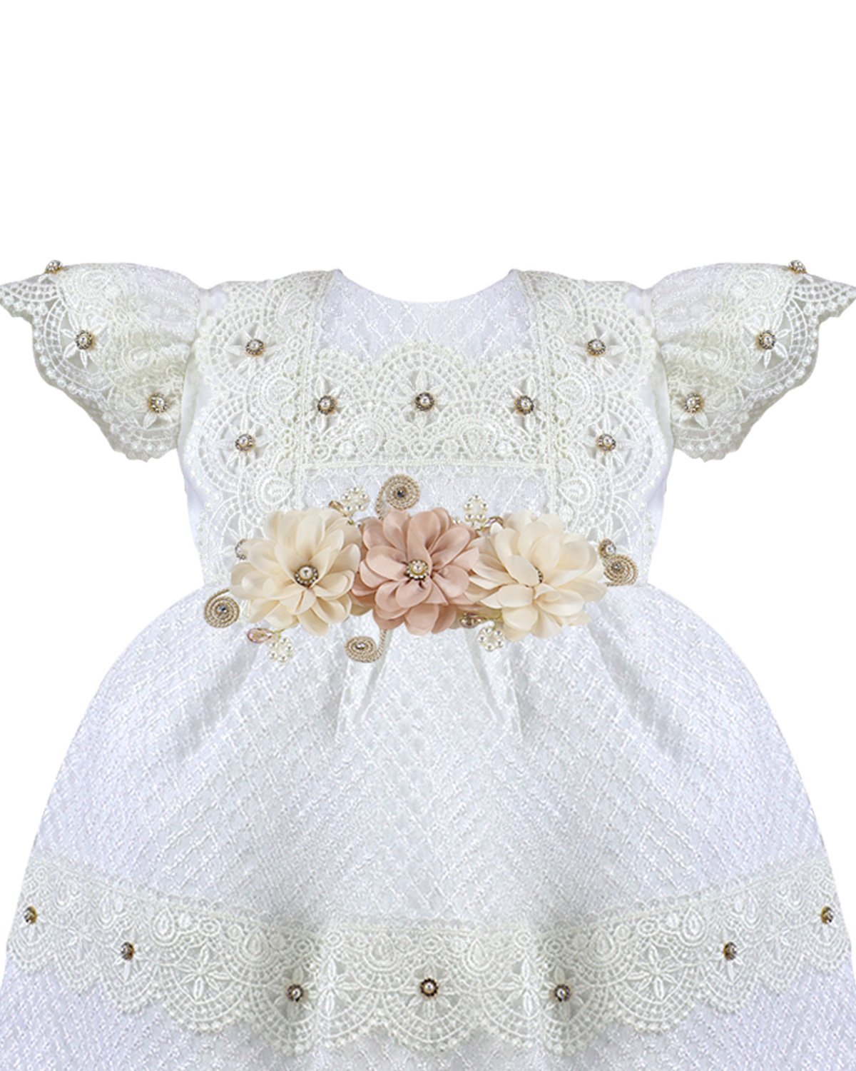 Valeria – 512 Baptism Gown with woven-pattern fabric, lace with crystals, beige 3D flowers, and puffed short sleeves.
