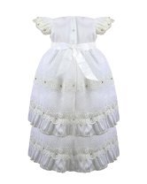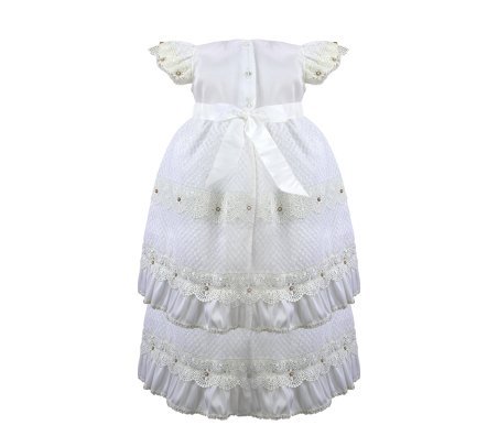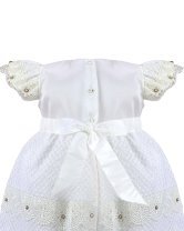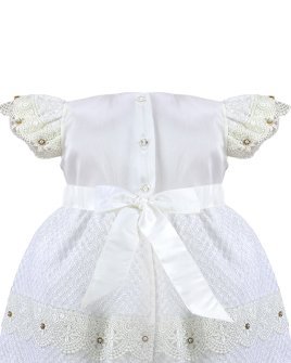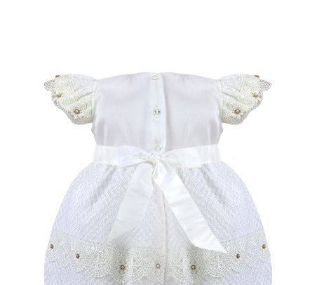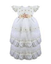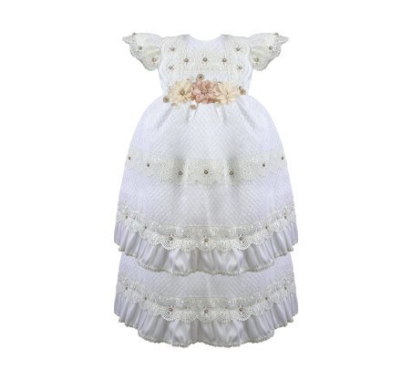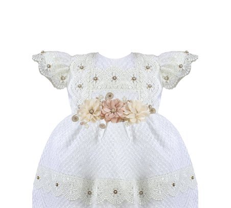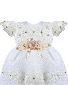 The Valeria – 512 Baptism Gown is crafted from an elegant woven-pattern fabric that adds texture and sophistication. The double-layered skirt features delicate lace trims accented with small crystal details, creating a voluminous and refined look. The bodice showcases ornamental embroidery with shimmering accents, and the puffed short sleeves are decorated with lace and crystal embellishments for a classic and charming finish. The waist is adorned with 3D flowers in soft beige and nude tones with crystal accents, offering a subtle and beautiful contrast. A gown that stands out for its elegance, tradition, and handcrafted detail.