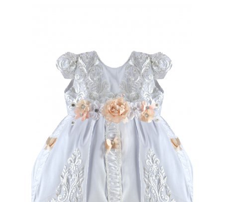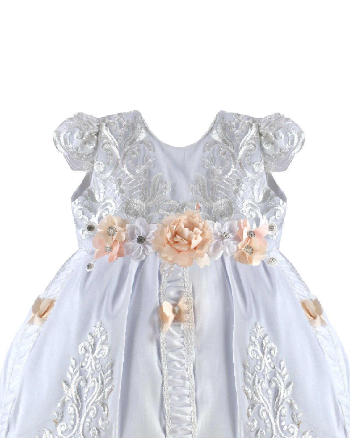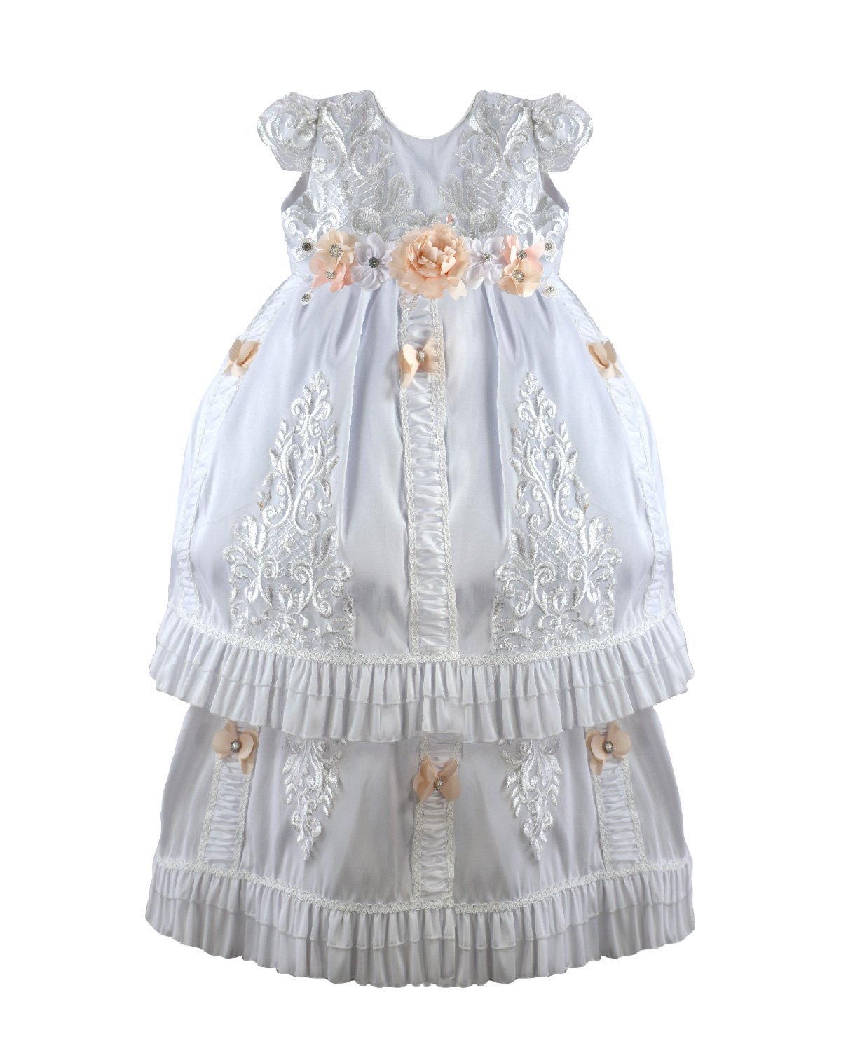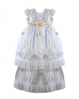 The Magdalena – 133 Style Baptism Gown is crafted with fine fabric and classic ornamental embroidery that adds elegance and refinement. The bodice features decorative embroidery and a front sash adorned with 3D flowers and crystal accents, complemented by vertical embroidered details throughout the design. The double-layer skirt combines embroidered fabric with soft ruffled accents for added volume and movement. Short sleeves with embroidered finishes complete this traditional and sophisticated baptism gown, perfect for a meaningful and elegant ceremony.