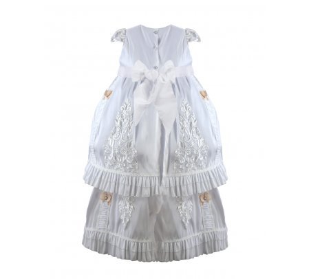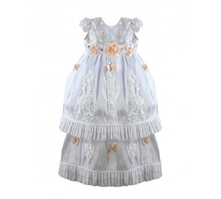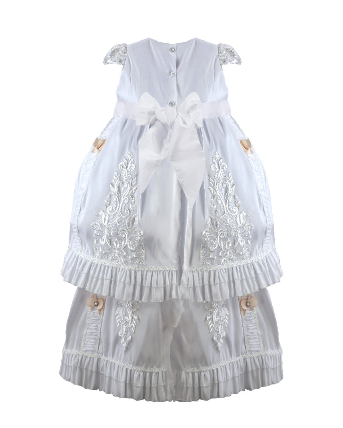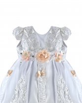 Magdalena – 133 Style Baptism Gown with classic embroidery, double-layer skirt, 3D flower sash with crystal details, and short decorative sleeves.