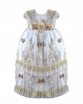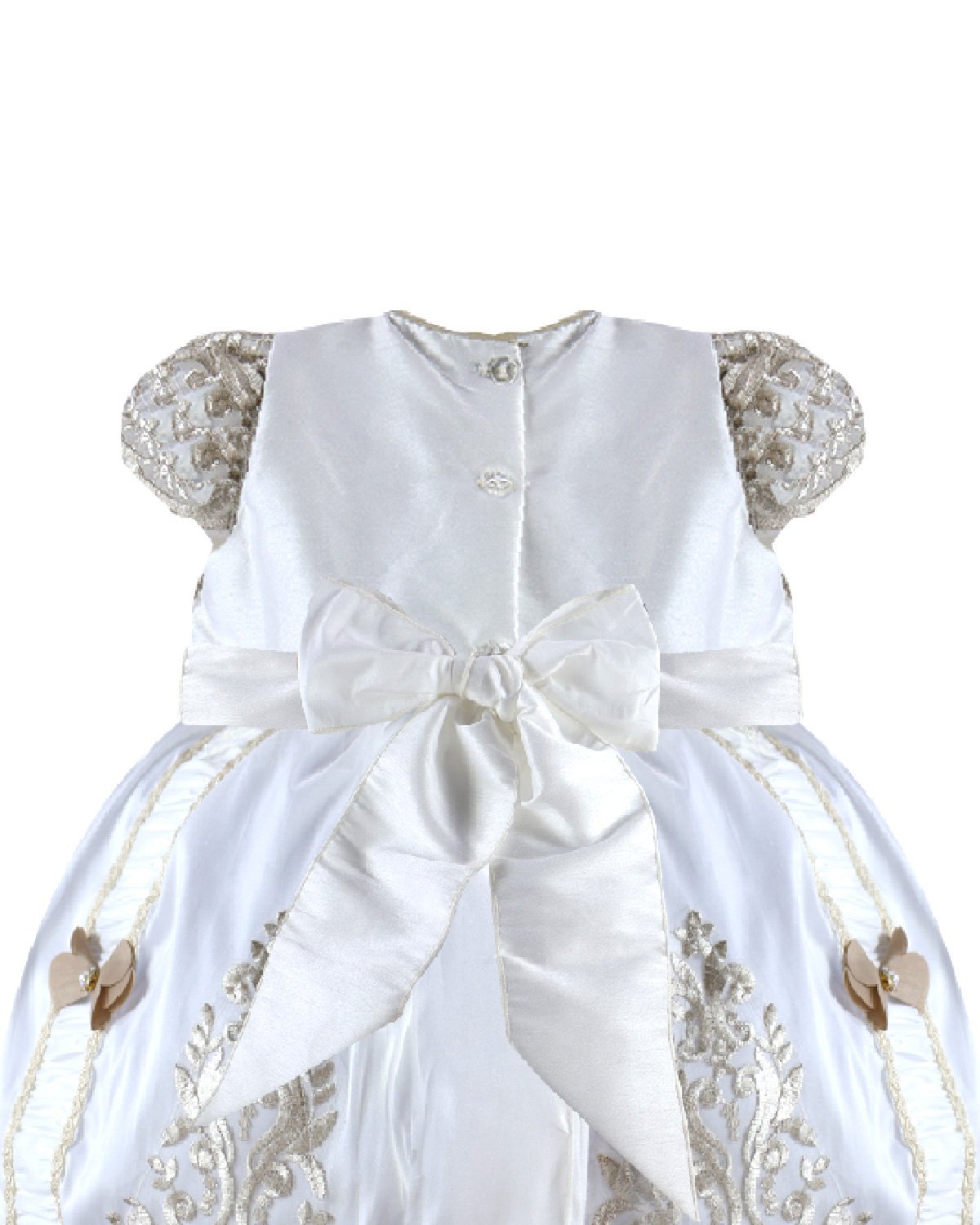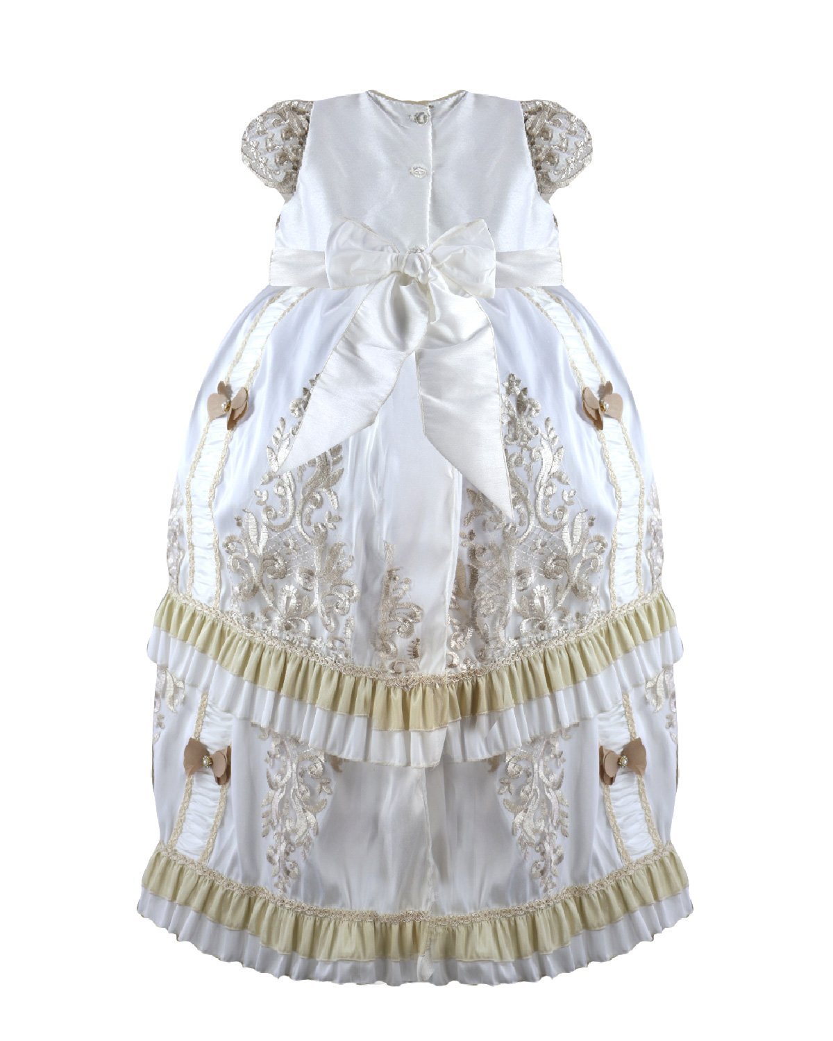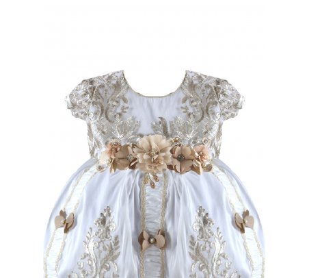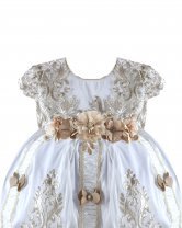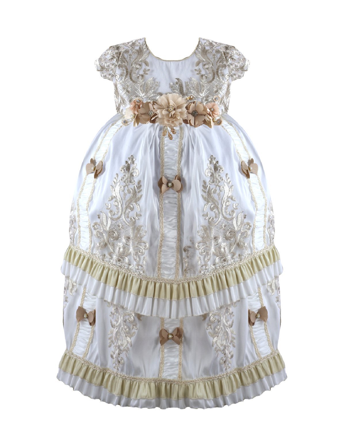 Magdalena – 133 Style Baptism Gown with classic embroidery, double-layer skirt, 3D flower sash with crystal details, and short decorative sleeves.