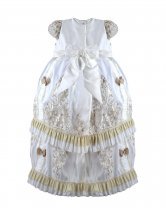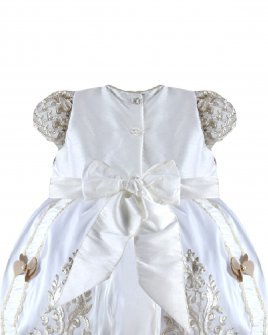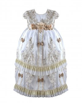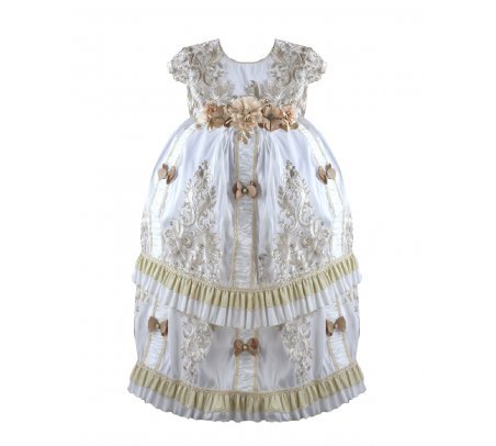 The Magdalena – 133 Style Baptism Gown is crafted with fine fabric and classic ornamental embroidery that adds elegance and refinement. The bodice features decorative embroidery and a front sash adorned with 3D flowers and crystal accents, complemented by vertical embroidered details throughout the design. The double-layer skirt combines embroidered fabric with soft ruffled accents for added volume and movement. Short sleeves with embroidered finishes complete this traditional and sophisticated baptism gown, perfect for a meaningful and elegant ceremony.