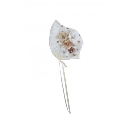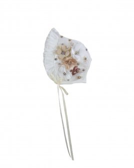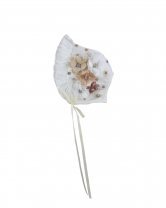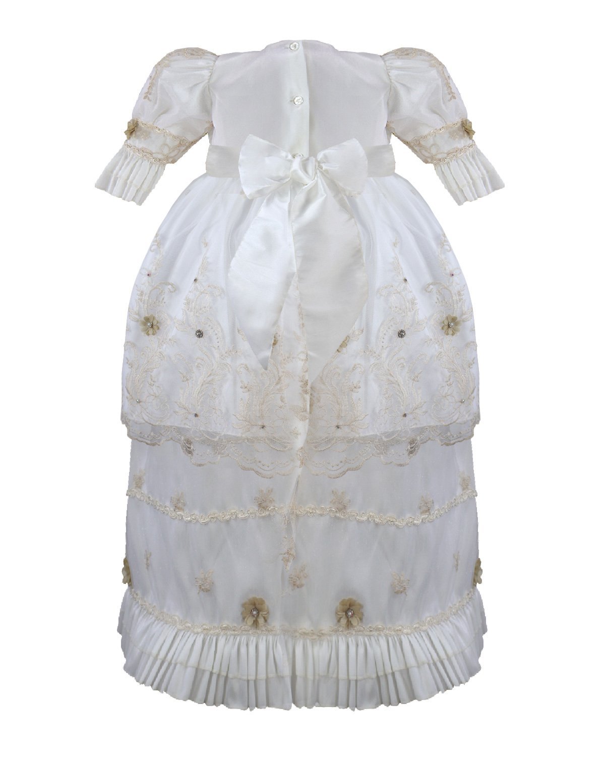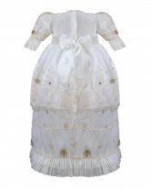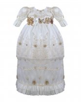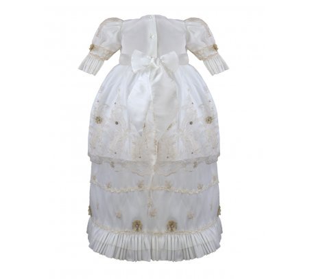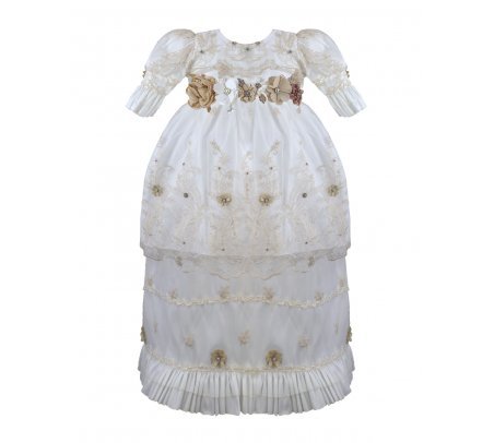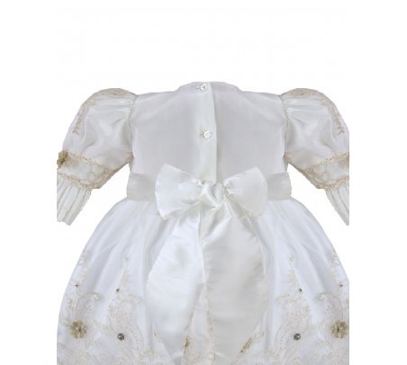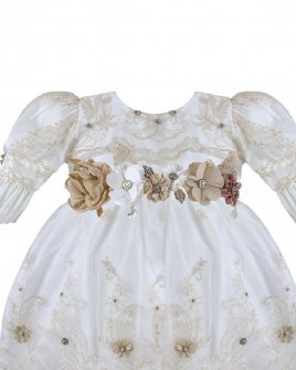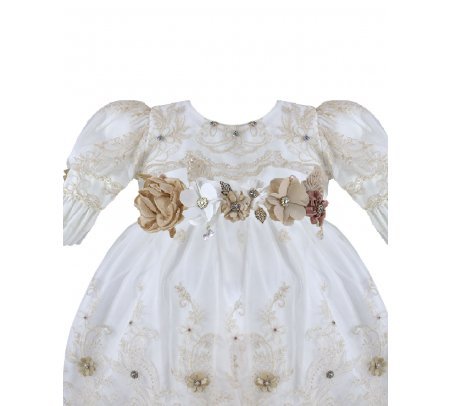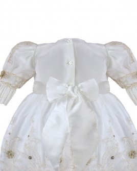 The P-128 Style Baptism Gown is crafted from delicate embroidered tulle with raised floral applications that add texture and refinement. The bodice features puffed long sleeves with embroidered finishes that enhance its classic design. The double-layer skirt showcases ornamental embroidery distributed harmoniously, along with raised floral details and decorative accents that provide graceful volume and movement. A front sash adorned with 3D flowers and crystal embellishments completes the look with a handcrafted and elegant touch. This gown is perfect for a solemn and meaningful baptism ceremony.