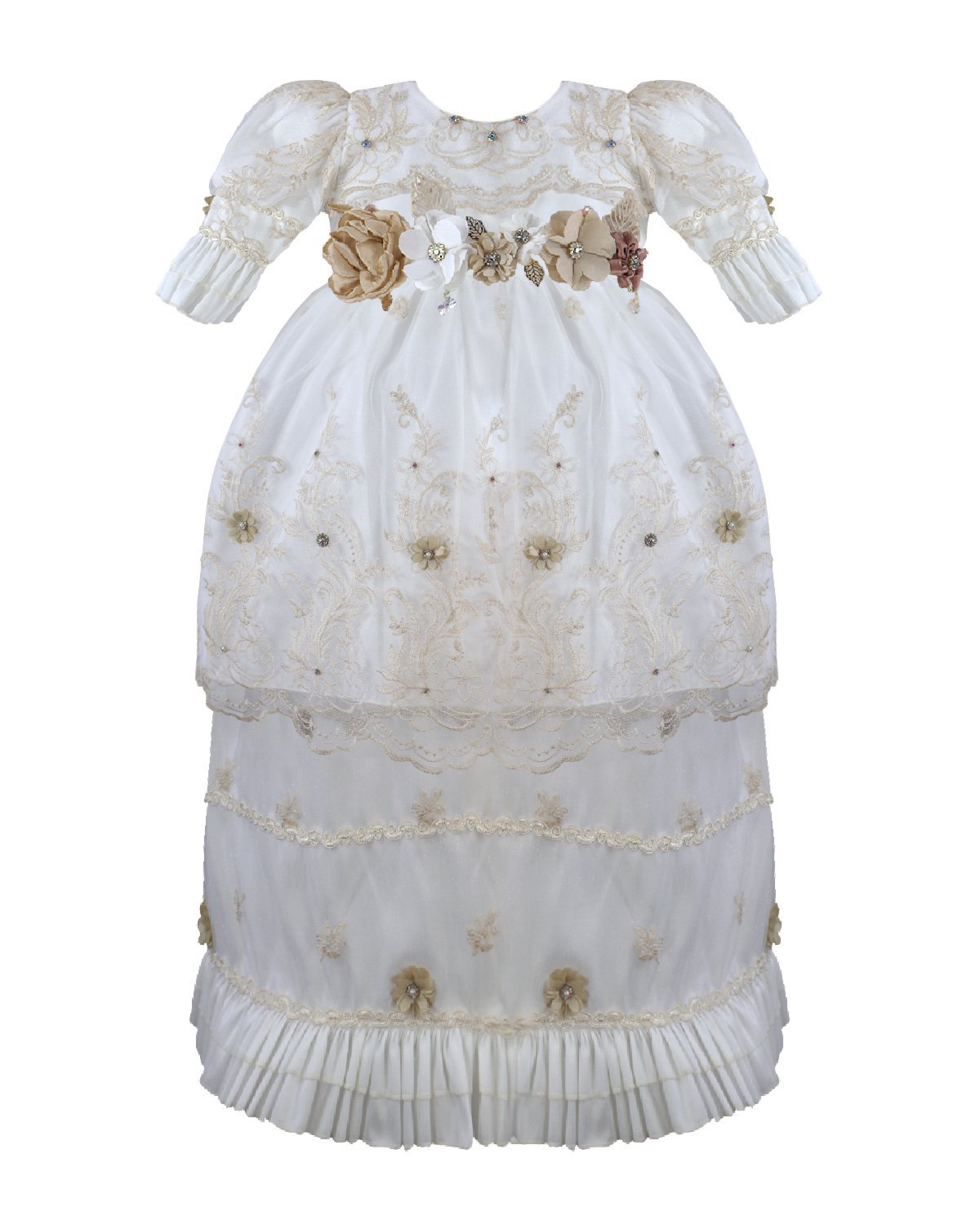 P-128 Style Baptism Gown with embroidered tulle, double-layer skirt, raised floral applications, 3D floral sash with crystal accents, and puffed long sleeves.