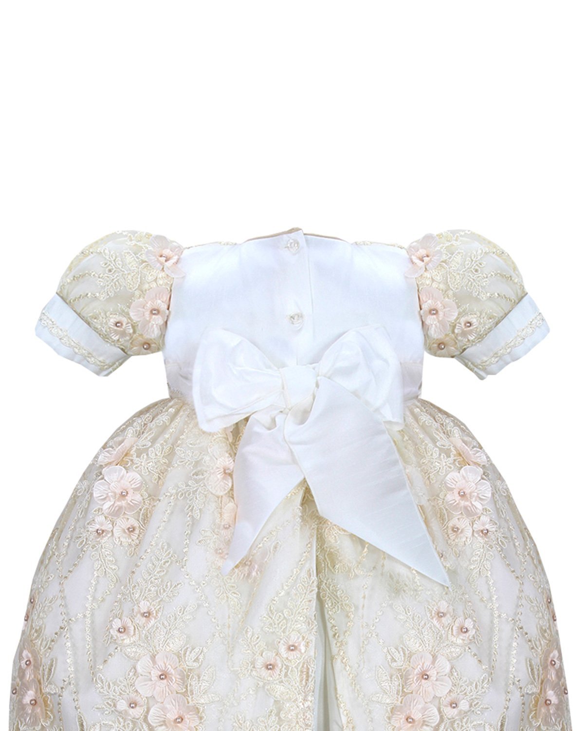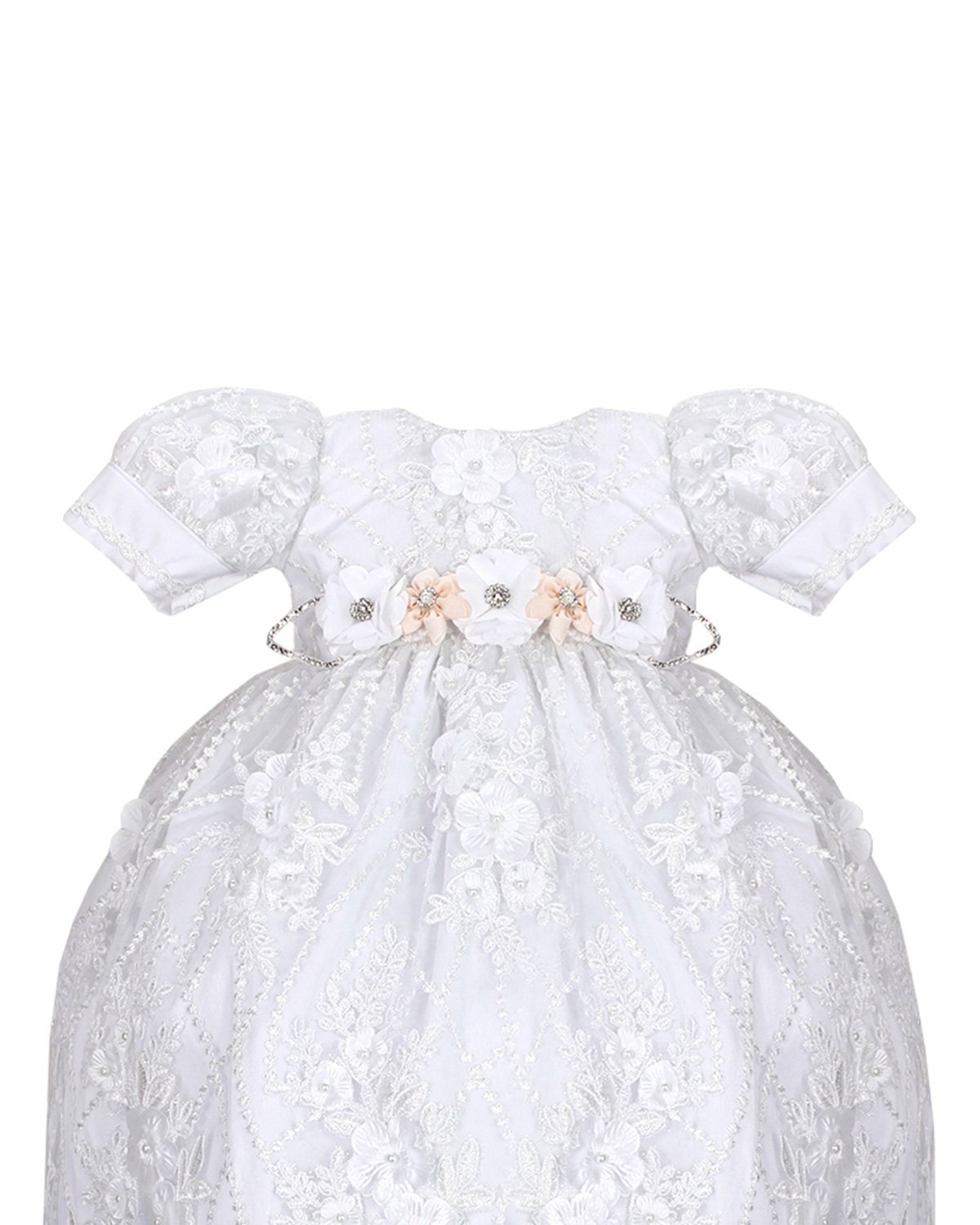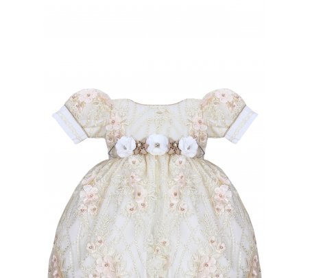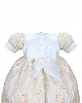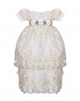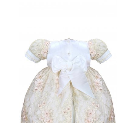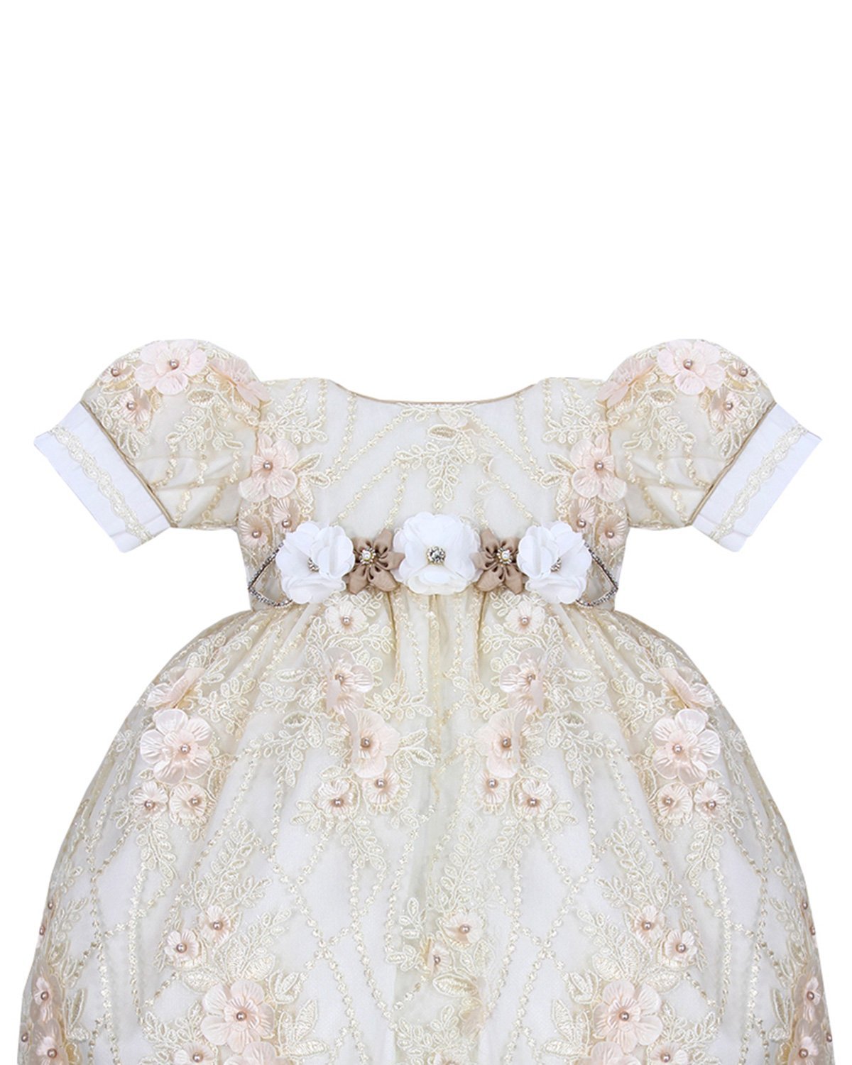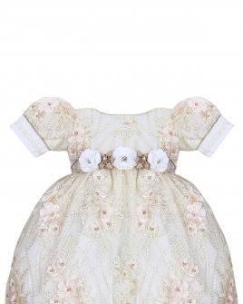 Discover the elegance and charm of the christening gown for girls from the exclusive Maylin brand. Made with delicate lining and embroidered floral print and 3D flower appliqué, this dress stands out for its elegant tones and princess-style sleeves, creating a sophisticated and adorable look for the special day of your baptism.