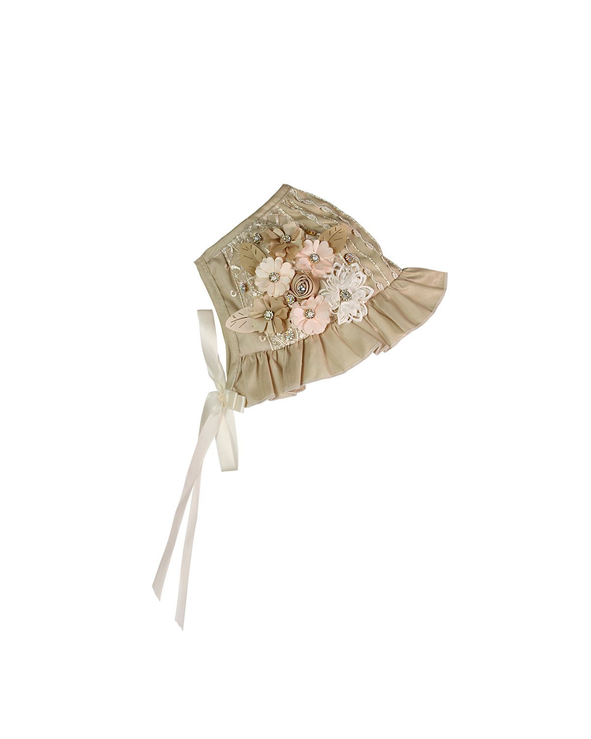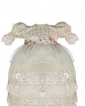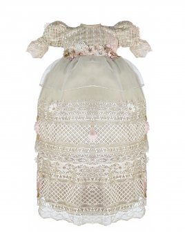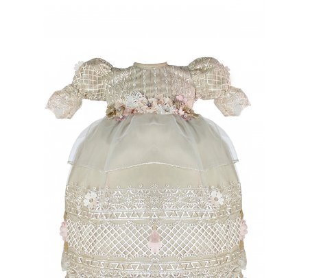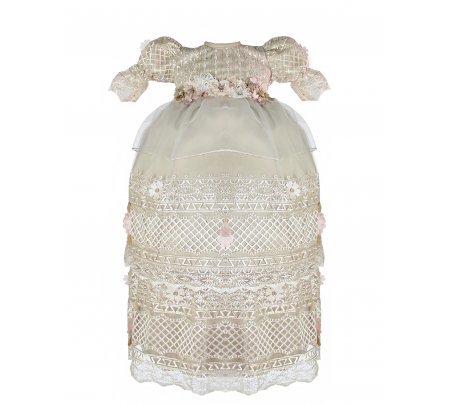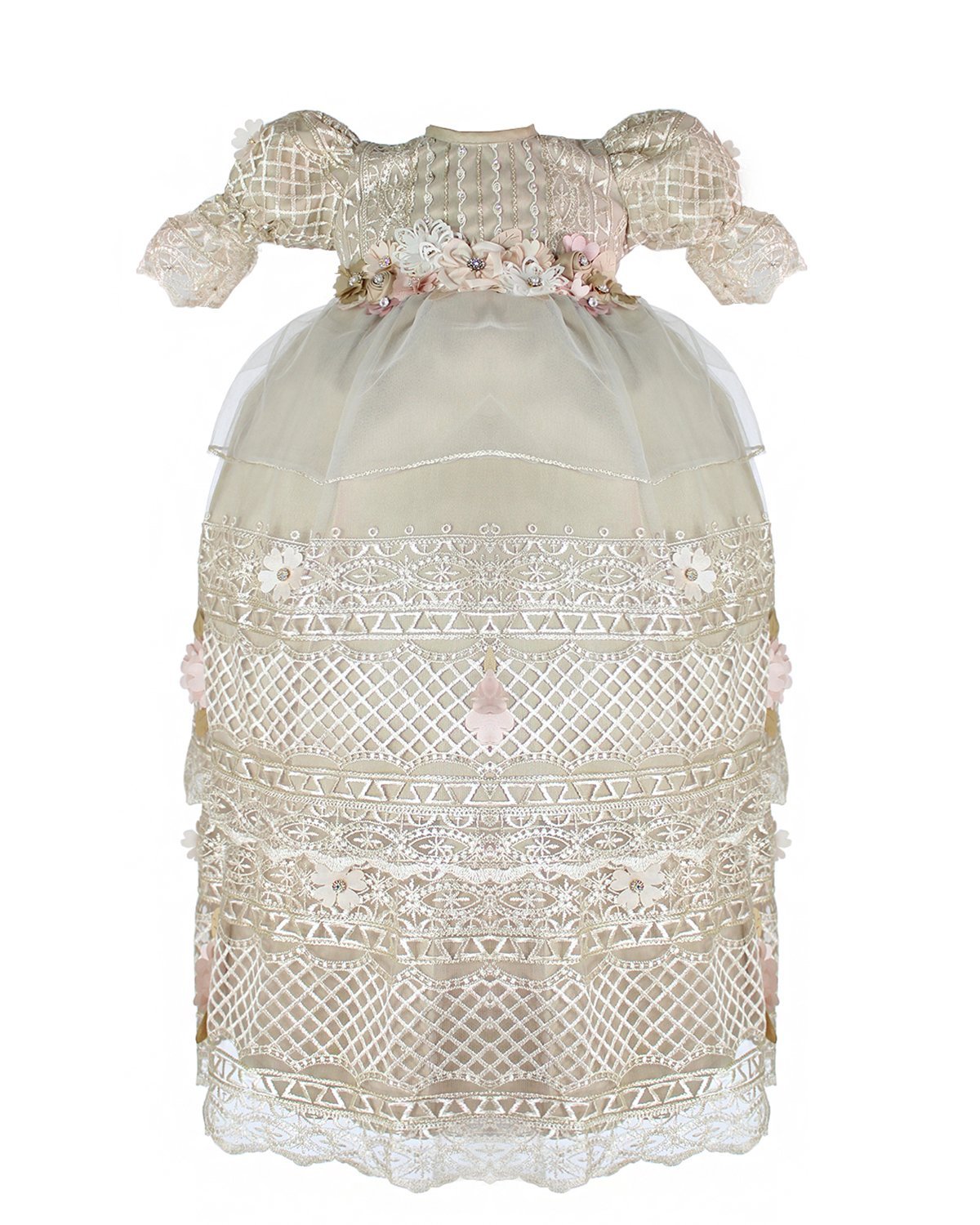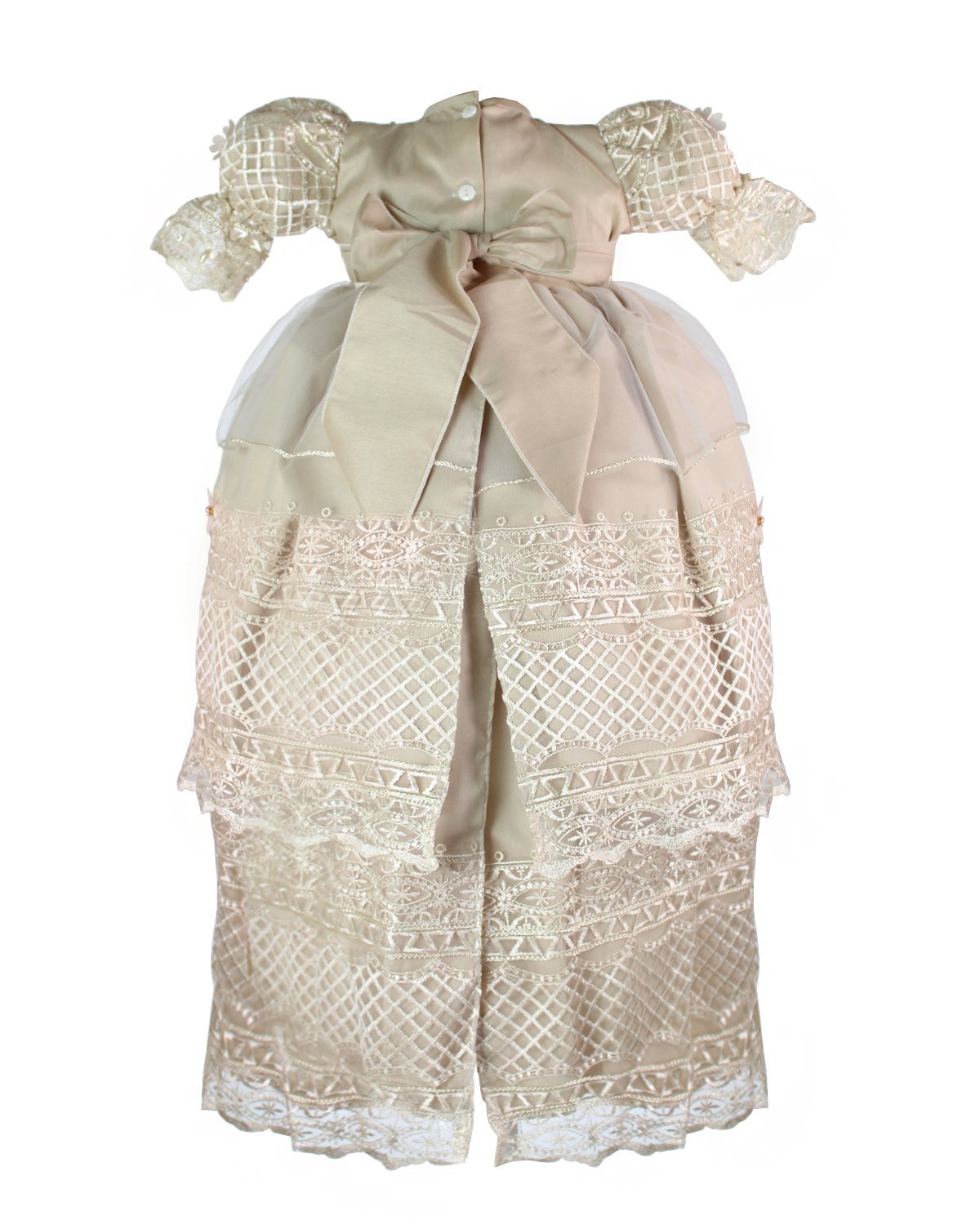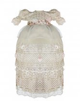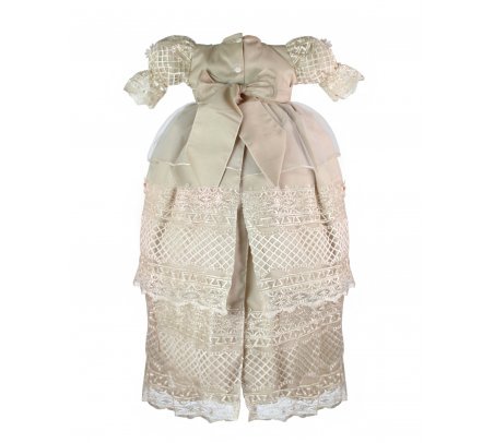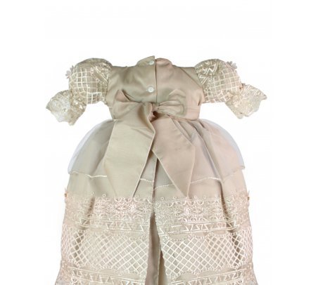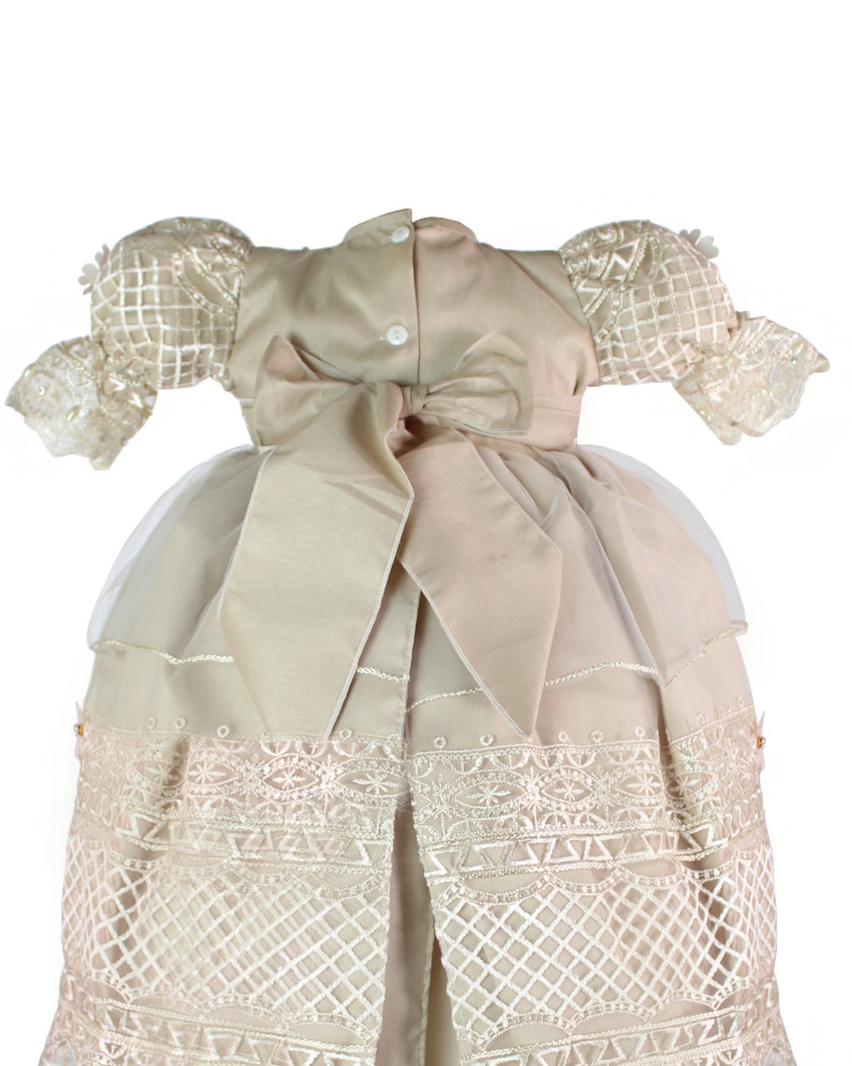 Christening gown for a girl made of shantung, lace and guipure, adorned with pearls on the front of the blouse. Exclusive Maylin brand.