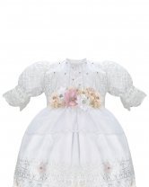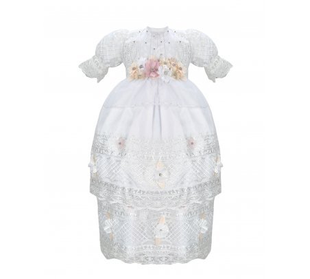 Christening gown for a girl made of shantung, lace and guipure, adorned with pearls on the front of the blouse. Exclusive Maylin brand.