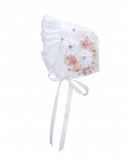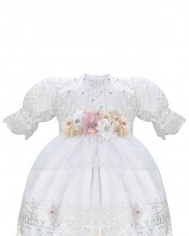 This impressive baptism gown for a girl is made with shantung, lace and guipure, creating a perfect combination of textures and elegance. The front of the blouse is embellished with delicate pearls that complement its design. This robe is from our only brand Maylin, which guarantees its quality and exclusivity.