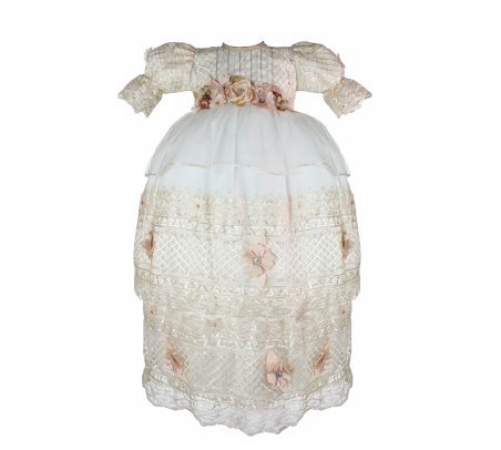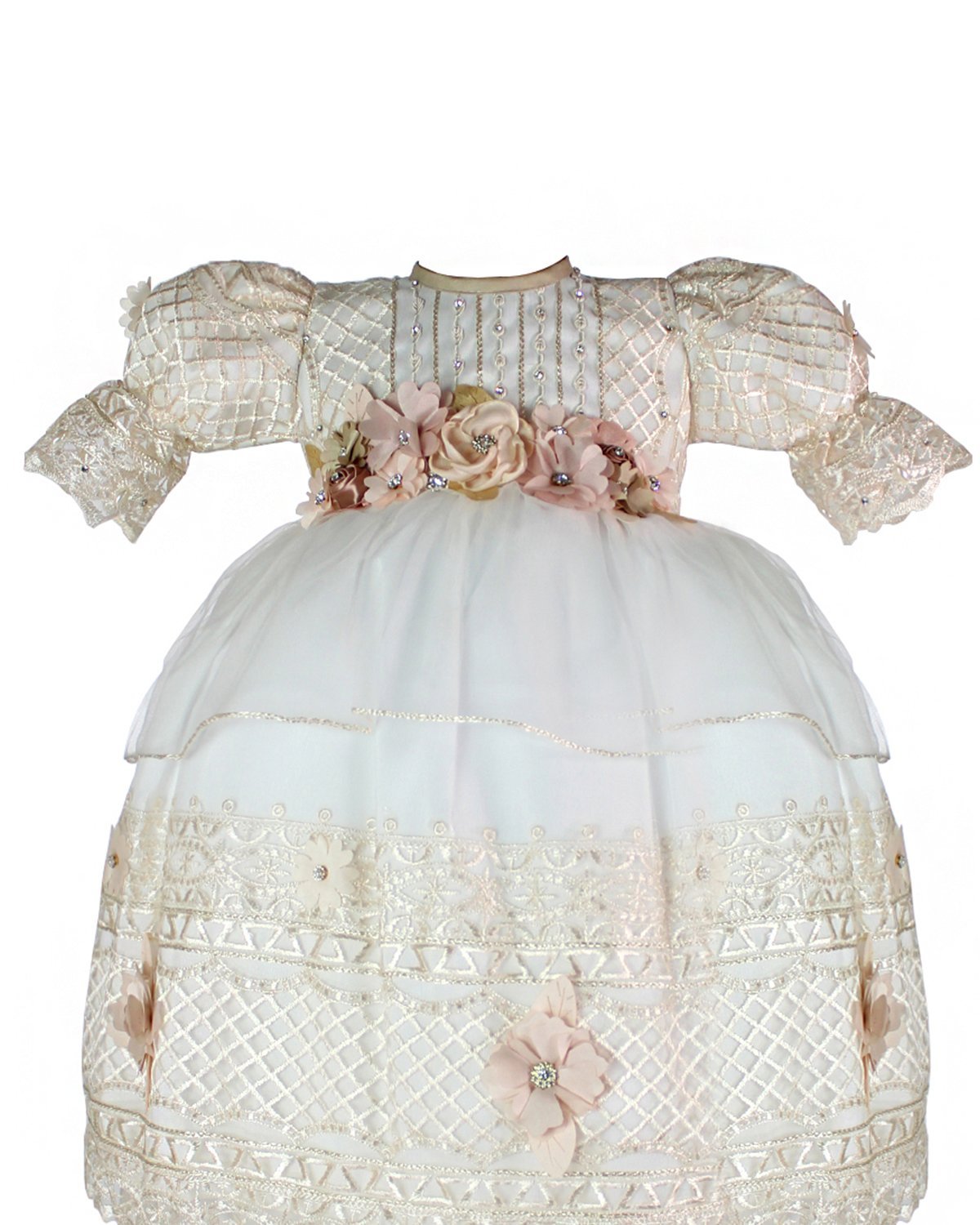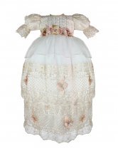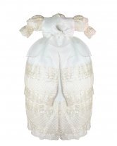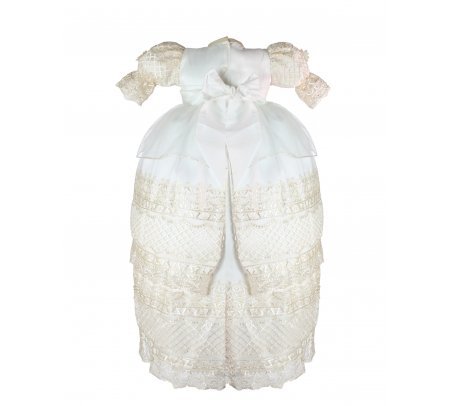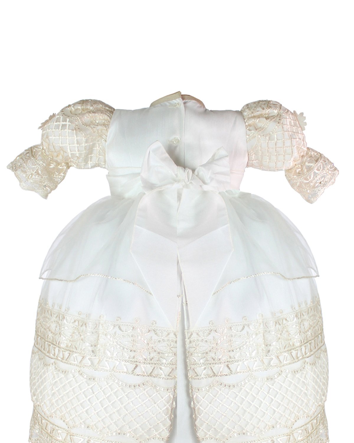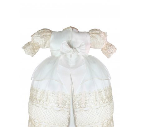 Christening gown for a girl made of shantung, lace and guipure, adorned with pearls on the front of the blouse. Exclusive Maylin brand.