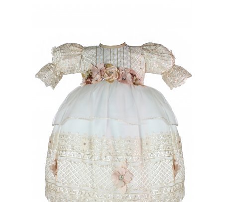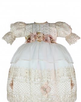 This impressive baptism gown for a girl is made with shantung, lace and guipure, creating a perfect combination of textures and elegance. The front of the blouse is embellished with delicate pearls that complement its design. This robe is from our only brand Maylin, which guarantees its quality and exclusivity.