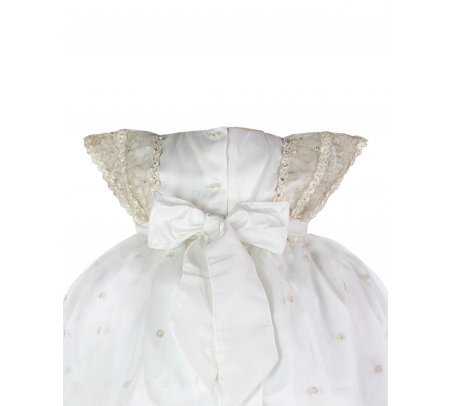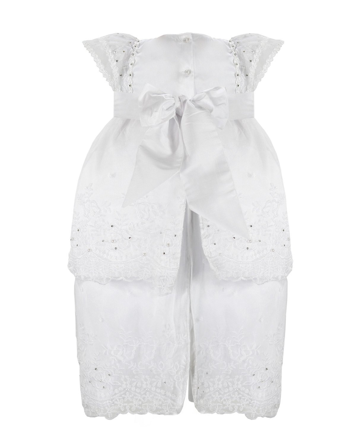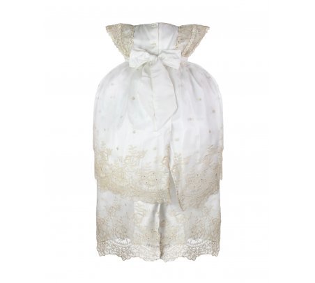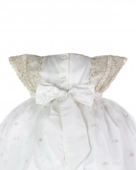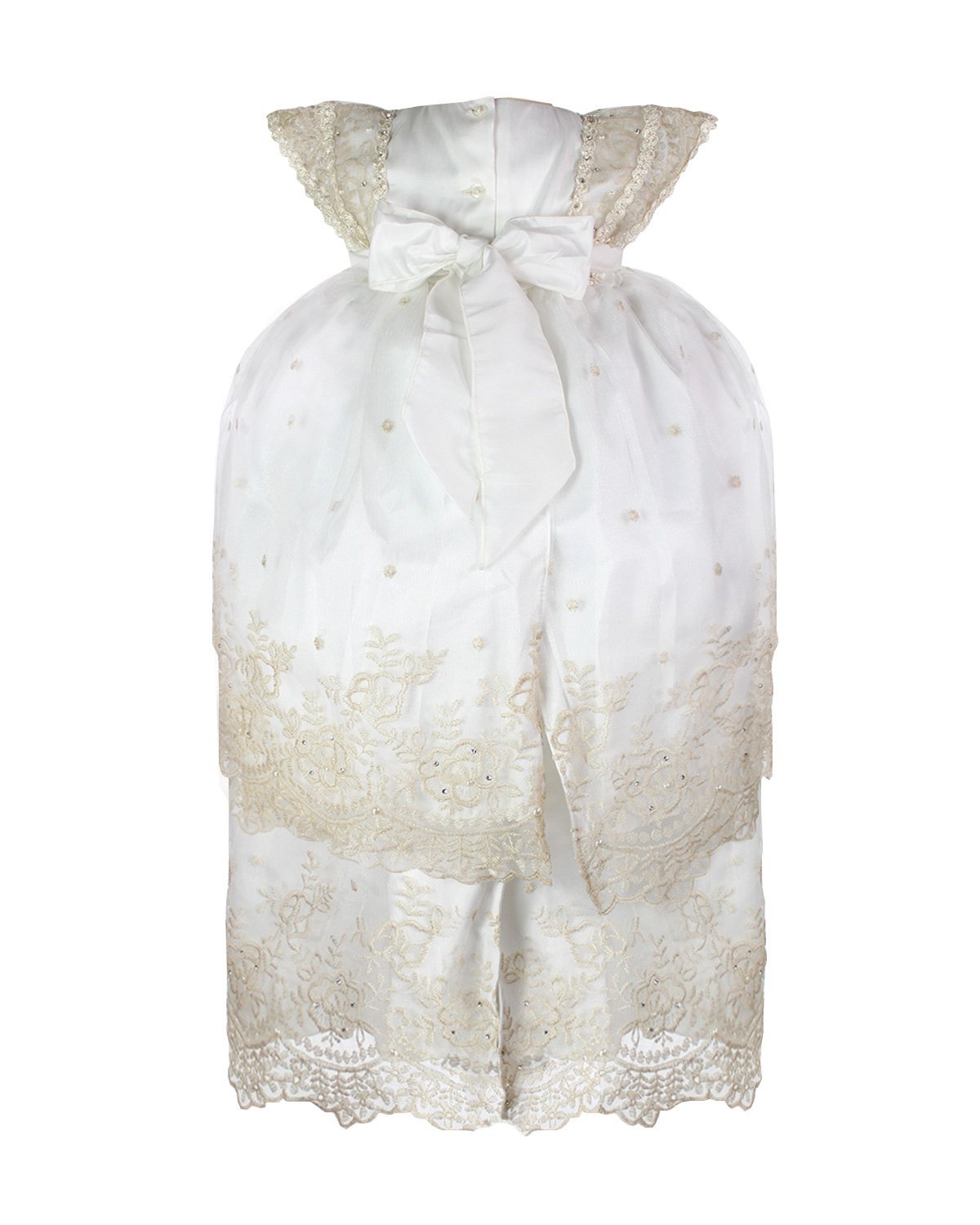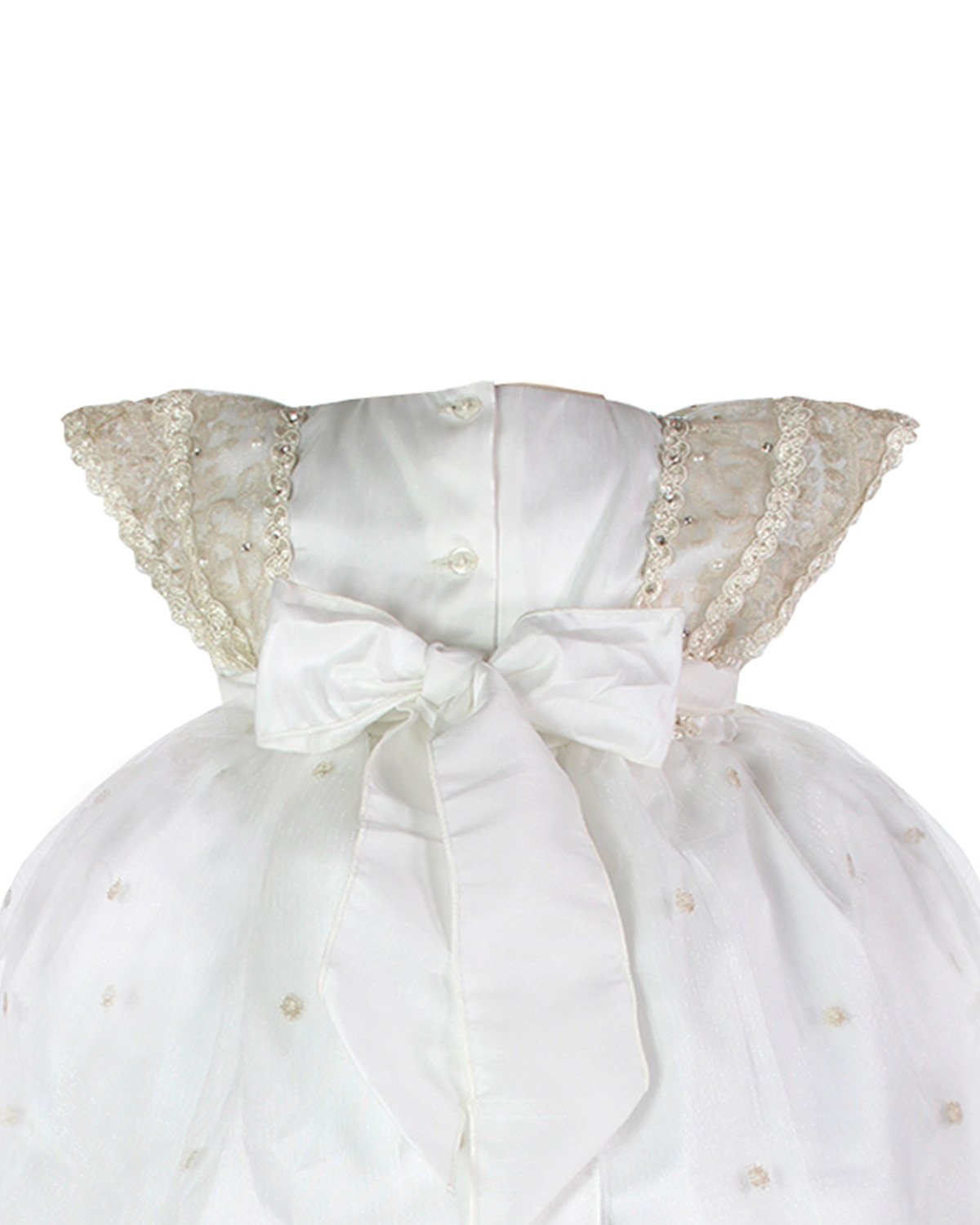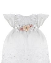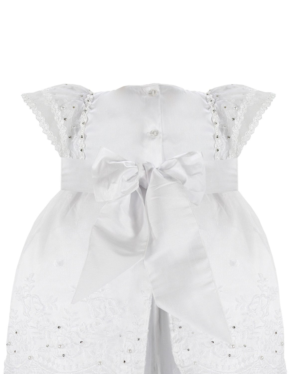 Christening gown for a girl made in shantung with lace sleeves and beading, frontal decoration in soft colors. Exclusive Maylin brand.