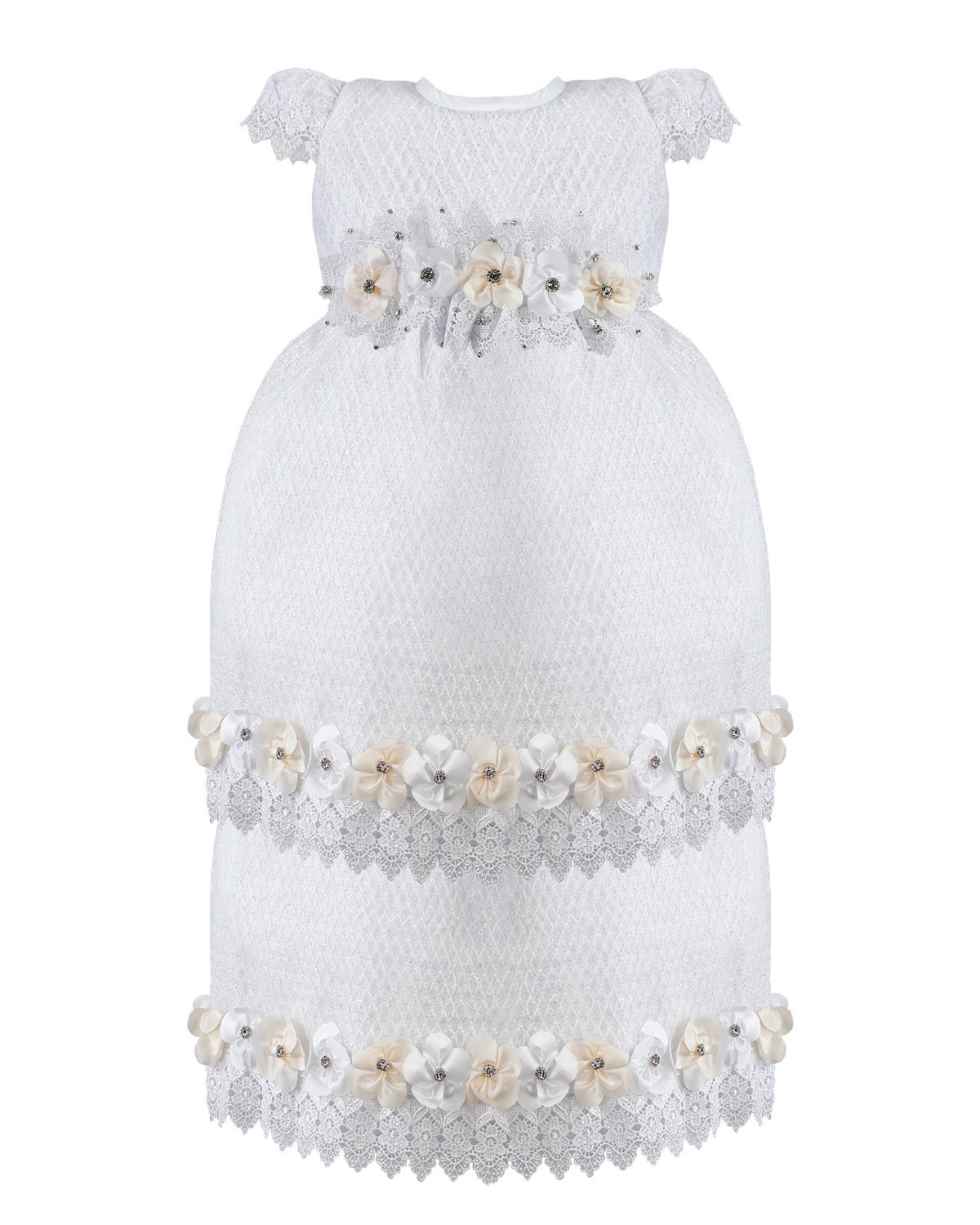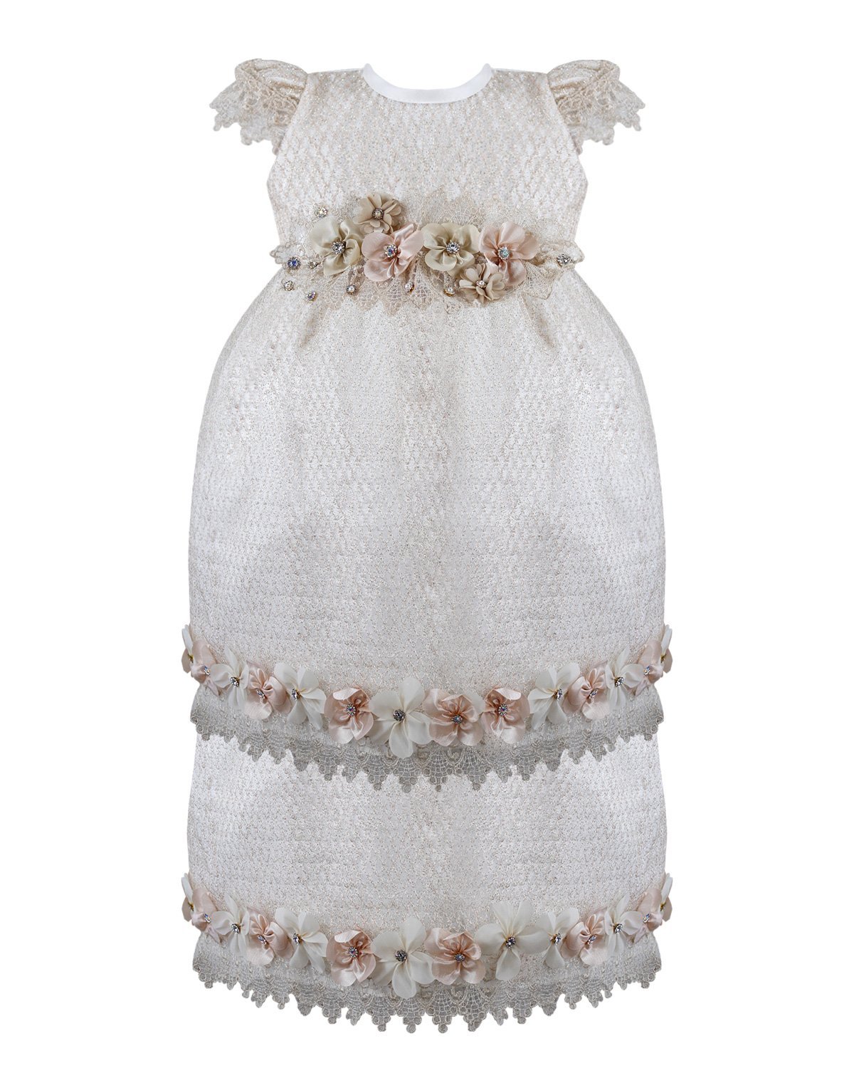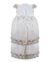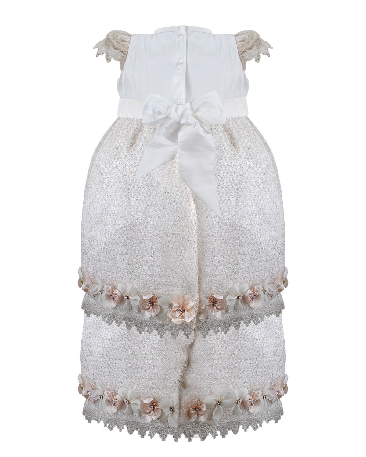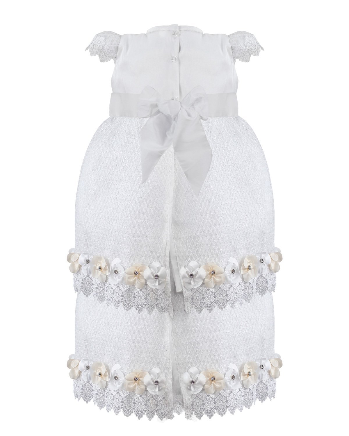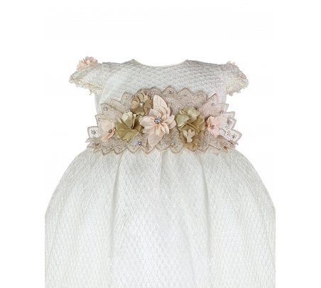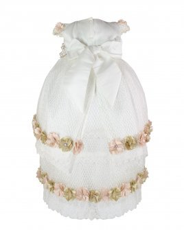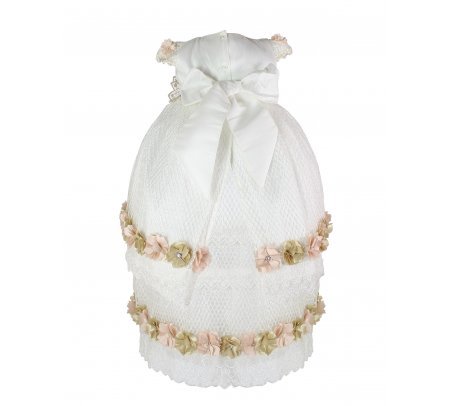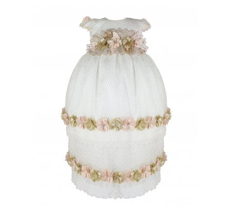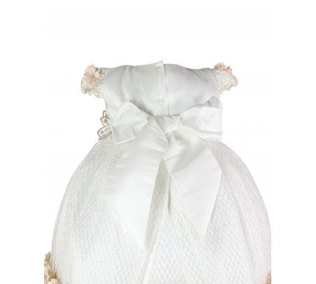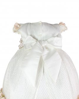 This baptism gown for a girl is a perfect choice for such a special day. Made of high-quality shantung and with unique lace details that add an elegant touch to the design, this dress is embellished with two layers of soft-toned flowers, making it truly unique. The Maylin brand made sure that every detail was perfect to make this christening gown truly special.