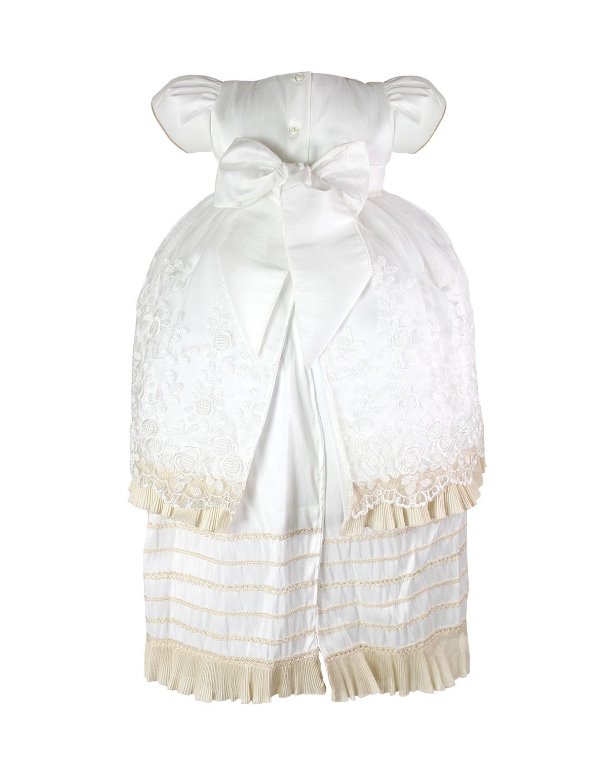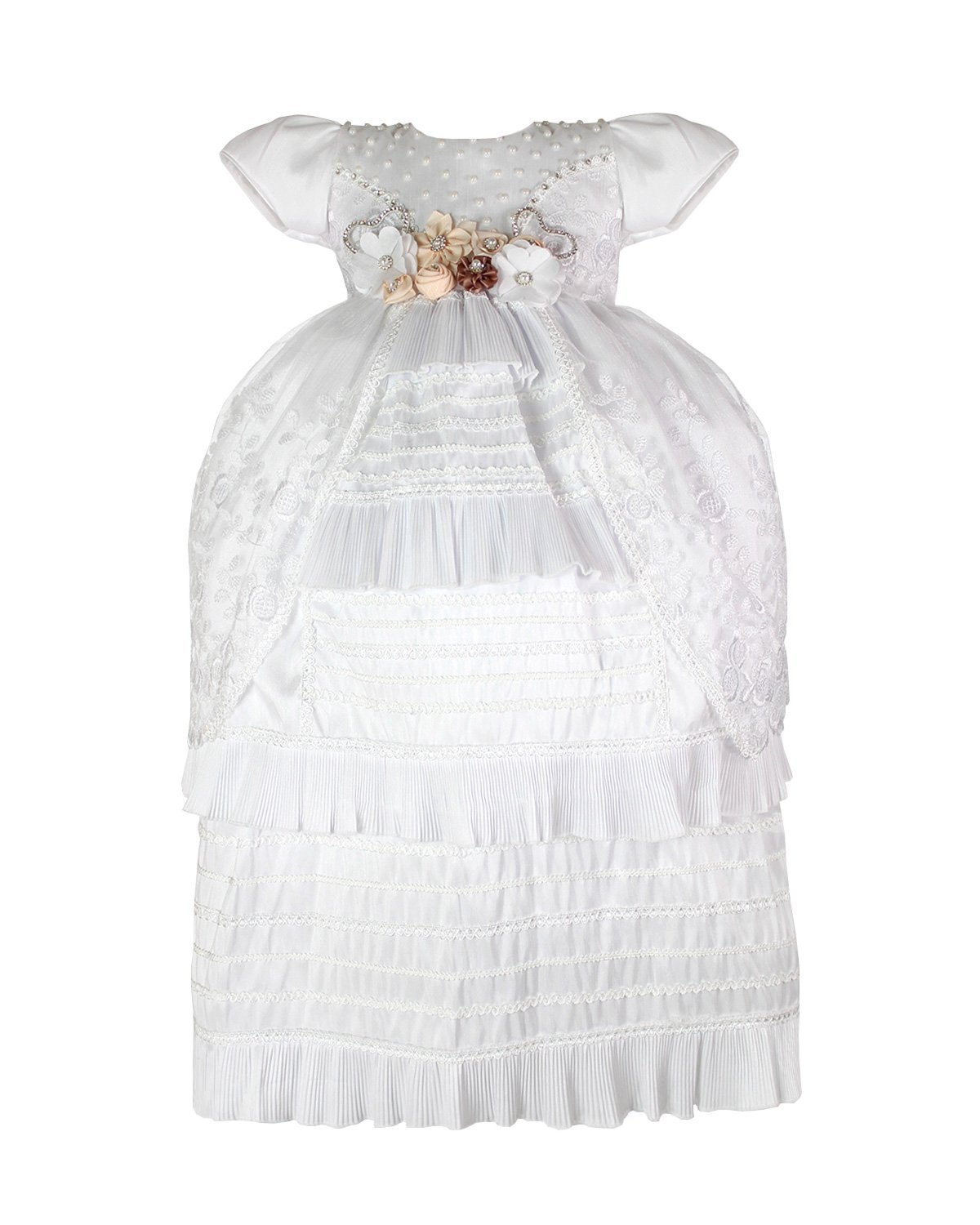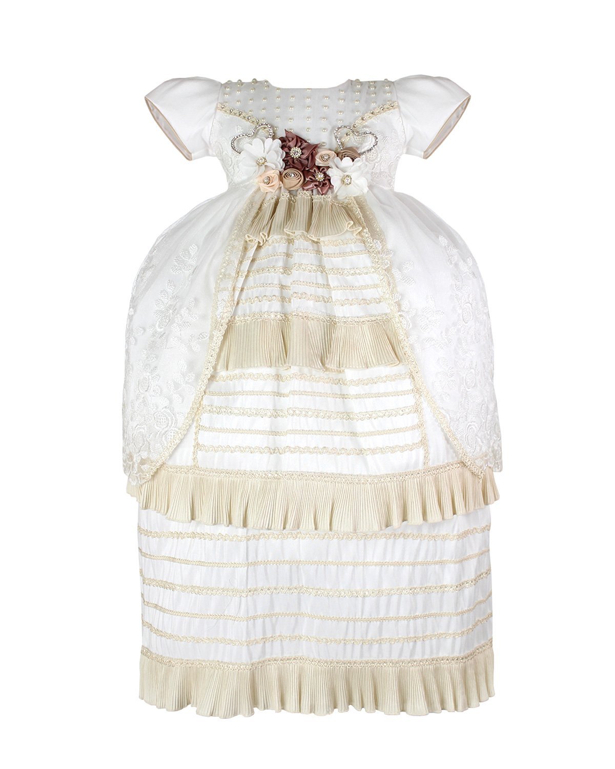 Christening gown for a girl made of shantung, lace and guipure, adorned with pearls on the front of the blouse. Exclusive Maylin brand.