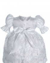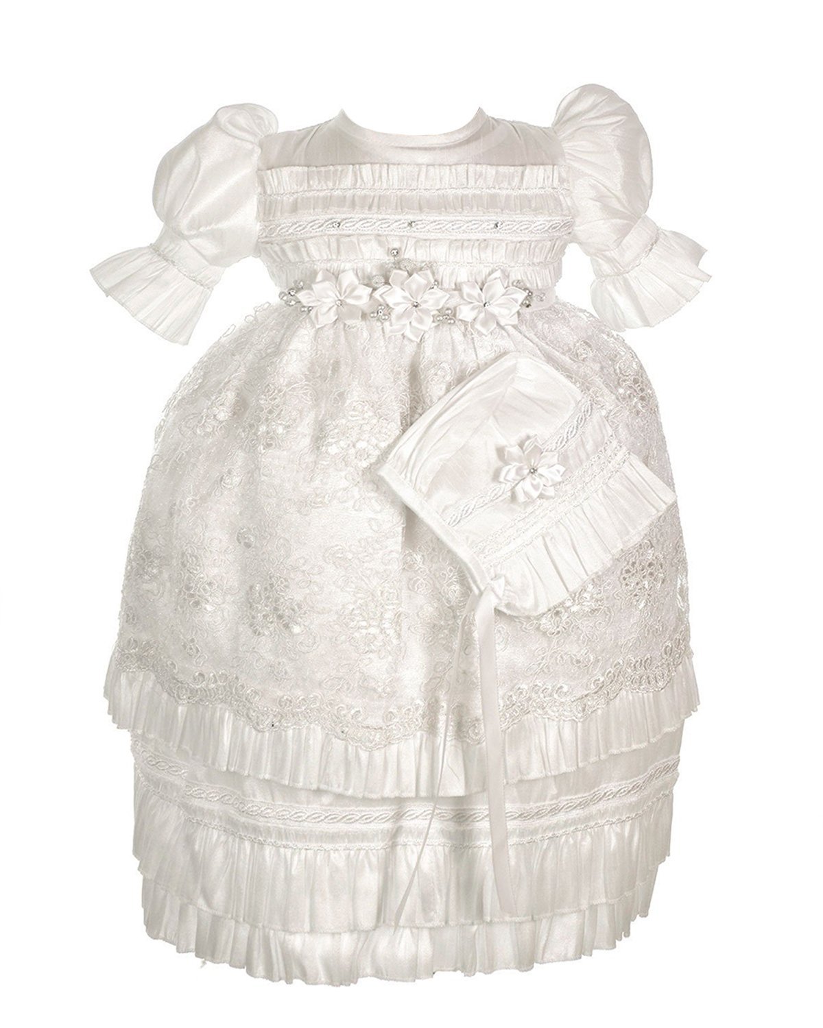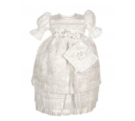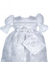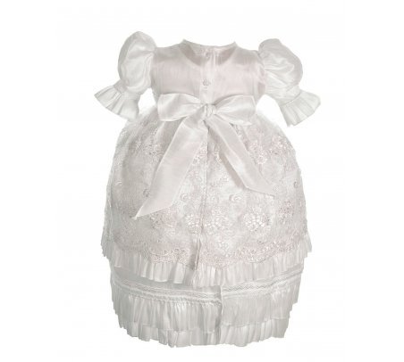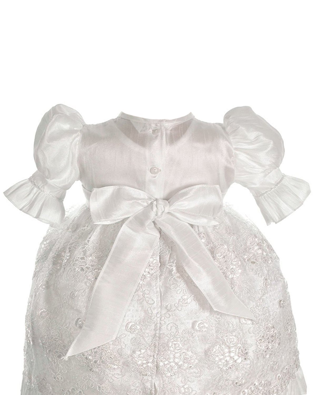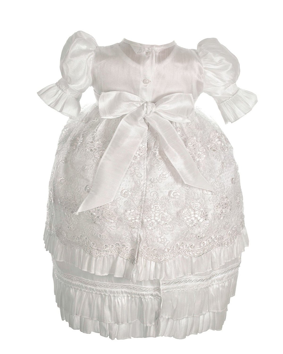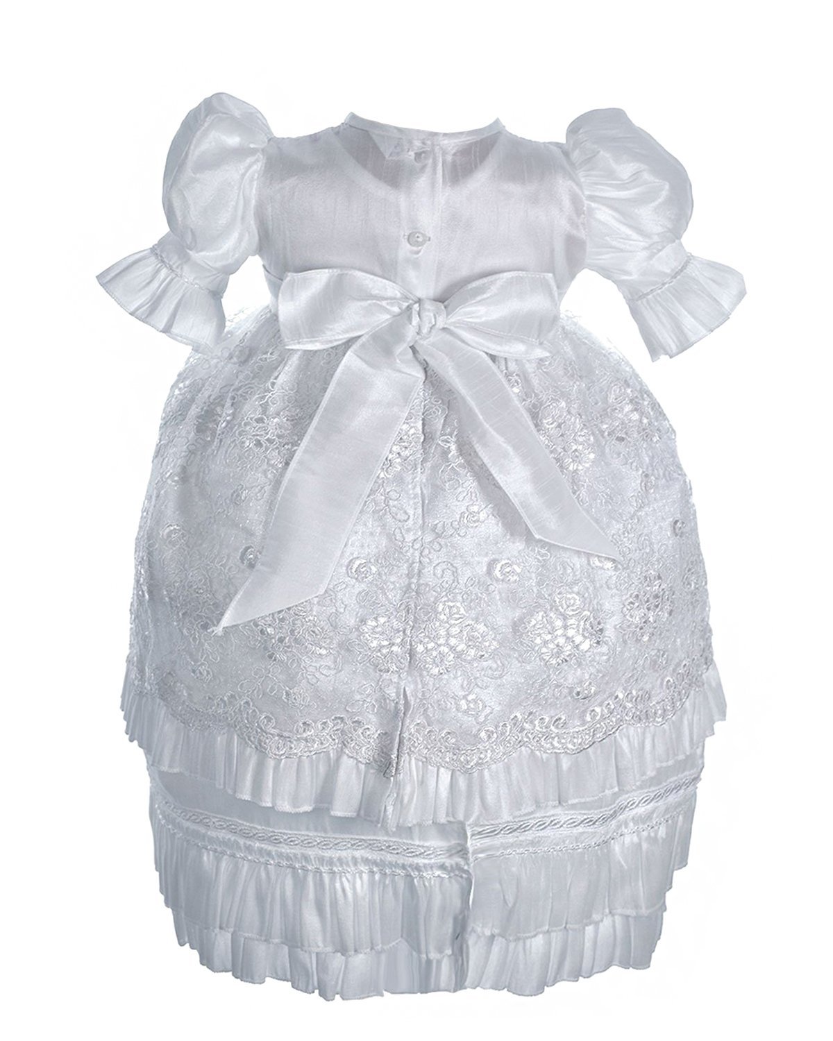 The Maylin Girl's Christening Gown is a dress made of shantung with fine embroidery applications. The design features short sleeves, a long, full skirt with floral embroidery, a round neckline with lace, and ribbon details at the back.
