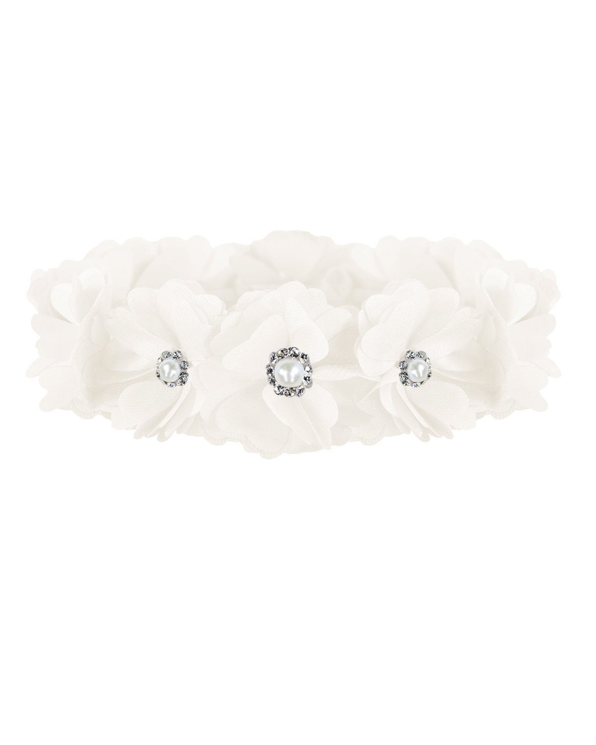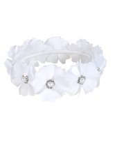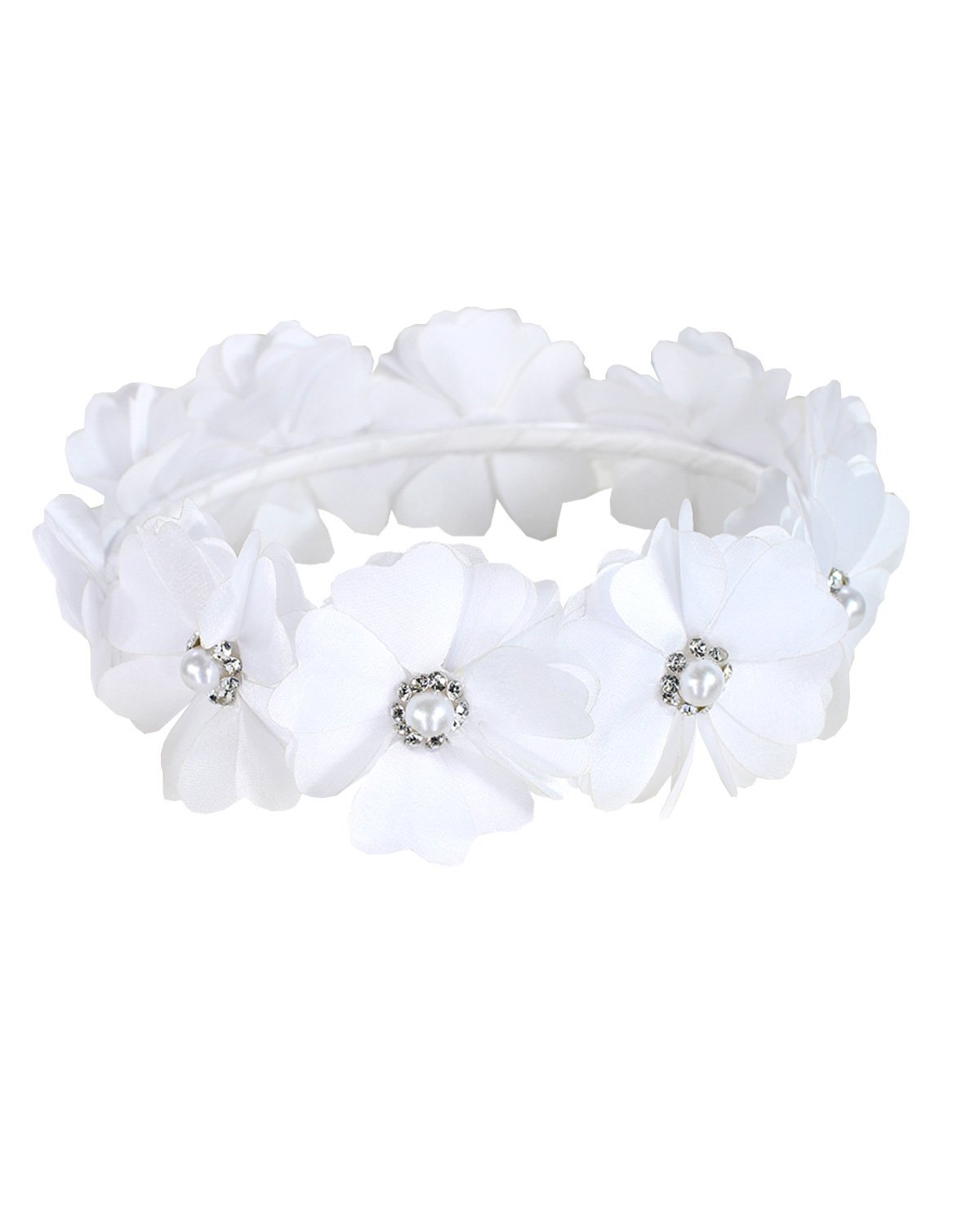 The Taffeta Flower Crown is an elegant and delicate piece crafted from laser-cut taffeta fabric. Adorned with cubic zirconia and pearl centers, this crown adds a touch of sparkle and sophistication to any special occasion.