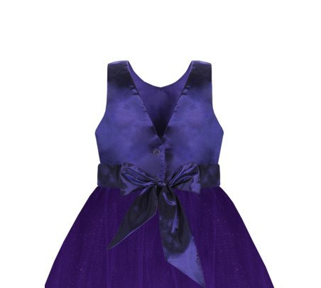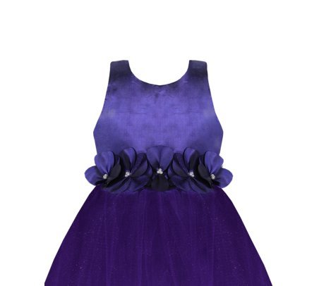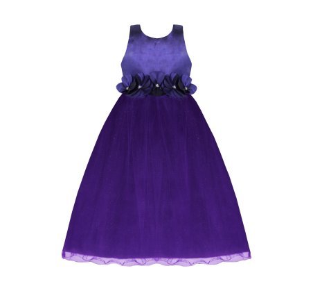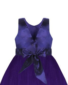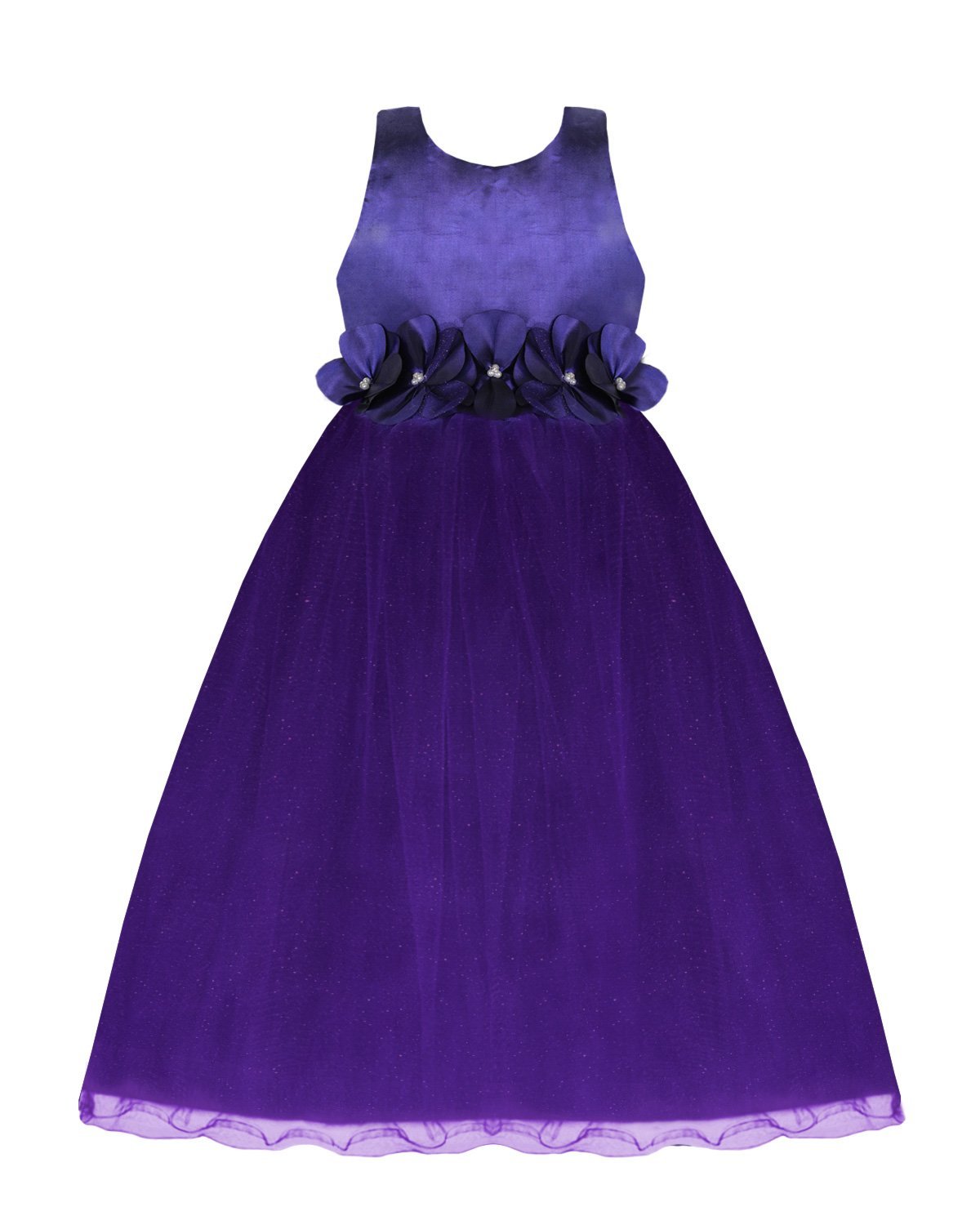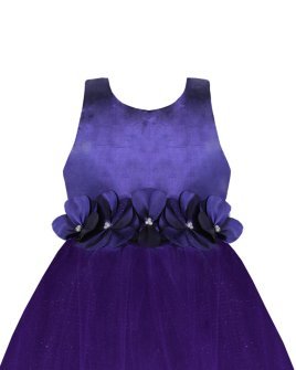 100% polyester dress, sleeveless, back neckline and bundle of flowers with pearls.