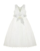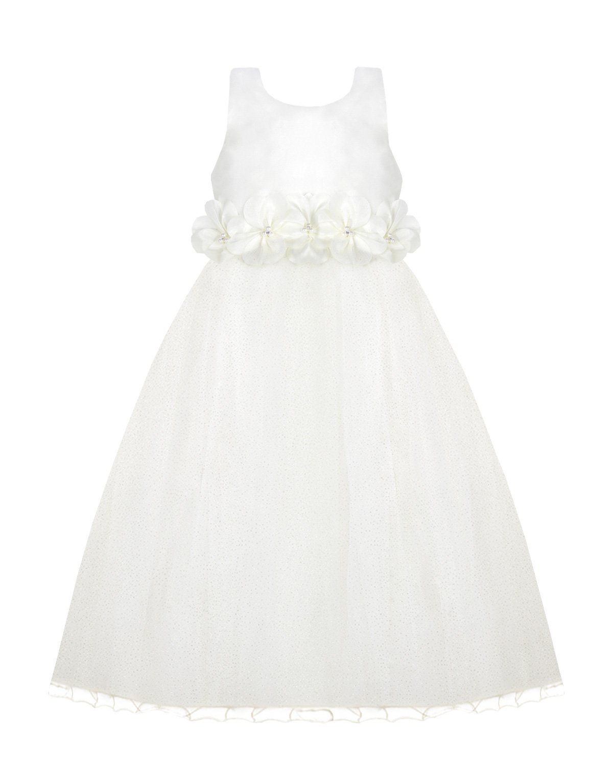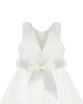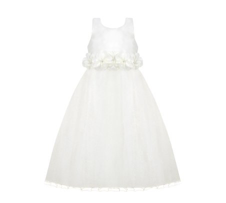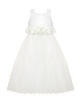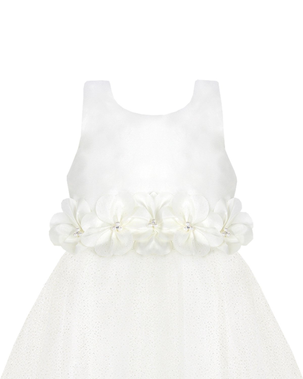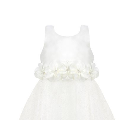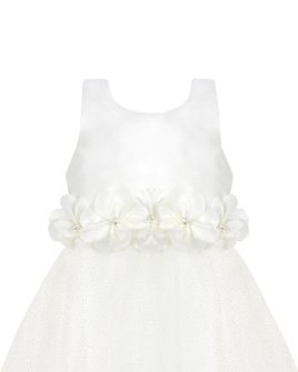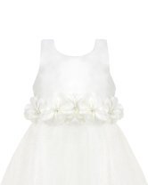 100% polyester dress, sleeveless, back neckline and bundle of flowers with pearls.