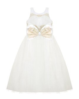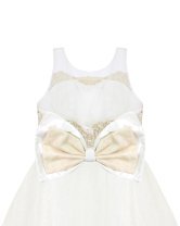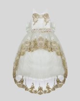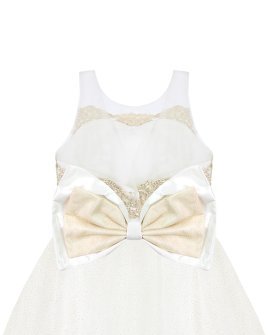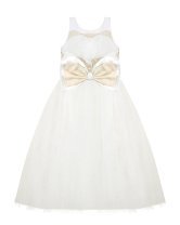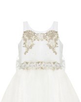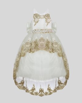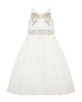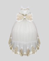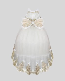 Elegant girl's dress with sequin embroidery, 3D flower details with crystal beading, detachable Glittel skirt and Glittel tulle skirt with double bow decoration at the waist.