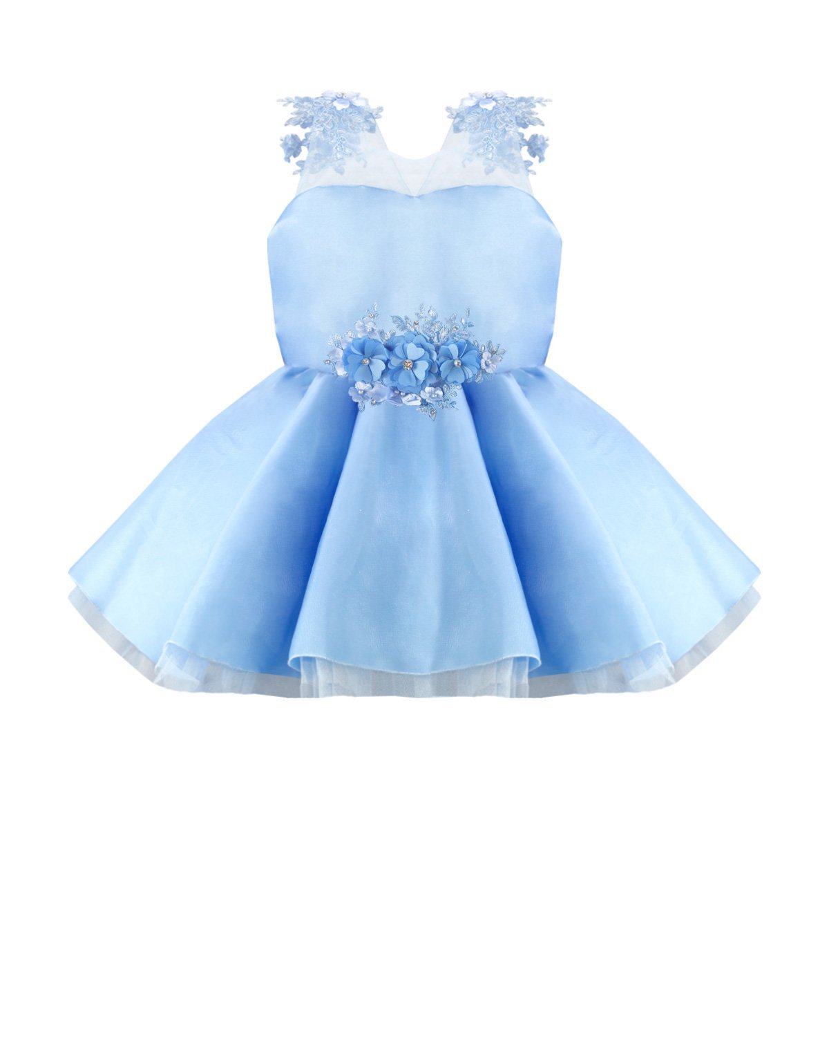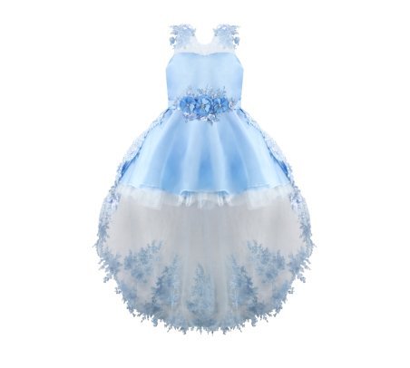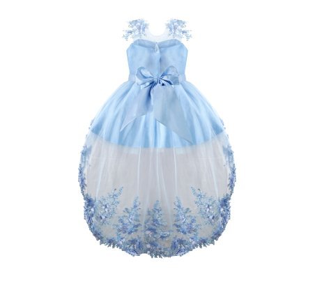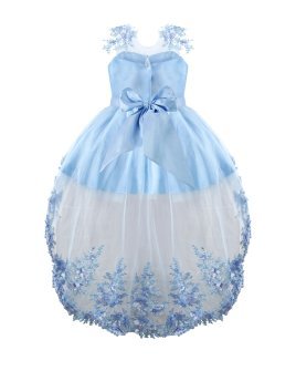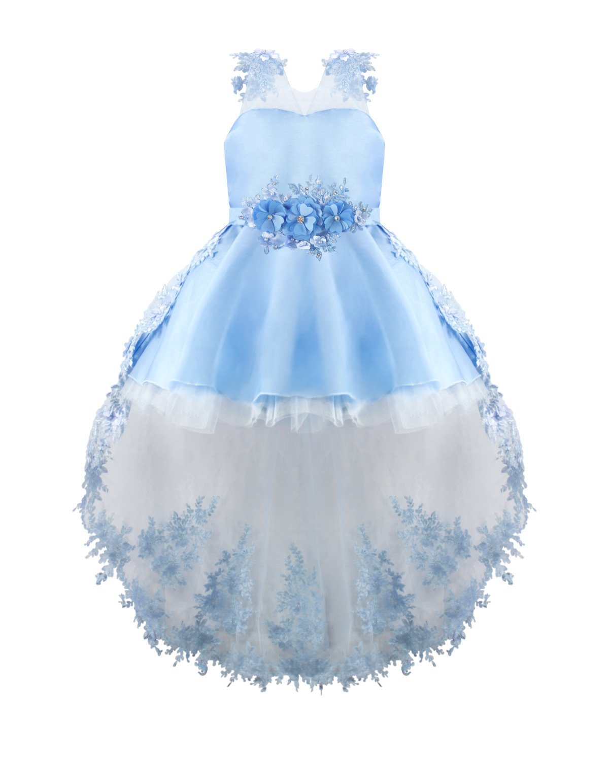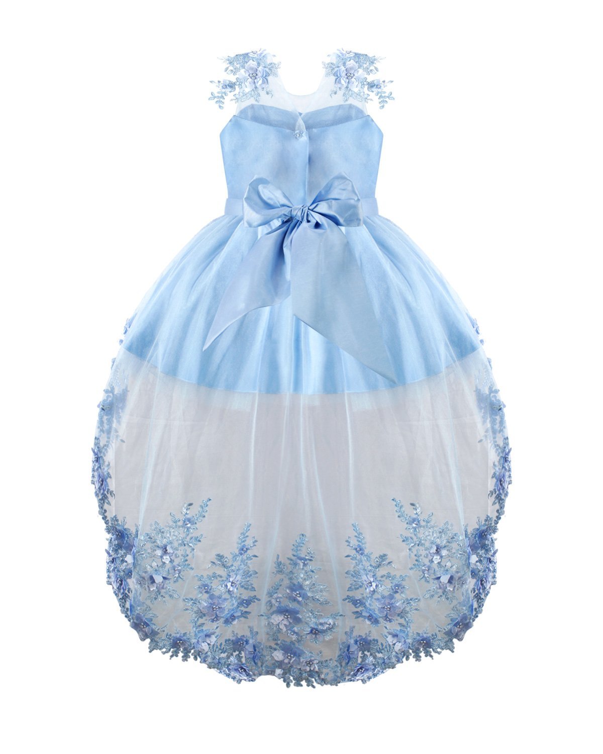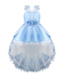 Girl's dress elegant short tulle and taffeta skirt with appliqués of embroidered flowers with a 3D finish, pearls and crystal stones with detachable tail and embroidery designs.