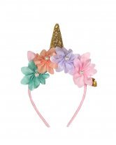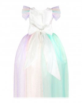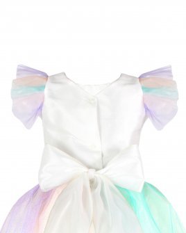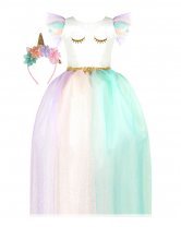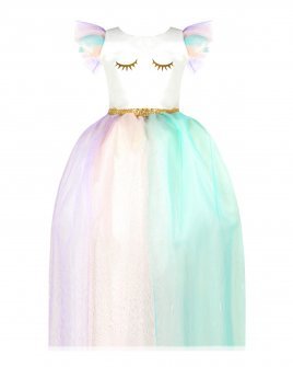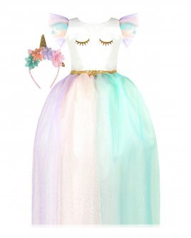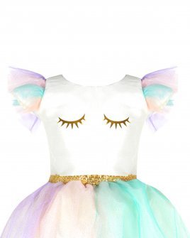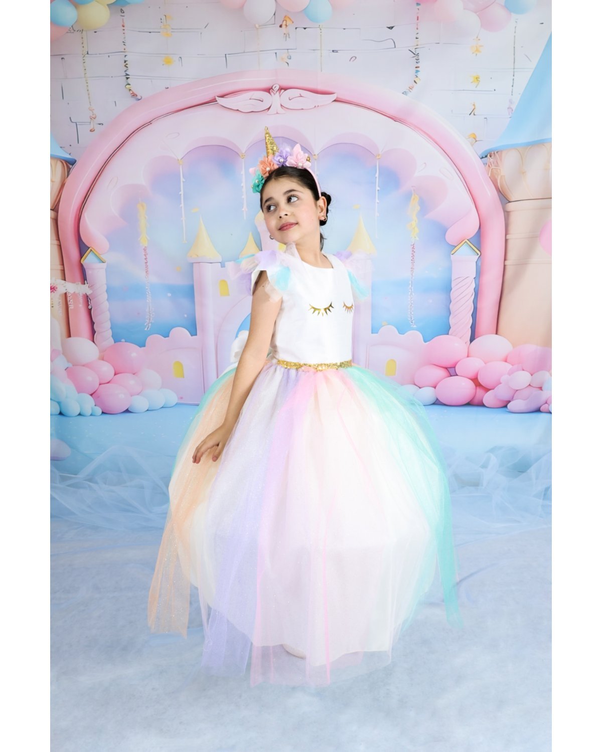 Unicorn costume for girls made of shantung, lining and veil, uniquely designed skirt in tender colors, eyes-print blouse and headband included.