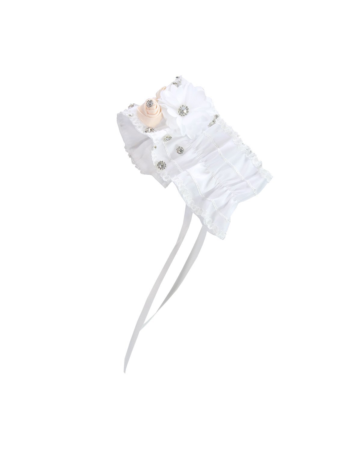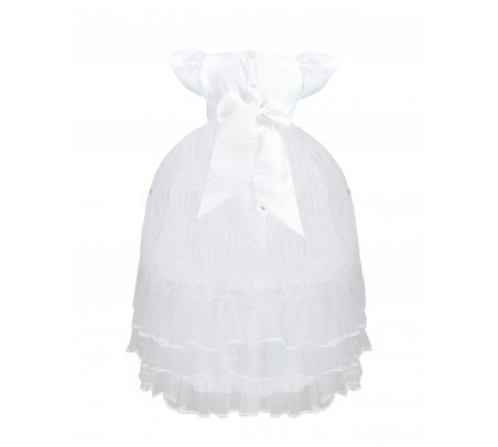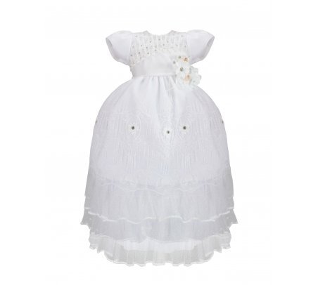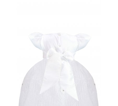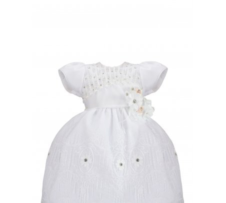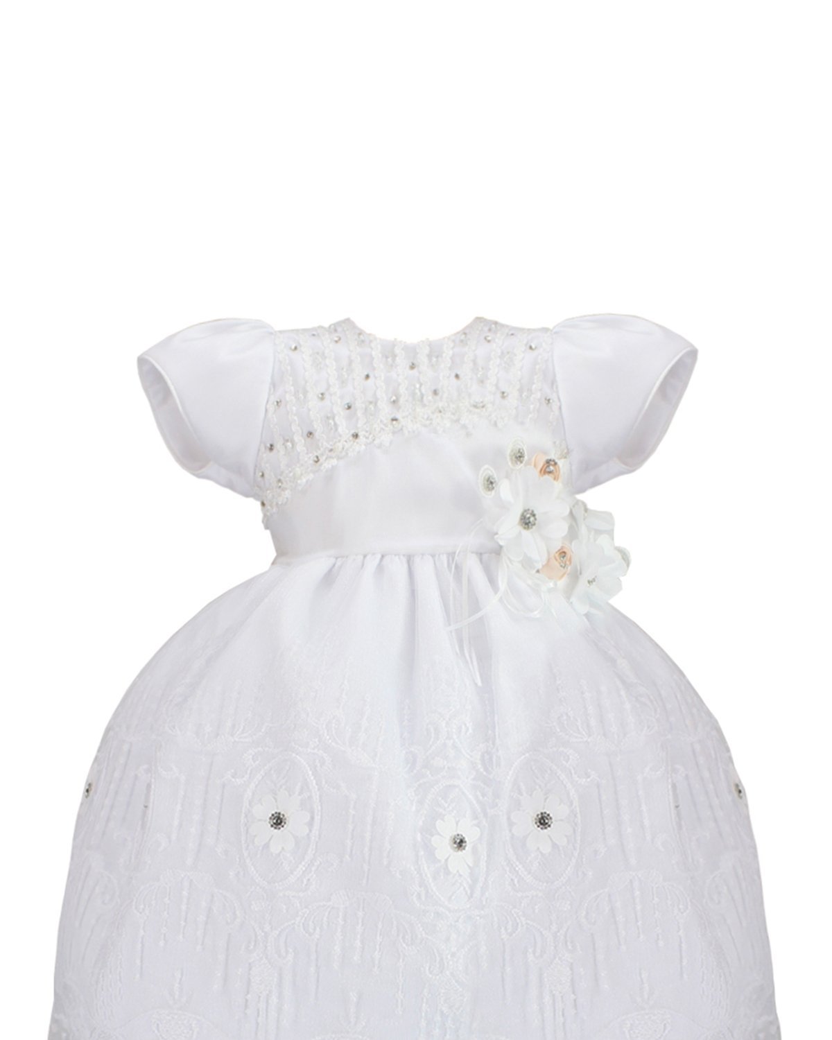 Elevate your little one's christening with the enchanting Maritza Girl's Christening Gown. The blouse, made from shantung fabric, boasts voluminous sleeves and is embellished with delicate pearl and rhinestone embroidery. The skirt, crafted from shantung with an embroidered layer, features stunning 3D flowers with rhinestone centers, along with three ruffles to enhance the skirt's volume.