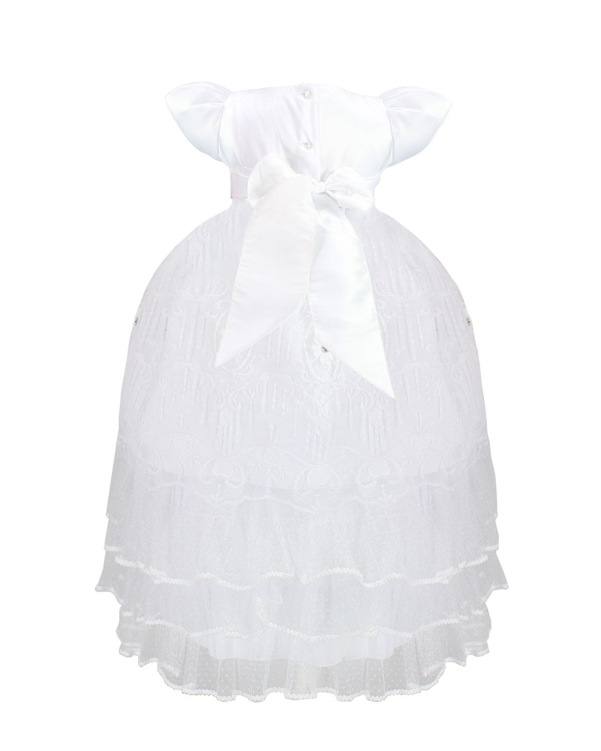 Maritza Girl's Christening Gown, where the blouse is crafted from shantung fabric, featuring voluminous sleeves and adorned with pearl and rhinestone embroidery. The skirt, made of shantung with an embroidered layer, showcases 3D flowers with rhinestone centers, along with a series of three ruffles to add volume to the skirt.