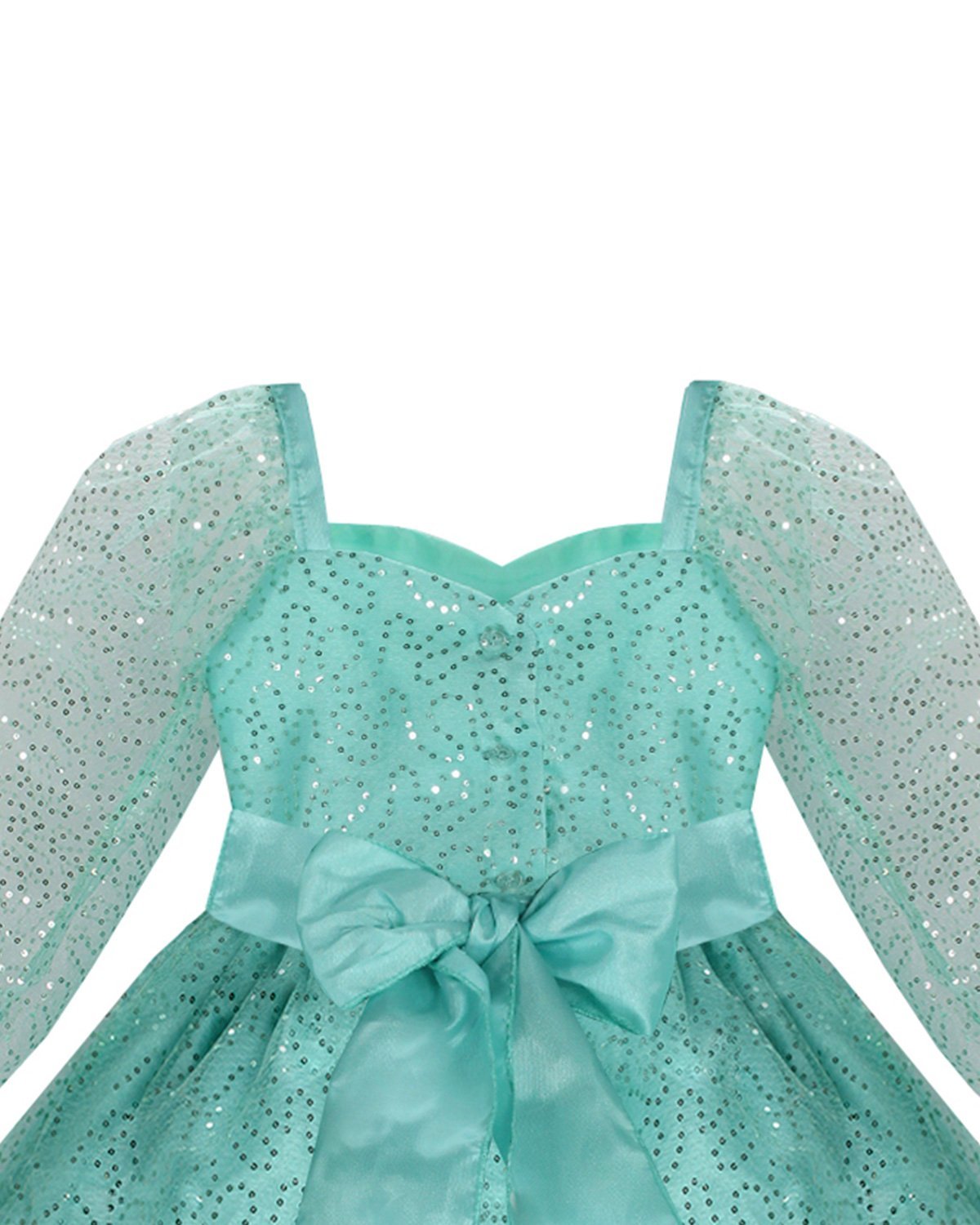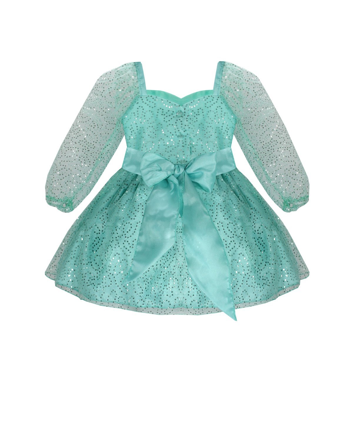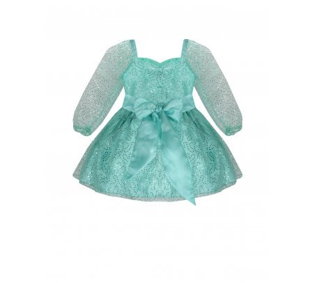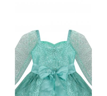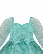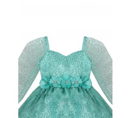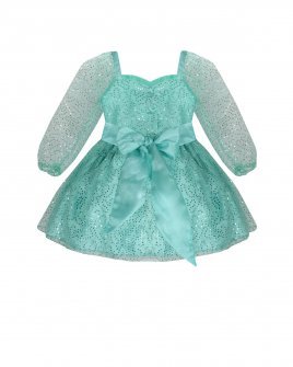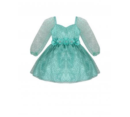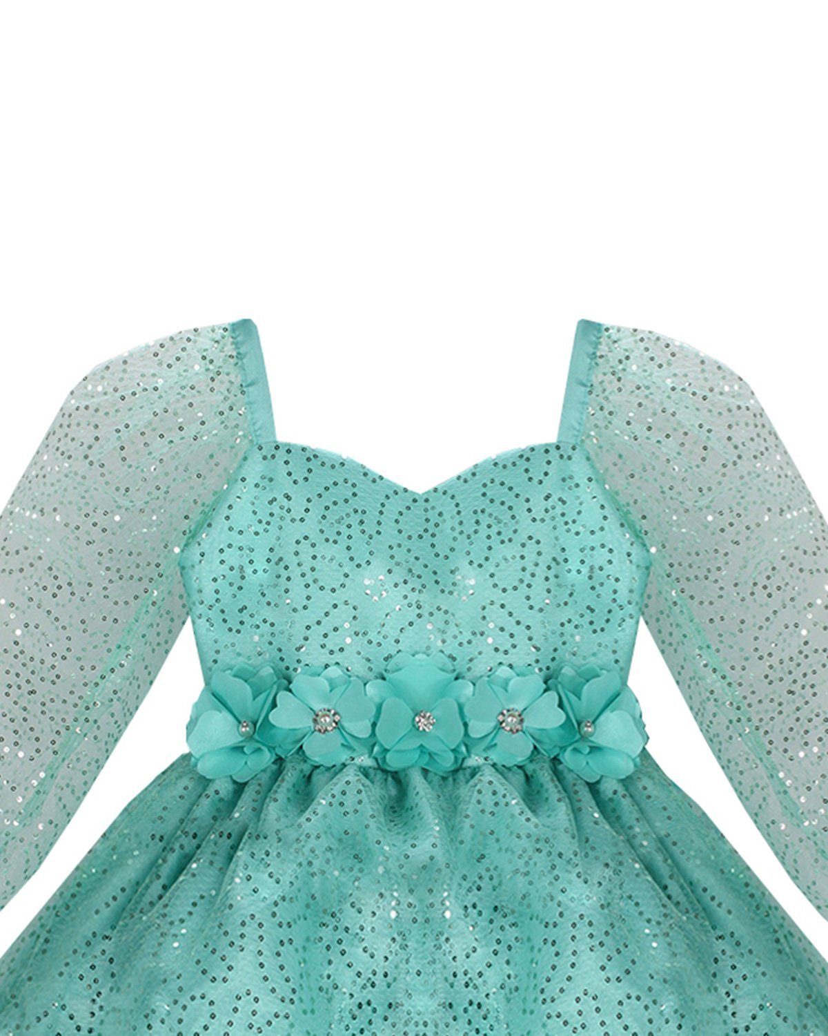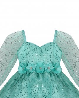 Short dress for girls made of sequin-woven mesh with polyester lining, long sleeves, sweetheart neckline, and 3D flower details.